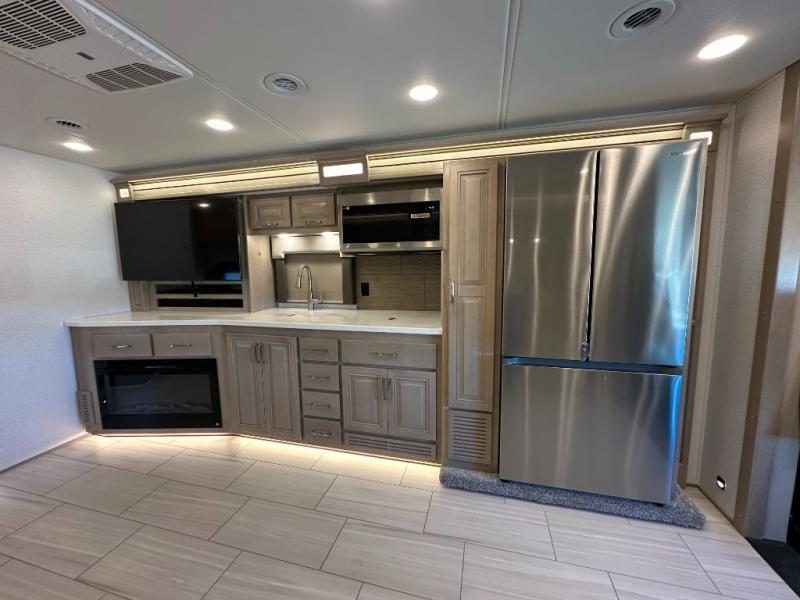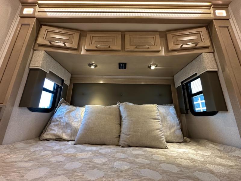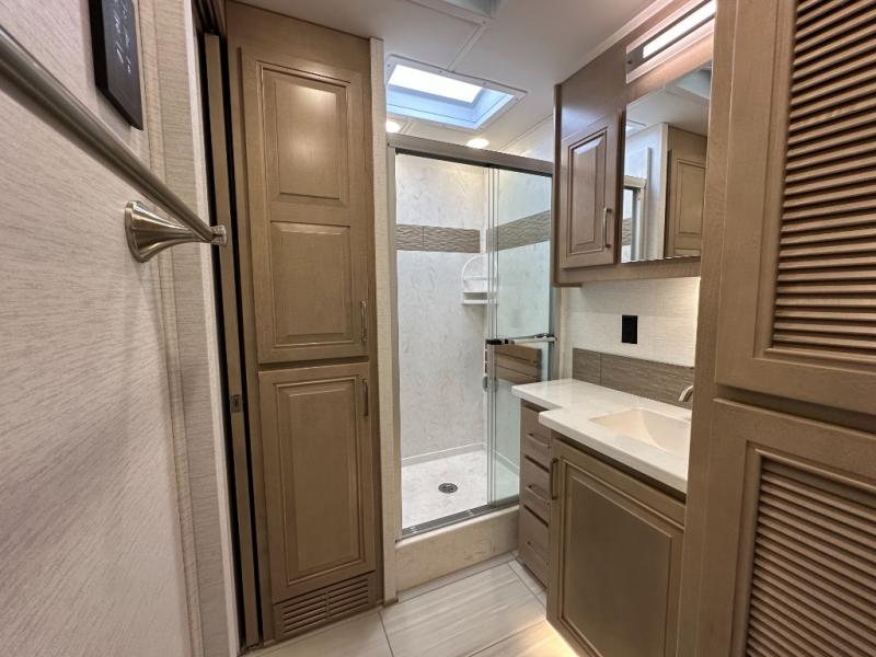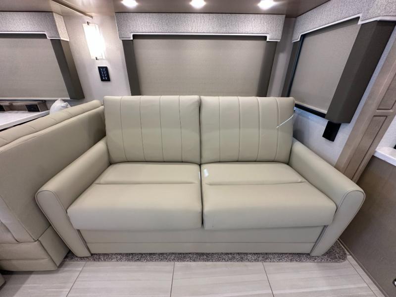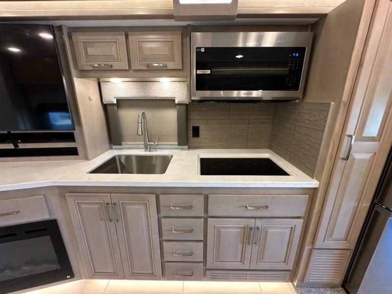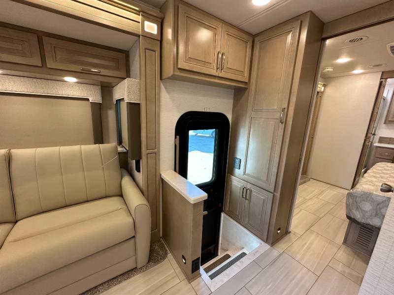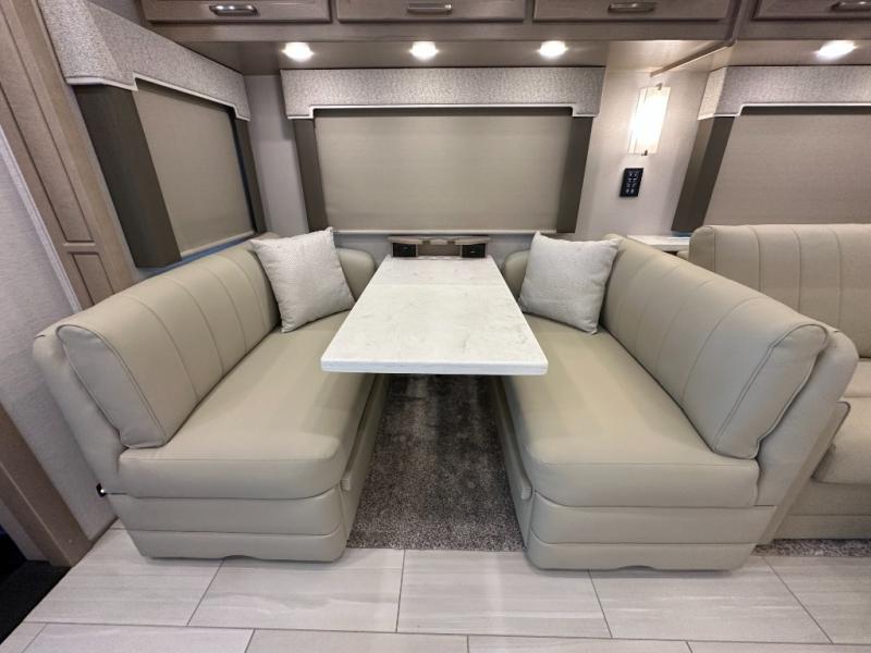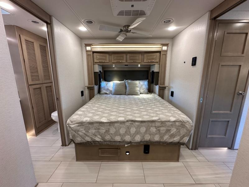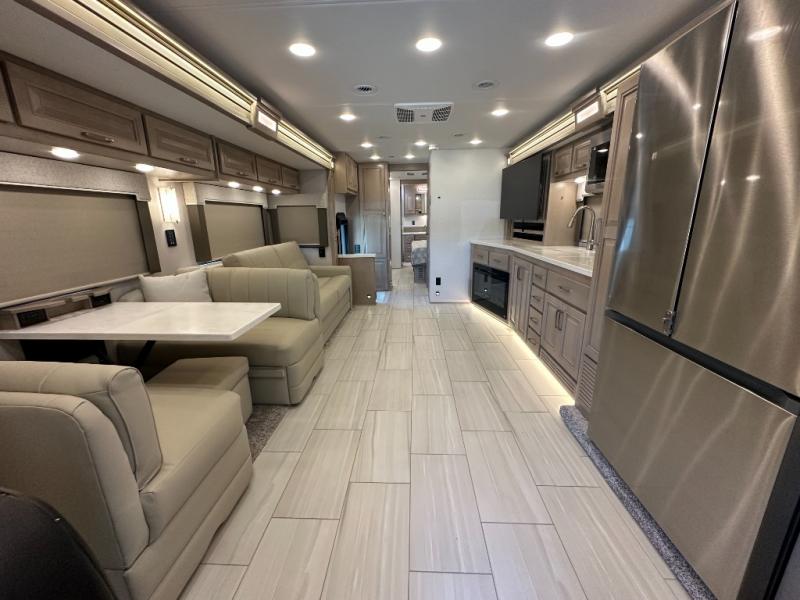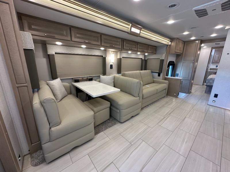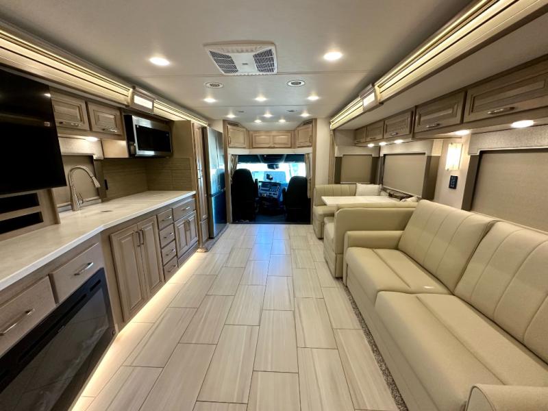 This Explorer Super C diesel motorhome is an advantageous coach that has all of the essentials and then some! With modern appliances and stylish décor, this coach stands out from the rest of the competition. The kitchen is packed full with an 18-cubic foot French door refrigerator, stainless steel convection microwave, and two-burner induction cooktop, and the full bathroom inside of the master suite has a shower skylight and LED vanity light. Out in the main living area, you will find a sofa sleeper so that you can relax at the end of a long and exhausting day, and you are also going to find a booth dinette right next to the sofa so that you can easily sit down with a hot meal each night.