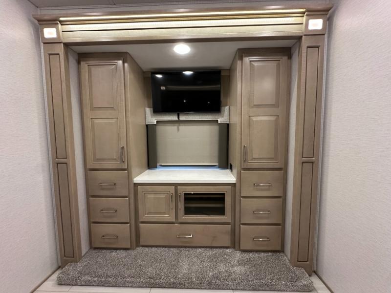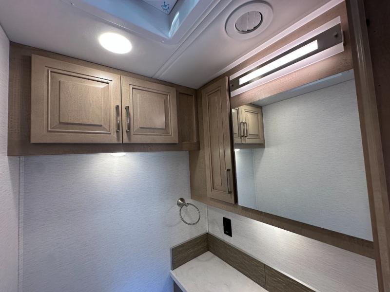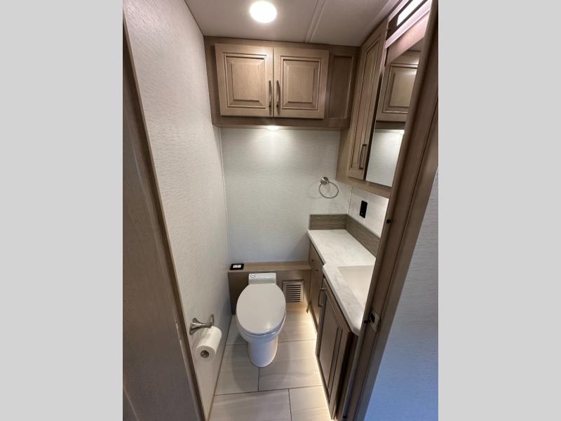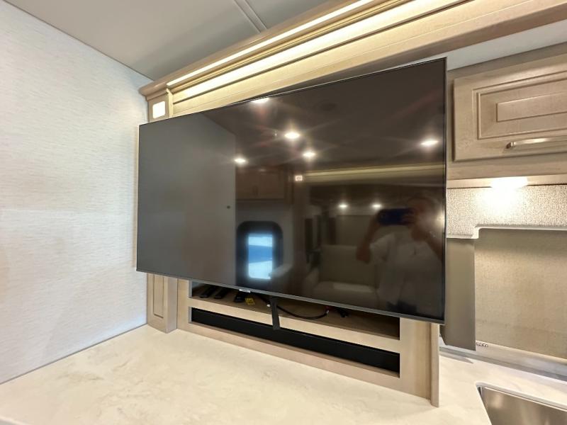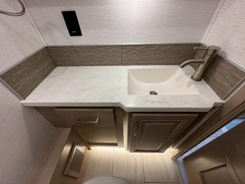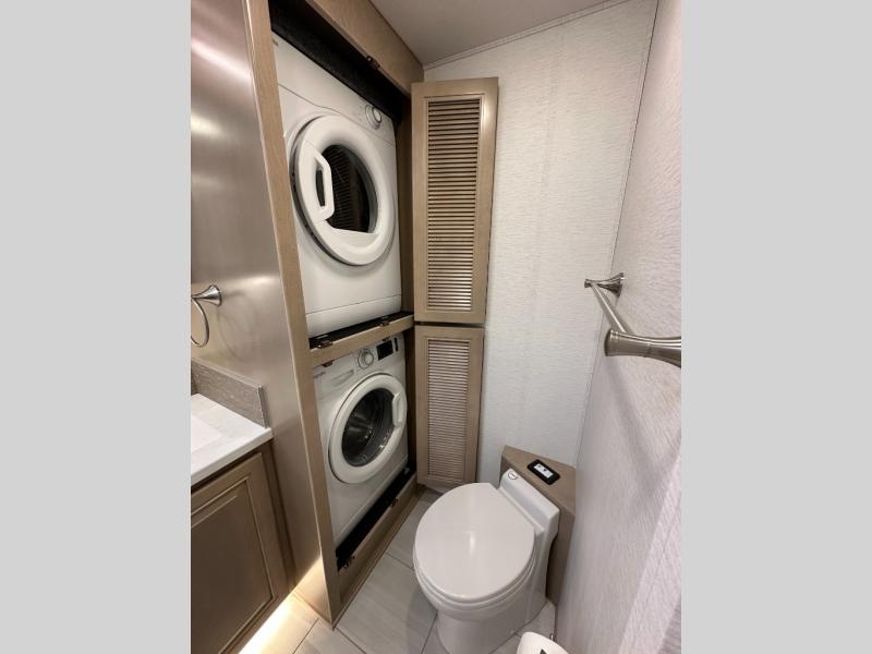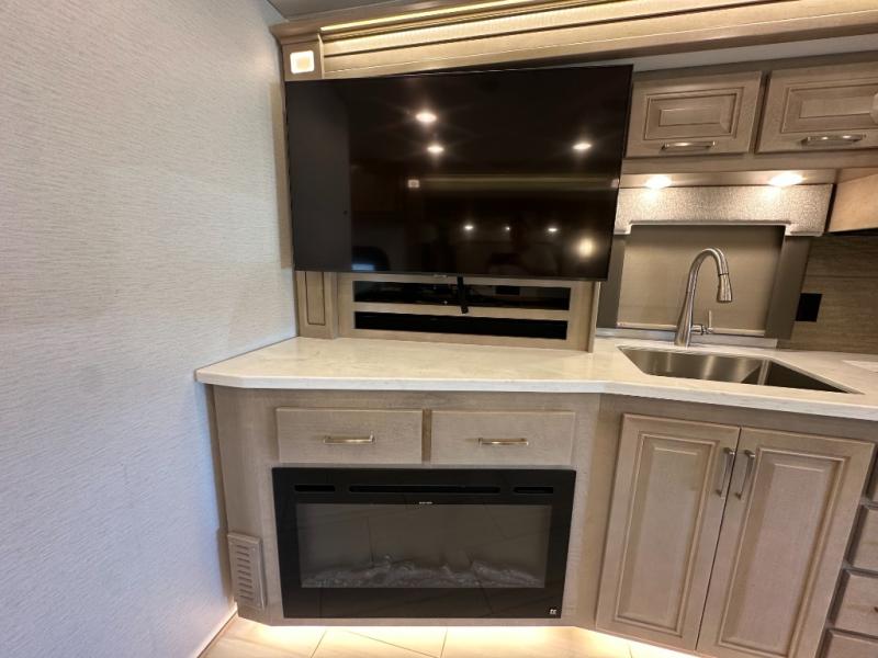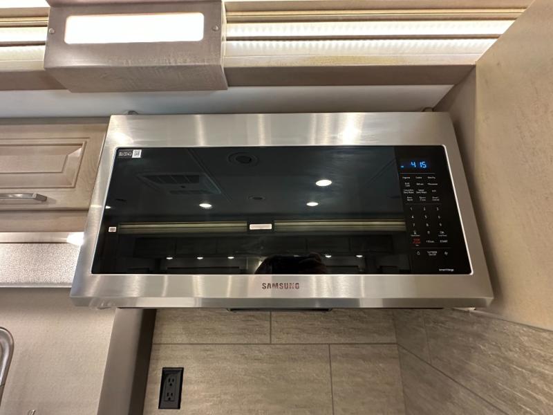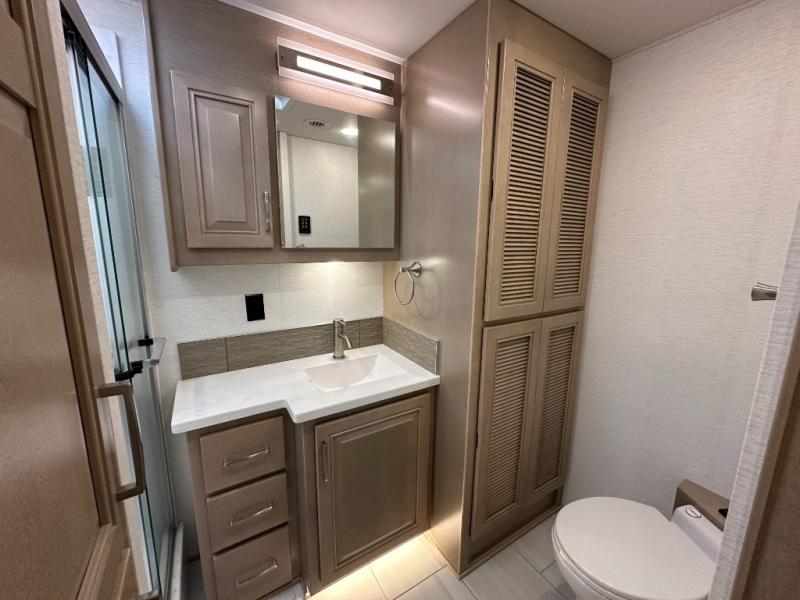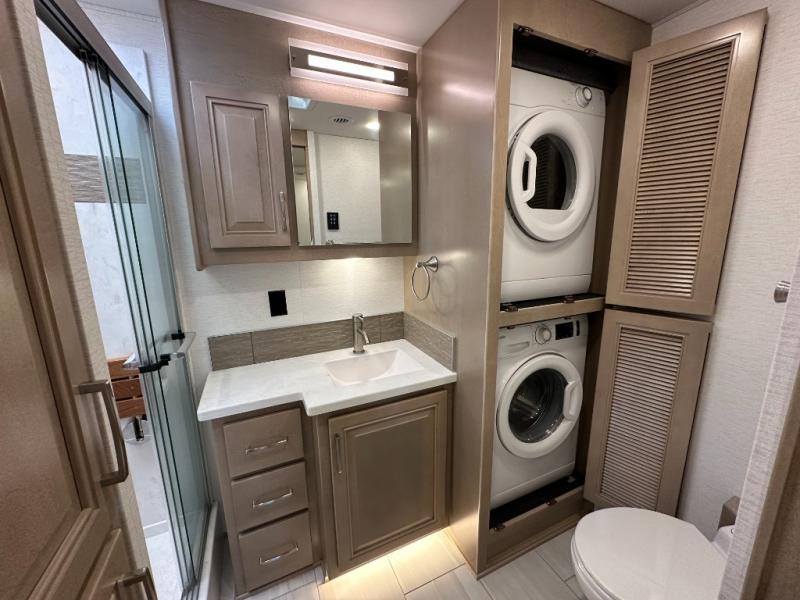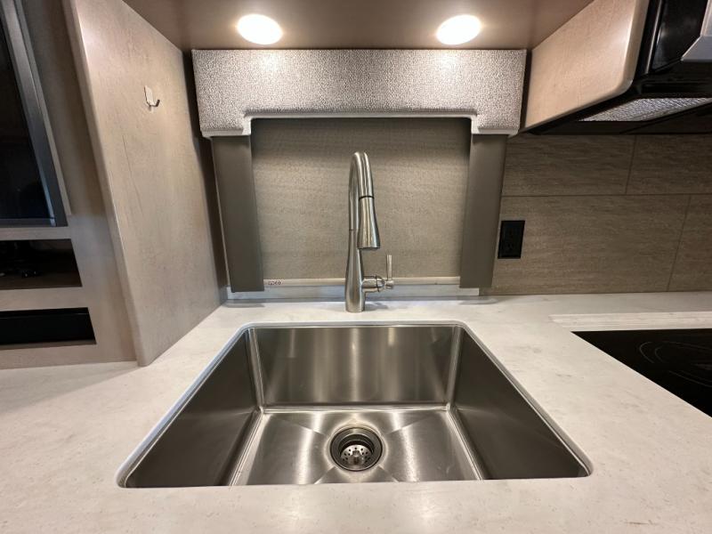 This Explorer Super C diesel motorhome is an advantageous coach that has all of the essentials and then some! With modern appliances and stylish décor, this coach stands out from the rest of the competition. The kitchen is packed full with an 18-cubic foot French door refrigerator, stainless steel convection microwave, and two-burner induction cooktop, and the full bathroom inside of the master suite has a shower skylight and LED vanity light. Out in the main living area, you will find a sofa sleeper so that you can relax at the end of a long and exhausting day, and you are also going to find a booth dinette right next to the sofa so that you can easily sit down with a hot meal each night.