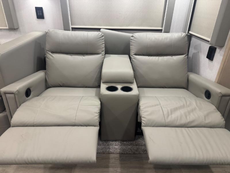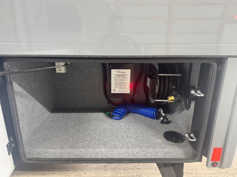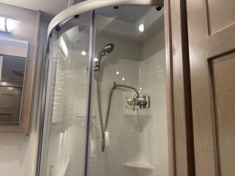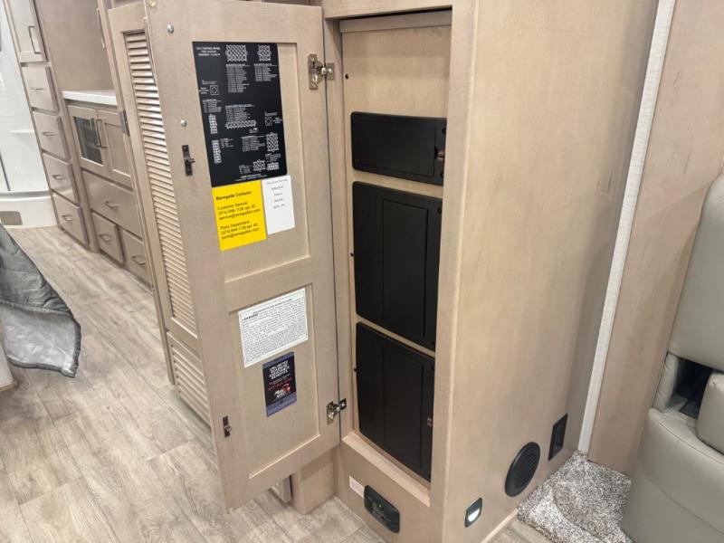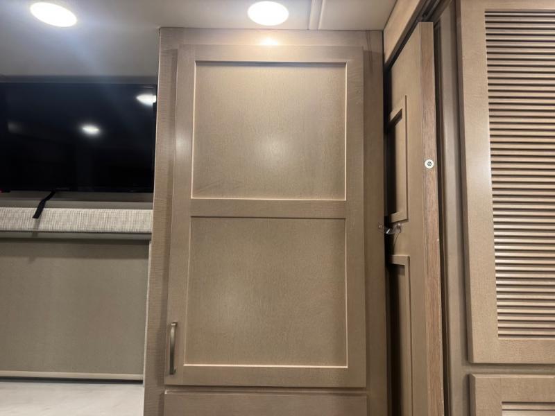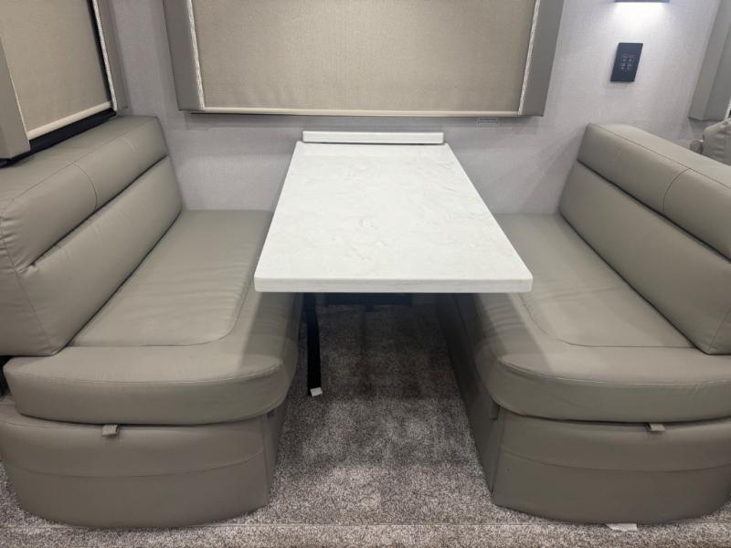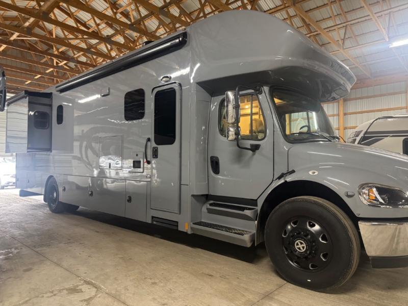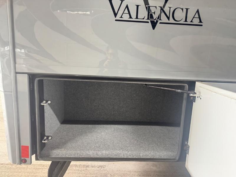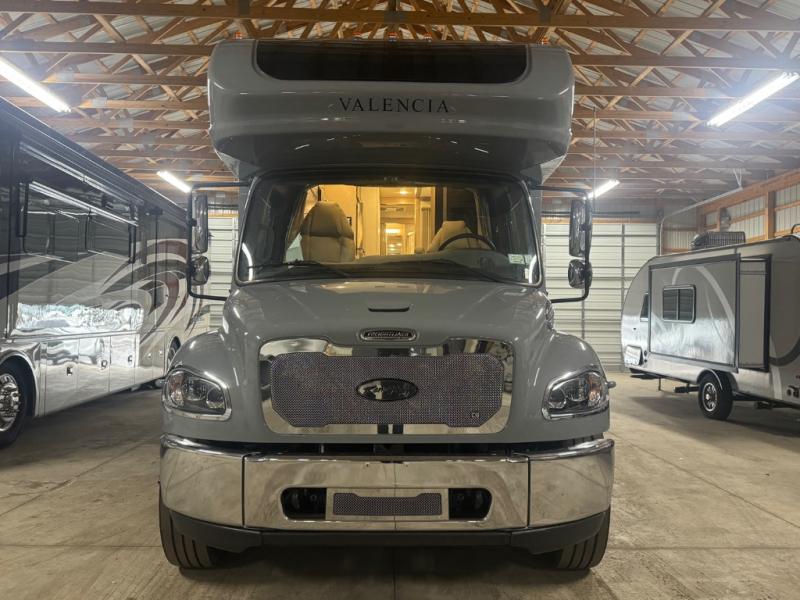 Start traveling the right way with this motorhome! There is plenty of entertainment throughout the inside and outside between the exterior entertainment center with a 32" Smart LED TV, a 39" Smart LED TV in the living area, and a 32" Smart LED TV in the private bedroom. Across from the half bathroom is an area pre-wired and plumbed for an optional washer and dryer so you can have clean clothes for your entire trip if you choose. The master suite has a 72" x 74" king bed to lay your head on at night and access to the full rear bathroom which has a radius shower with a skylight above for natural lighting and overhead cabinets to store your toiletries. The sofa sleeper and booth dinette offer comfortable places to enjoy meals, socialize, and even transform into sleeping spaces! Each one of these Renegade Valencia Super C diesel motorhomes offer ultimate comfort and durable construction! They have a Freightliner S2RV chassis for a refined ride with responsive handling, as well as a powerful Cummins ISB 360 HP engine with a 3,000MH Alison transmission and a single 100 gallon fuel tank to get you farther. A few of the beautifully designed interior features are the solid hardwood cabinets, the polished solid surface countertops, and the stainless-steel appliances. Travel in comfort and style with the modern furniture and abundant storage areas like the exterior steel storage compartments with carpeted lining. You will also appreciate the four point automatic hydraulic leveling system and the multiplex system with Bluetooth app control. With six Colorway paint options and three interior décor options, you can be sure to find the right one for you!