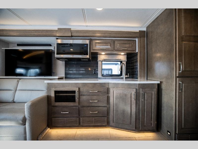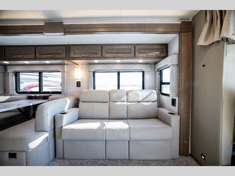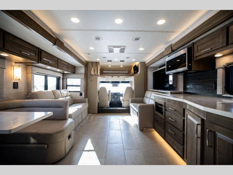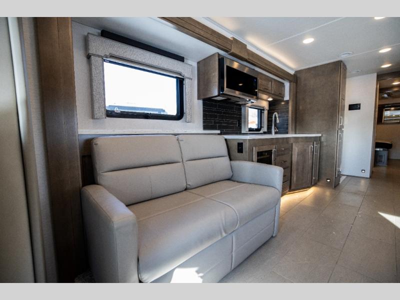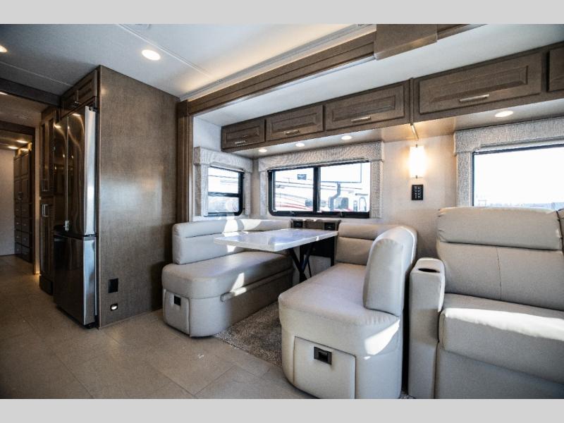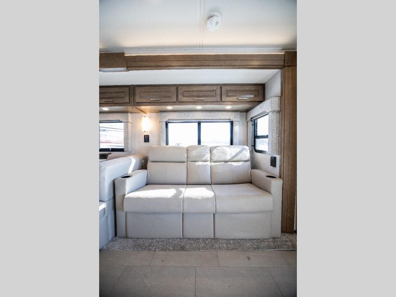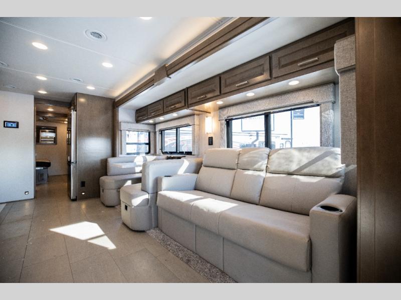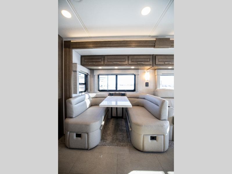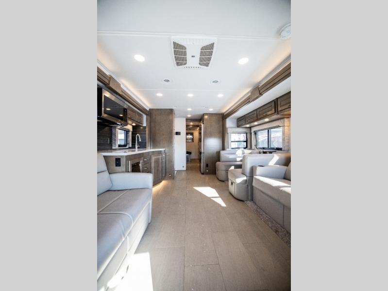 With any Verona LE Super C diesel motorhome by Renegade, you will be wowed by all the luxury features. The 2" vacuum laminated sidewalls feature welded aluminum framing for added support, and the 1.5" high density foam insulation in the sidewalls and roof means you can travel all year long in any season. The captain will love how easy it will be to drive with the Allison 3200TRV electronic 6-speed transmission, plus there are rear and side view cameras for easy parking and an upgraded cab sound system to keep the tunes going. Each model includes dual 15,000 BTU roof A/C pumps, an Aqua-Hot 450D hydronic water and zone heating system, plus MaxxAir power vents to keep you comfortable all year long. All of your power needs will be met with an 8kW Onan Quiet diesel generator, 3,000w True Sine wave inverter, and (2) 330Ah AGM house batteries. Inside, there are three modern decor options to choose from, along with solid surface countertops, grouted tile backsplash, Maple hardwood cabinetry, and many more comforts of home!