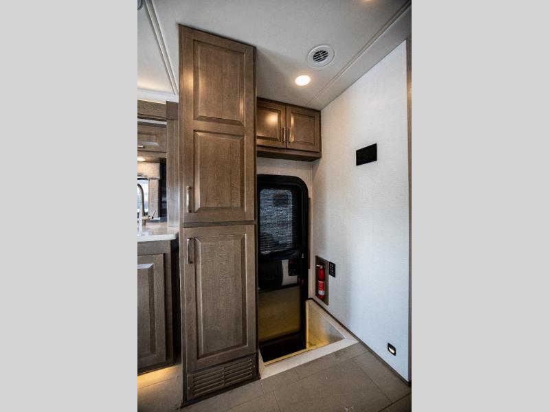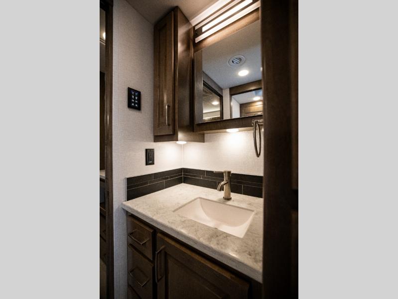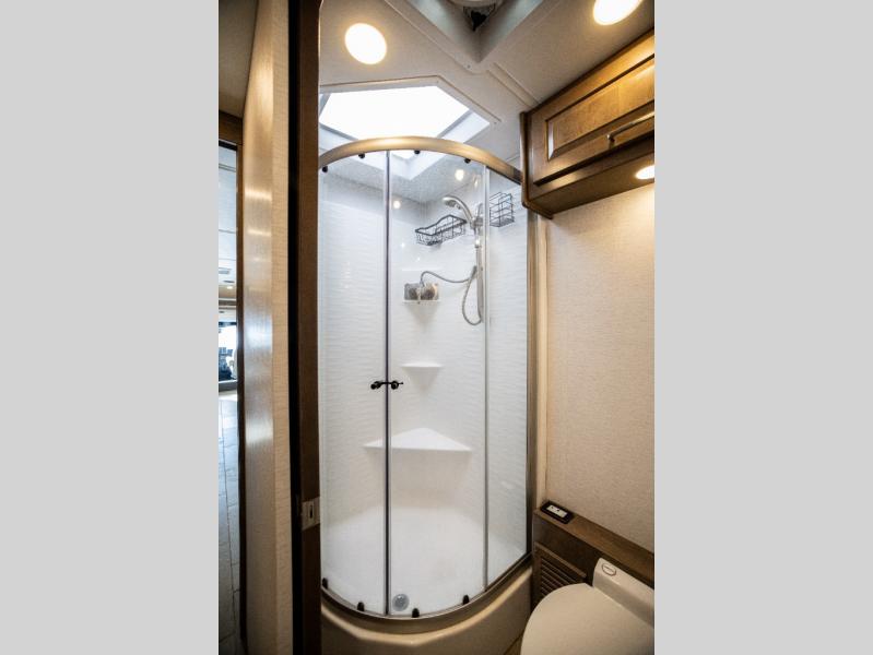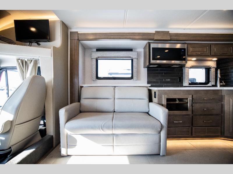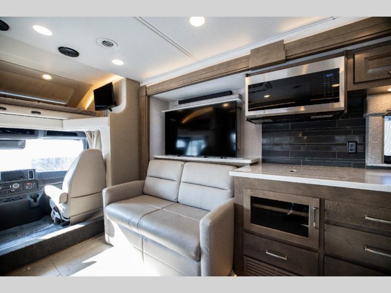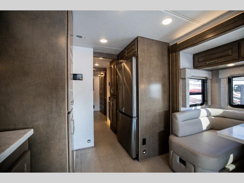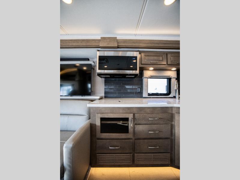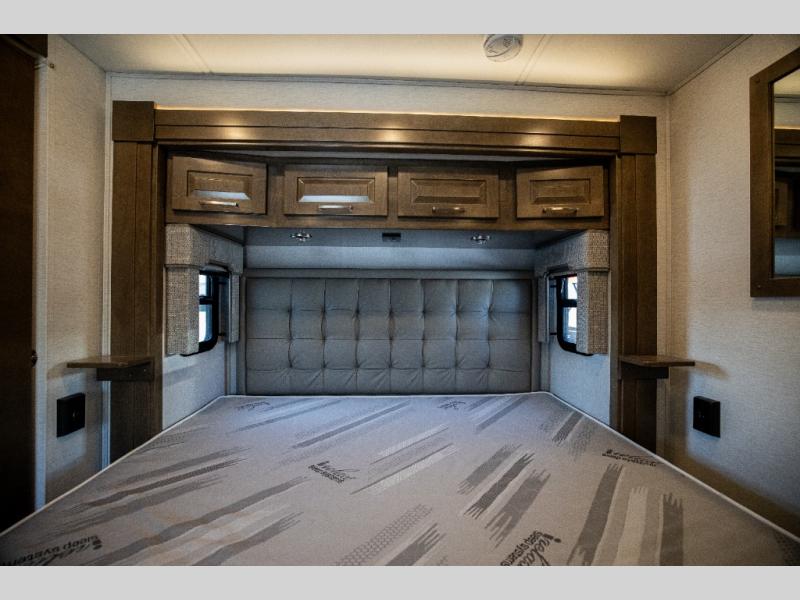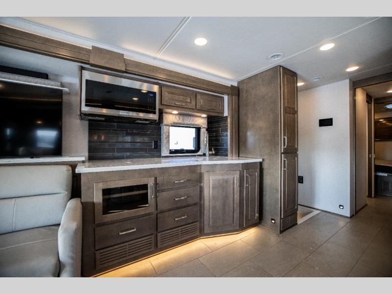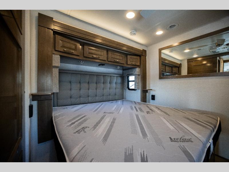 With any Verona LE Super C diesel motorhome by Renegade, you will be wowed by all the luxury features. The 2" vacuum laminated sidewalls feature welded aluminum framing for added support, and the 1.5" high density foam insulation in the sidewalls and roof means you can travel all year long in any season. The captain will love how easy it will be to drive with the Allison 3200TRV electronic 6-speed transmission, plus there are rear and side view cameras for easy parking and an upgraded cab sound system to keep the tunes going. Each model includes dual 15,000 BTU roof A/C pumps, an Aqua-Hot 450D hydronic water and zone heating system, plus MaxxAir power vents to keep you comfortable all year long. All of your power needs will be met with an 8kW Onan Quiet diesel generator, 3,000w True Sine wave inverter, and (2) 330Ah AGM house batteries. Inside, there are three modern decor options to choose from, along with solid surface countertops, grouted tile backsplash, Maple hardwood cabinetry, and many more comforts of home!