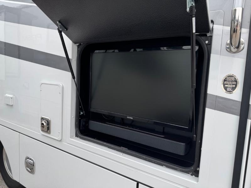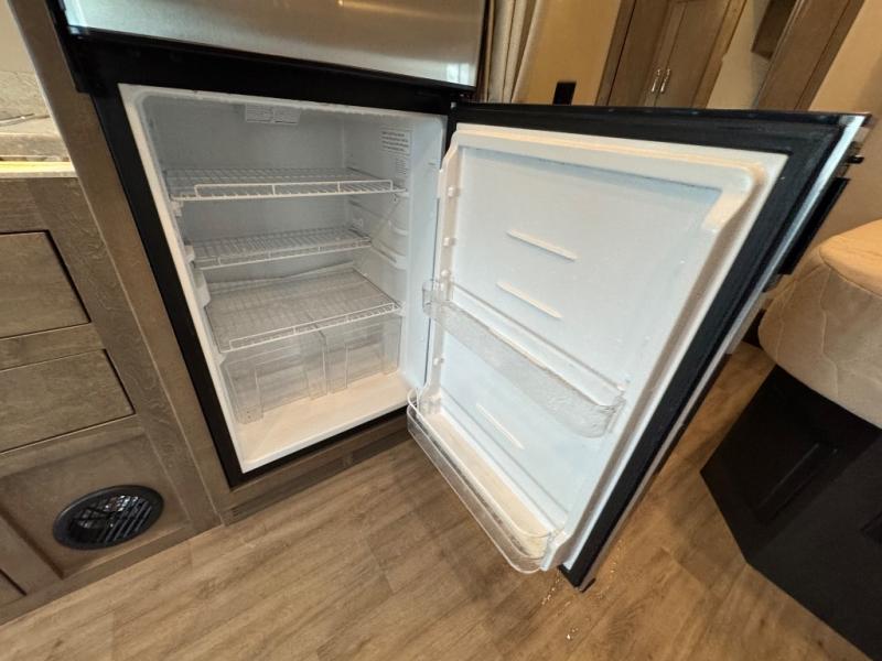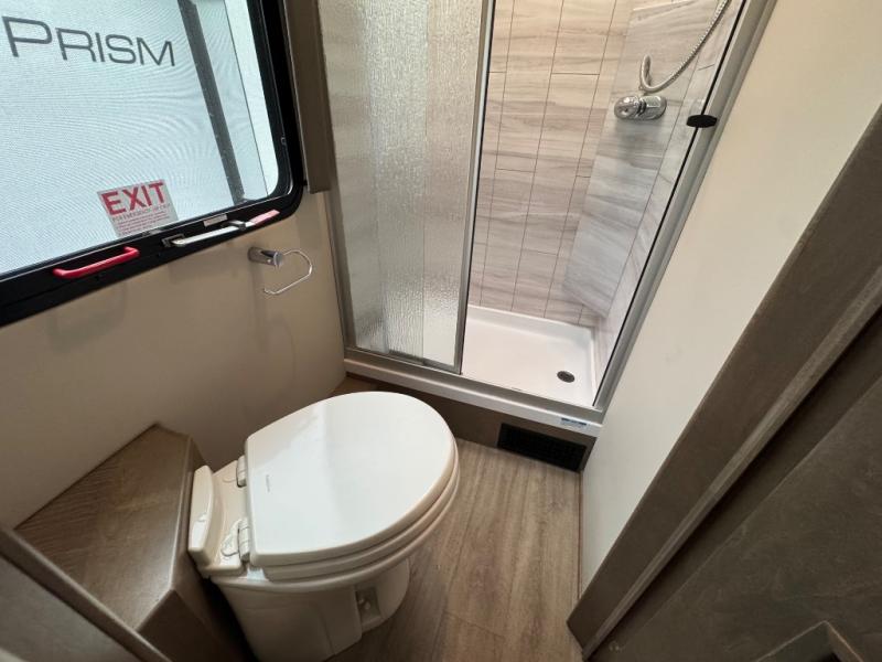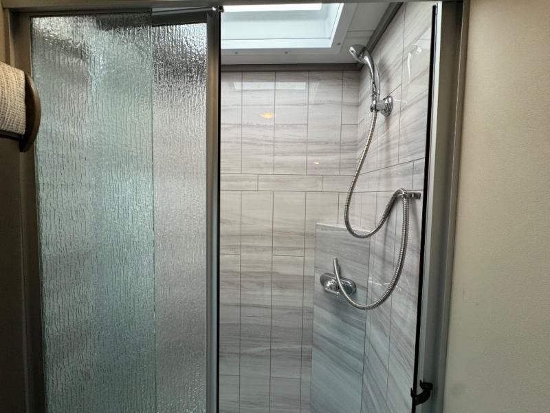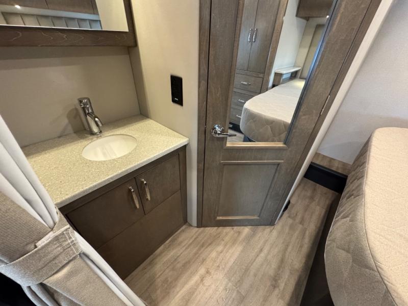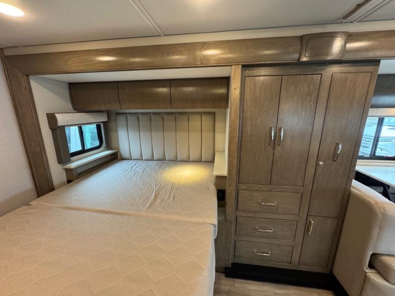 You will have a luxurious experience traveling in this motorhome! After a long day of traveling, you can either take a hot shower in the rear corner private 24" x 36" shower and toilet room, or lay down on the RV queen bed within the large slide. The bathroom sink is just outside the door with a medicine cabinet to store your toiletries. There is plenty of storage throughout between the wardrobe, the overhead cabinets, and the pantry, as well as outside with side swing baggage doors. The dinette is a great place to enjoy meals, play games, and transform into a sleeping space, and with a 46" x 80" bunk mattress above the cab, another person can join in on the fun!