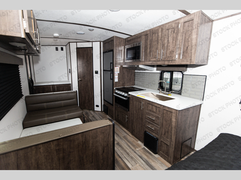 Are you looking for a travel trailer that will allow you to enjoy time outdoors and at-home comforts at the same time? Take a look at this double-axle model! You will love being able to make your meals on a three burner cooktop instead of a fire each night, and there is a full bath to clean up in after swimming in the lake. The booth dinette will be perfect for meal times, game night, and additional sleeping space, plus there is an RV queen bed in the front bedroom for you. If the weather isn't too hot you may just find yourselves outdoors more under the 11' power awning with an LED light!