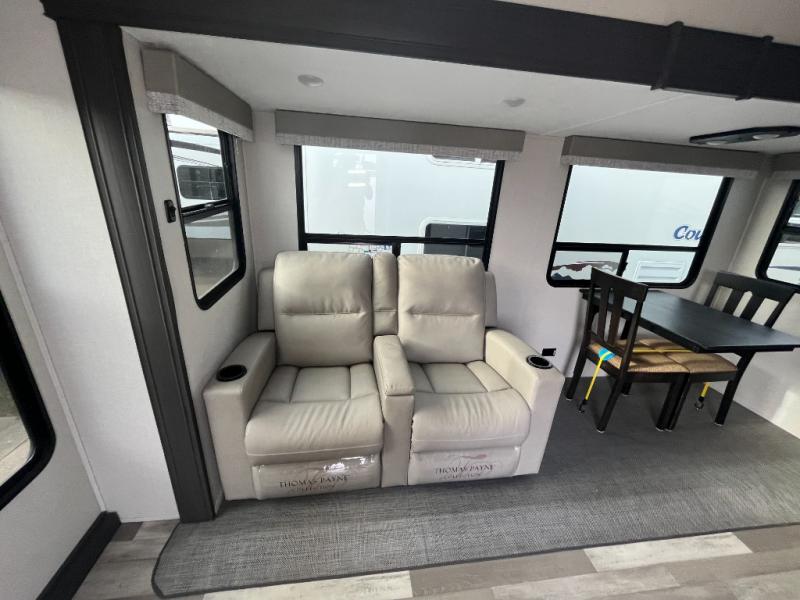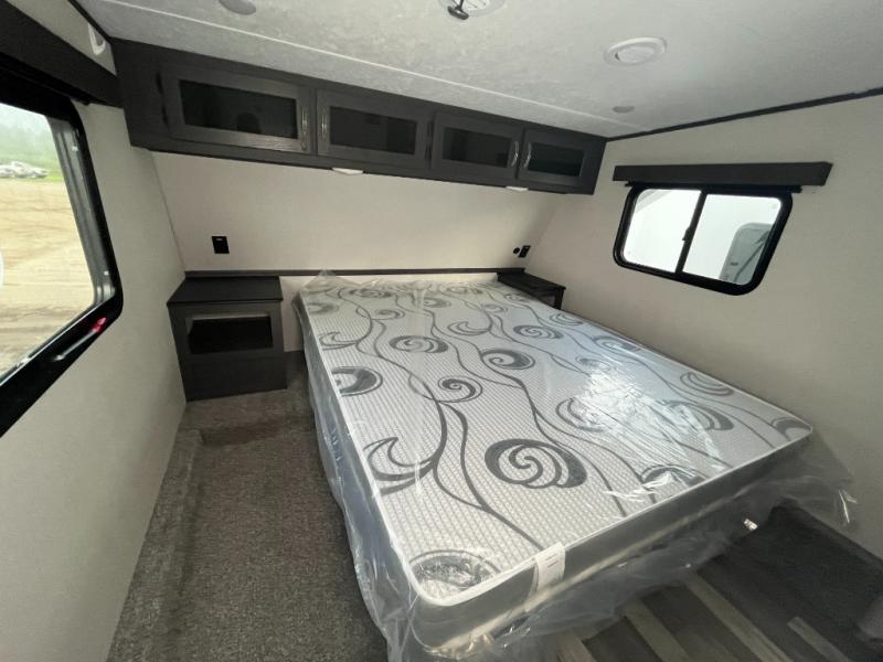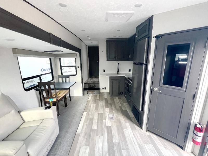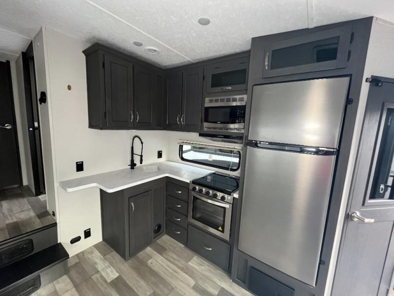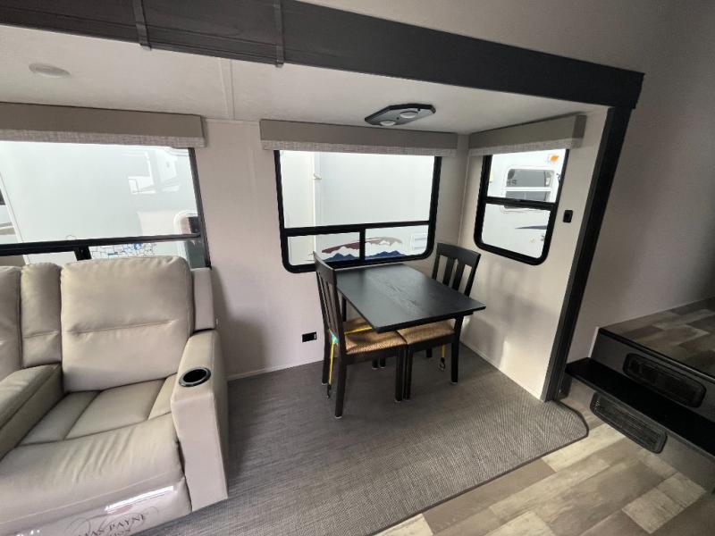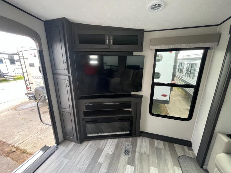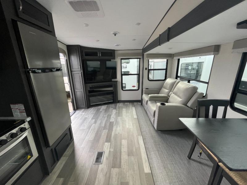 Head to your favorite spot with your favorite person in this fifth wheel! As you enter the unit, you will notice the entertainment center to your left which has a high BTU output modern electric fireplace to warm up by on the tri-fold hide-a-bed sofa for a truly relaxing evening. Enjoy home cooked meals prepared with the 21" stainless steel oven at the free standing table. If there happens to be any leftovers then you can easily store them in the 10.7 cu. ft. refrigerator. After a fun day at the beach, you can rinse the sand out of your hair in the full bathroom with a shower with a seat and large privacy dome skylight for added head room and natural lighting. Get well rested on the queen bed in the front private bedroom and keep your valuables in the dual nightstands.
