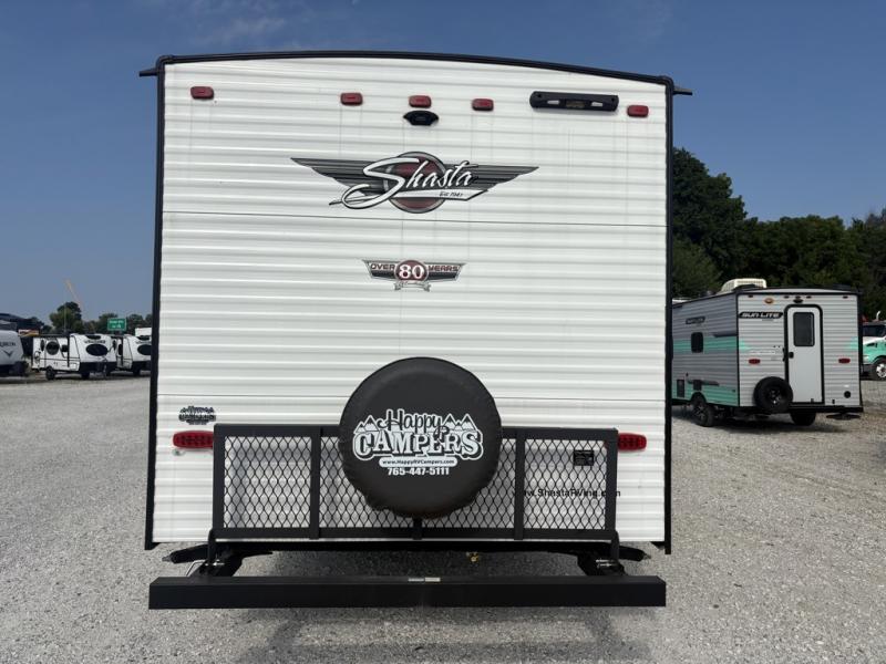 With each Shasta travel trailer by Shasta RVs, premium construction products are used such as radius wood rafters, wall studs on 16” centers, cambered steel I-beam frame, Congoleum flooring, and seamless countertops. Also included is an aerodynamic radius front profile, a front colored rock guard to protect against road debris, a straight axle with electric brakes, and a power tongue jack for easy setup. The interior offers decorative cabinet pulls, USB charging stations, an under-mount kitchen sink with a sink cover, and more providing value and convenience. Since there is King WiFi prep you have the option to work remotely, plus you can add electric stabilizer jacks, aluminum wheels, roof mounted 200 watt solar panel, and more available options!