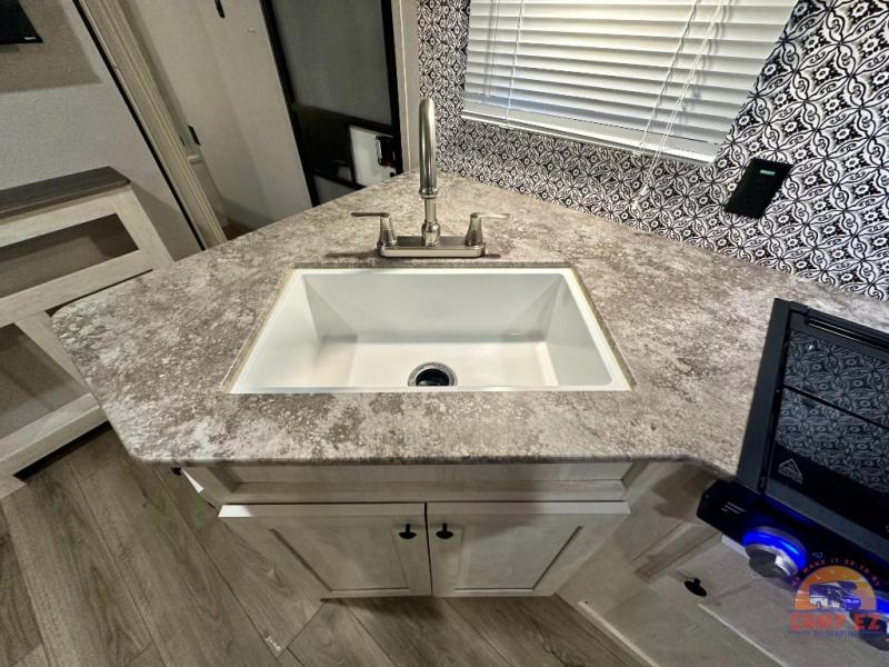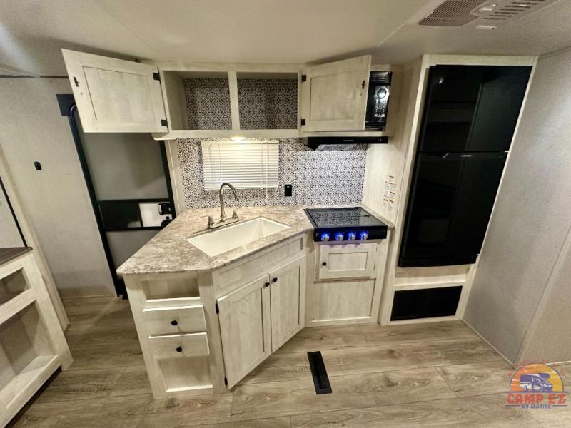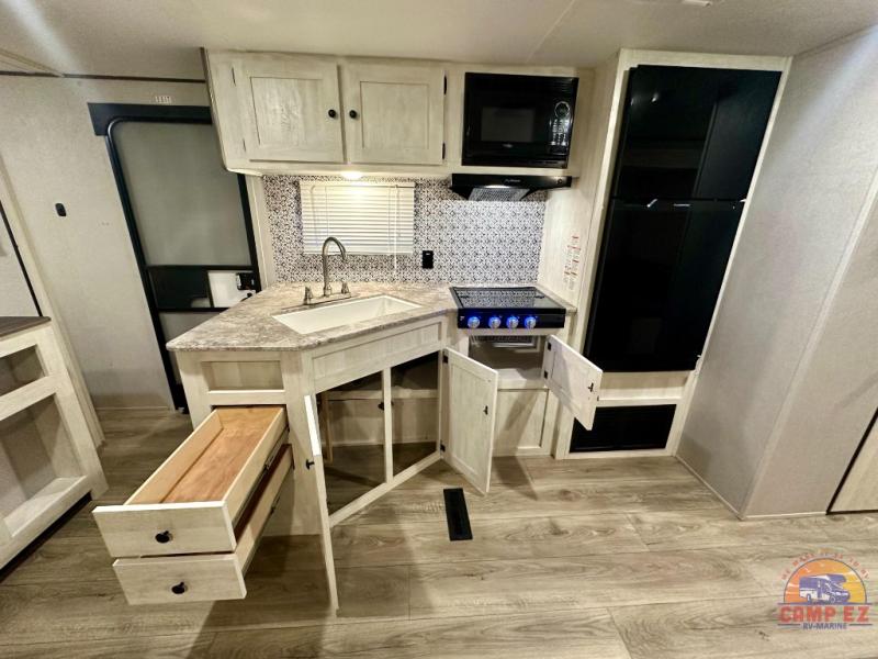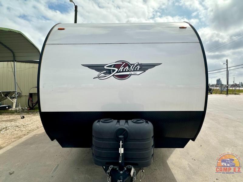 With each Shasta travel trailer by Shasta RVs, premium construction products are used such as radius wood rafters, wall studs on 16” centers, cambered steel I-beam frame, Congoleum flooring, and seamless countertops. Also included is an aerodynamic radius front profile, a front colored rock guard to protect against road debris, a straight axle with electric brakes, and a power tongue jack for easy setup. The interior offers decorative cabinet pulls, USB charging stations, an under-mount kitchen sink with a sink cover, and more providing value and convenience. Since there is King WiFi prep you have the option to work remotely, plus you can add electric stabilizer jacks, aluminum wheels, roof mounted 200 watt solar panel, and more available options!