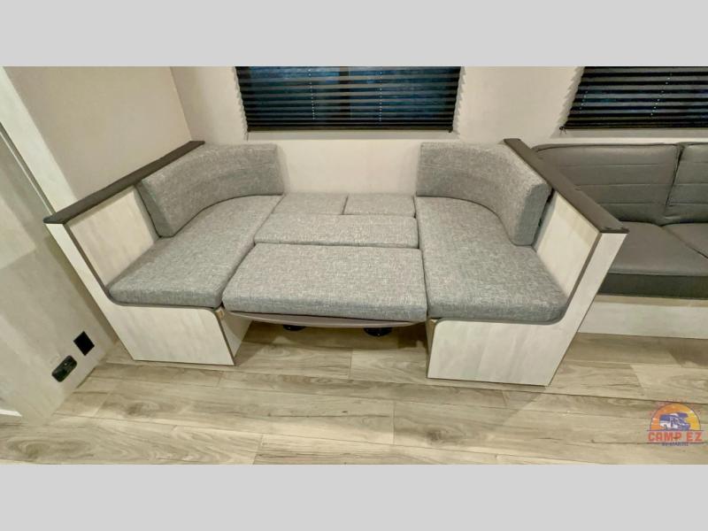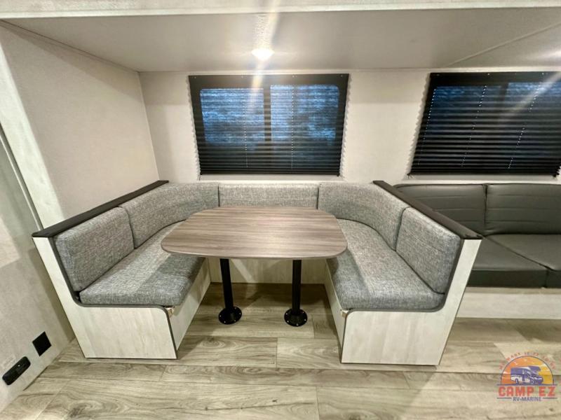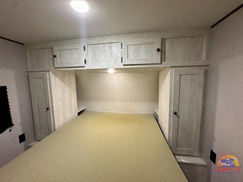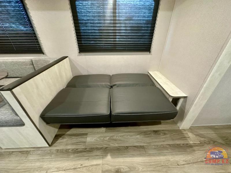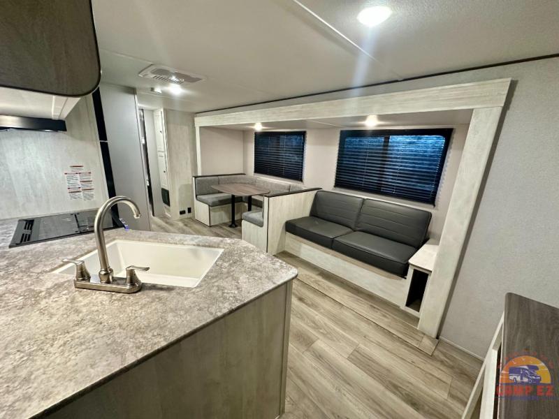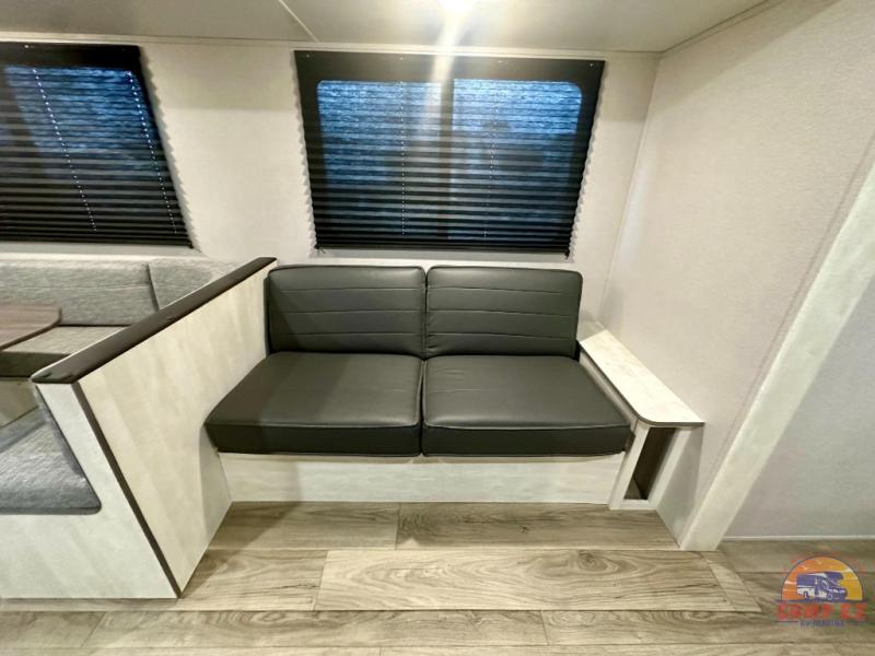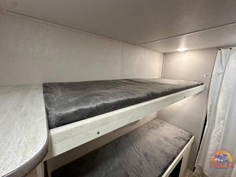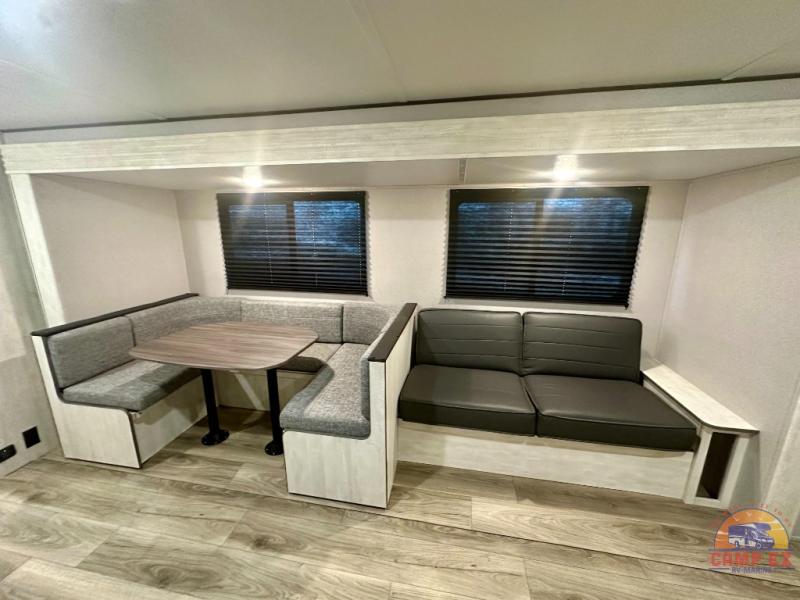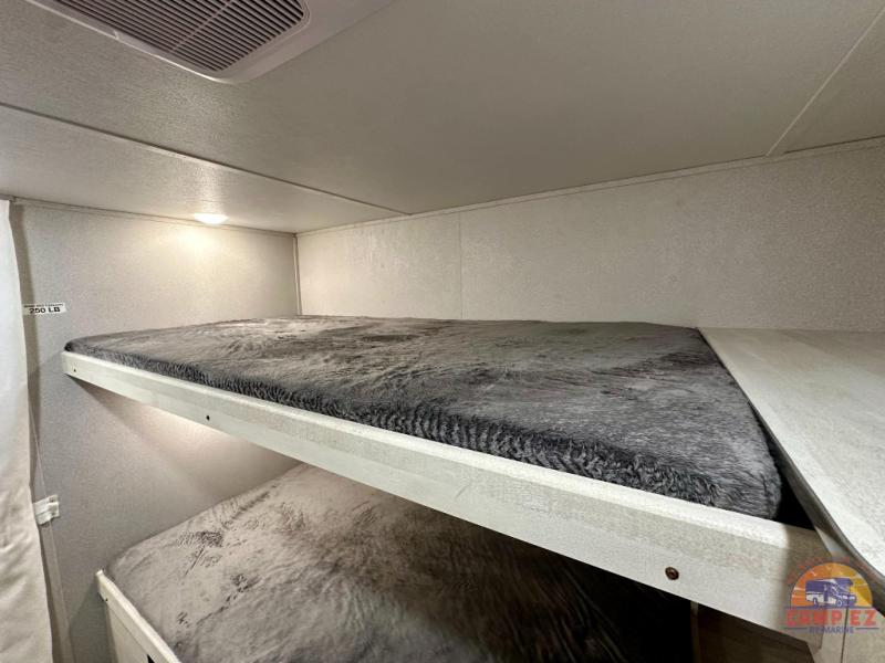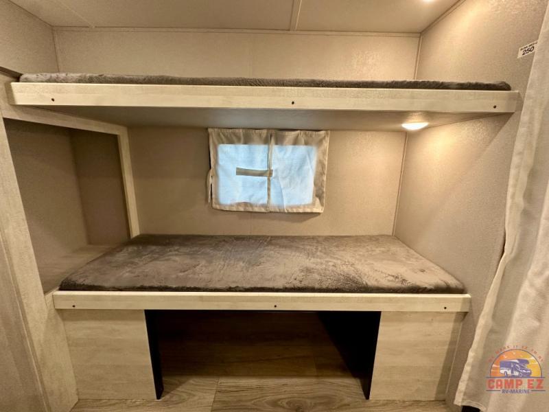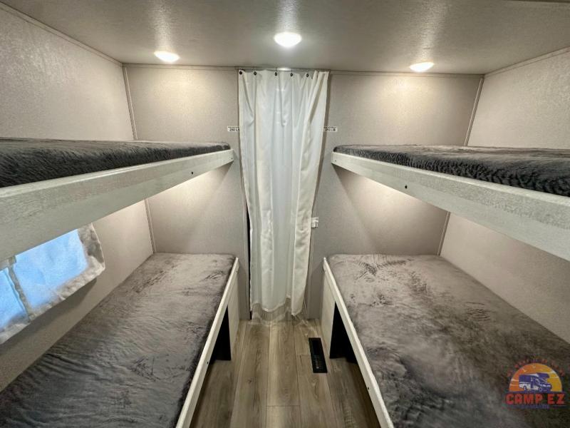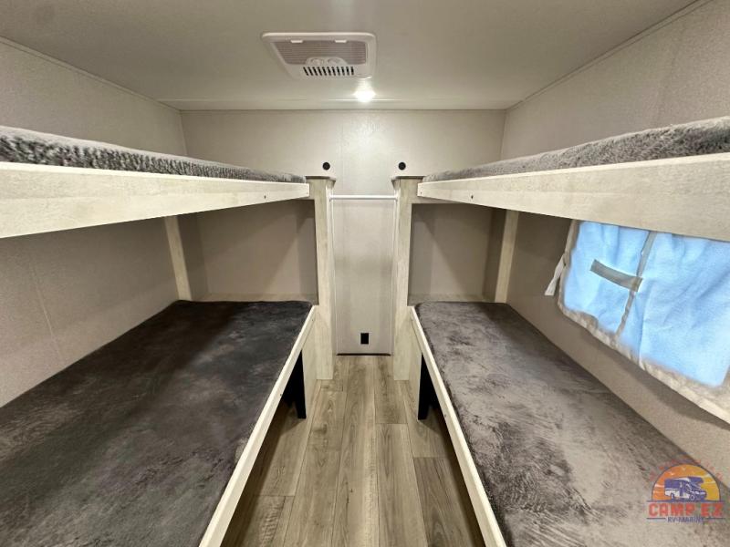 You and your guests will appreciate having privacy in this spacious travel trailer with a rear bunkhouse and a front bedroom! The bunkhouse includes four bunks, two storage cabinets, plus a hanging bar so clothes stay wrinkle-free. A queen bed comes standard in the front bedroom to ensure a great night's rest, plus there are dual bedroom wardrobes and two bed shelves to keep valuables close by. Everyone can meet in the combined kitchen and living area that includes a large slide out for more space. The sofa and U-shaped dinette here will provide a place to relax, play games, and even sleep more guests if needed. And of course, you can't overlook the full bath, complete with a large sink, shower skylight, and powered roof vent to keep everything fresh!