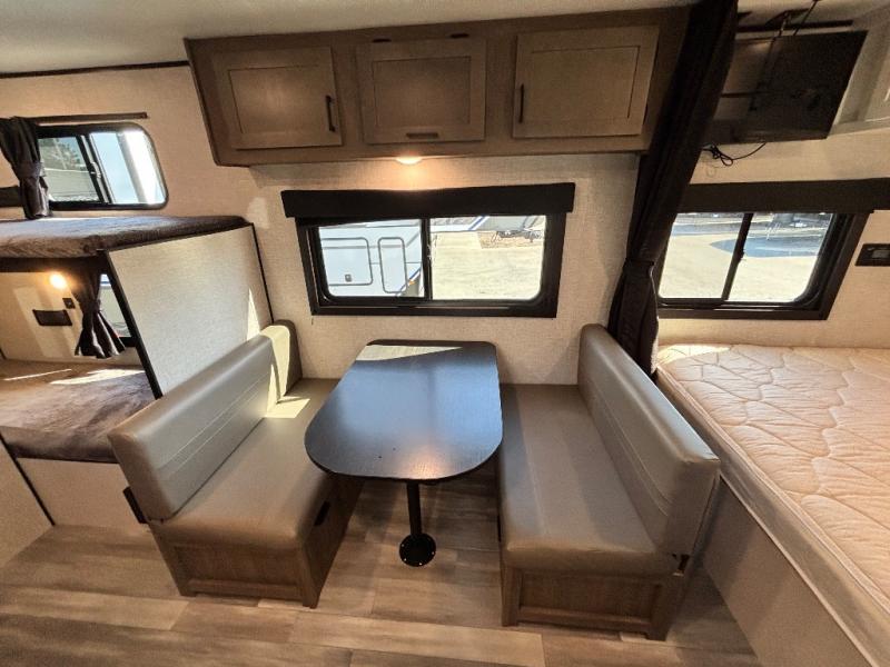 If you're in the market for a lightweight single axle travel trailer with bunk beds, you're in luck with this unit! You will have the front bed all to yourselves, and there is a wardrobe here to store your clothes. The chef can whip up lunch on the two burner cooktop, and you can dine at the booth dinette. If the weather is nice, you may just want to sit outdoors under the 13' power awning with LED lights. The rear corner bath includes a foot flush toilet and a tub/shower, and you'll find plenty of storage space throughout this model, including outside storage for charcoal, tackle boxes, and tools!