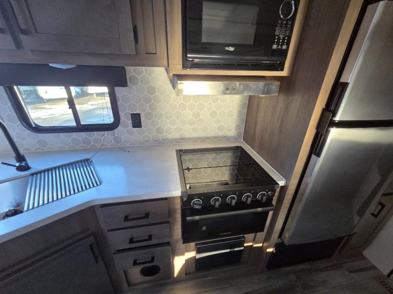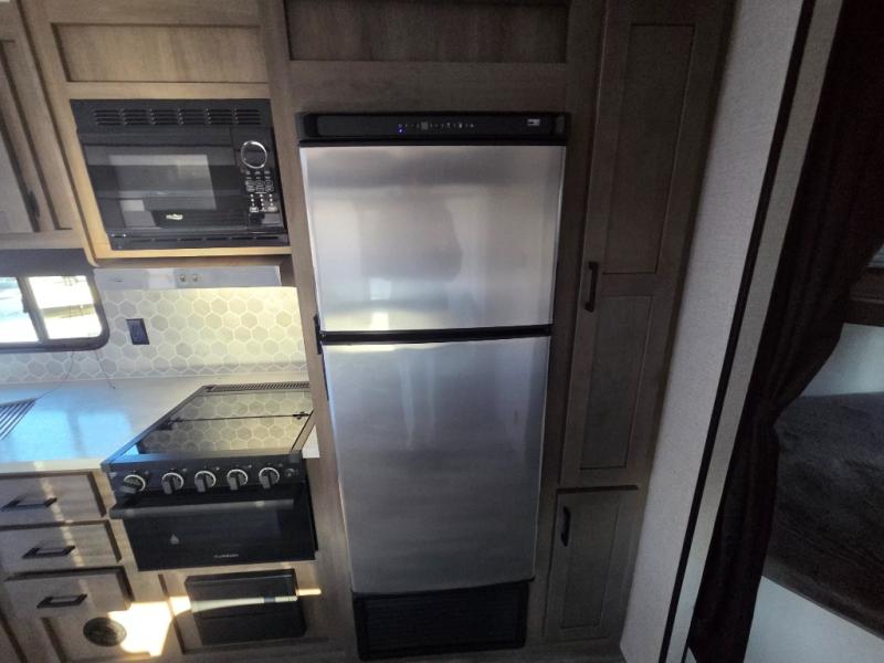 Enjoy camping at local RV spots or even national parks in this dual axle trailer that offers a large slide with a jackknife sofa and booth dinette for more sleeping space and interior room to relax. There is a full bathroom to get cleaned up in with extra counter space for toiletries, and the kitchen provides a three burner range with glass cover, a 17" oven and a pantry to hold all the goodies. You can enter the front bedroom from each side of the entertainment center giving you your own side, and there are dual wardrobes plus a shelf overhead. And don't forget about the 16' power awning with LED lighting, the exterior storage for your outdoor gear and the outside kitchen including a griddle and a refrigerator. You might even like to add a few options, take a look at the list!