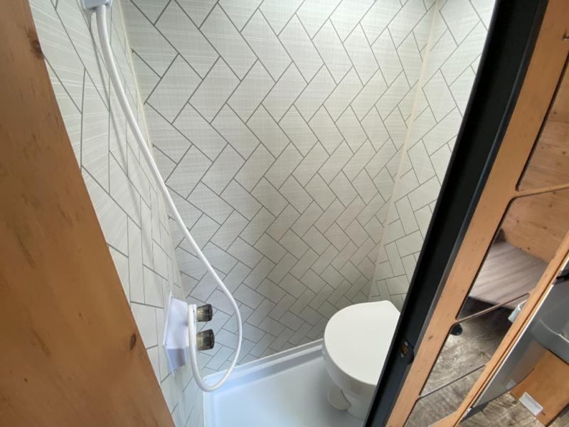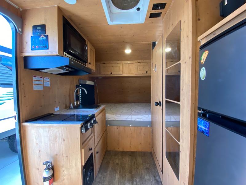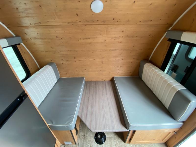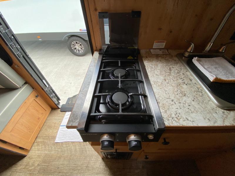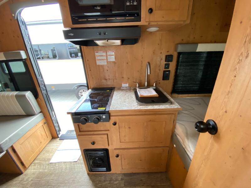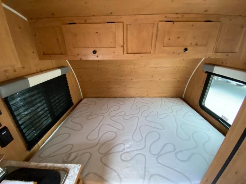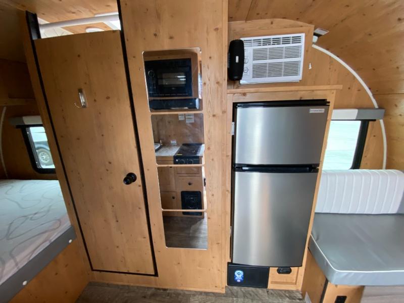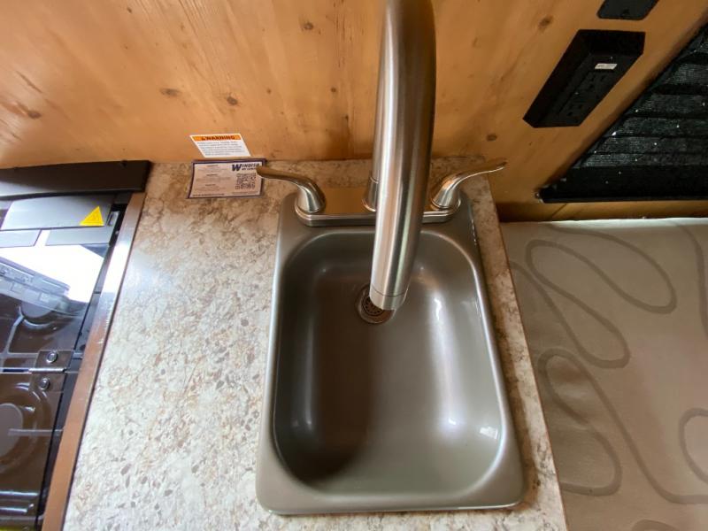 This Sunray travel trailer is the largest and most accommodating because it comes with a wet bath so that you can even take a shower in your trailer! There is a small kitchen on the interior that comes with a two-burner stove top, a refrigerator, and a microwave so that you can cook dinner without having to start a fire, and since it is indoors, you will be able to keep the bugs away while you prepare something delicious to eat. If you need to rinse off some gear, the outside shower will be especially useful, and if you need to charge your devices, use the USB ports. You will also find a Winegard HDTV antenna on this model. Add the available Classic option for 14" tires instead of the off-road version, color matching rims with Moon Caps, and Retro decor and Diner-Style countertops.
