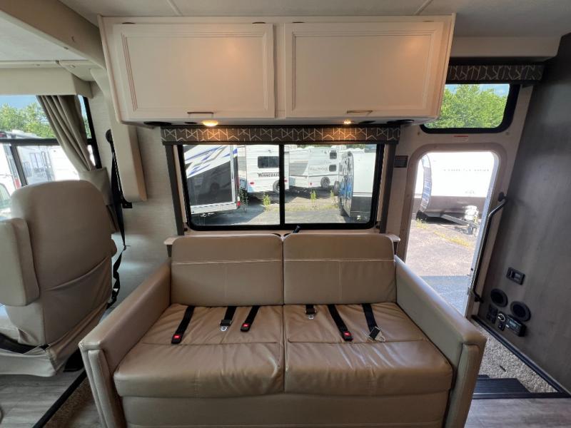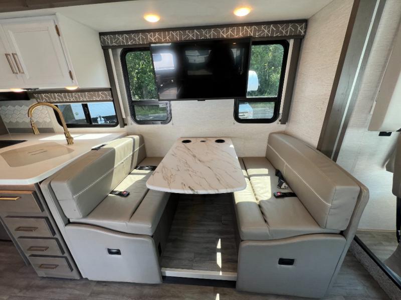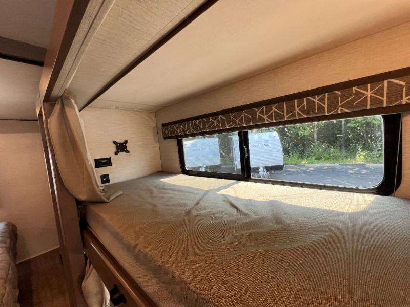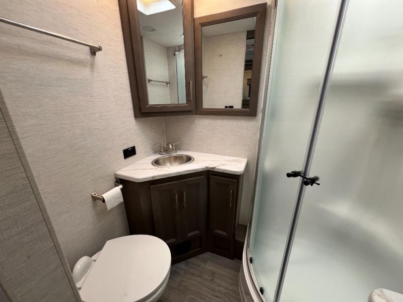 Are you looking for a motorhome with more space and comfort? Your search is over with this family-friendly coach that can sleep eight people each night. The kids will love the bunk beds and the drop-down overhead bunk up front, while you enjoy the king bed in the rear bedroom. There is also a Dream Dinette and a jack-knife sofa across from the 39" TV for easy viewing. Home-cooked meals can be prepared on the three burner gas cooktop or in the microwave oven, and leftovers can go in the 12V DC double door refrigerator. This model also includes a spacious full bath with a linen closet, a shower skylight, and a sleek glass shower door!