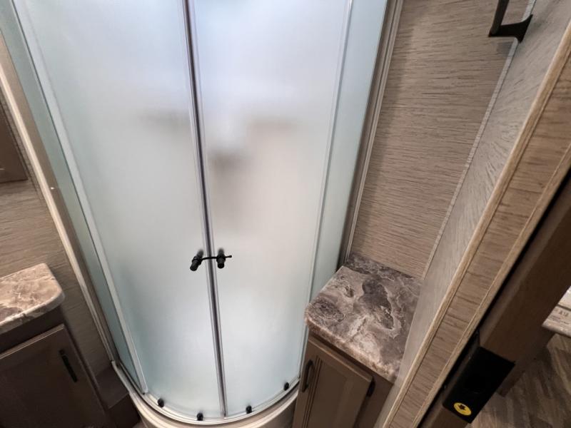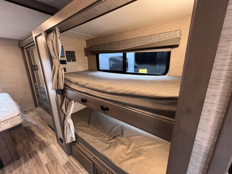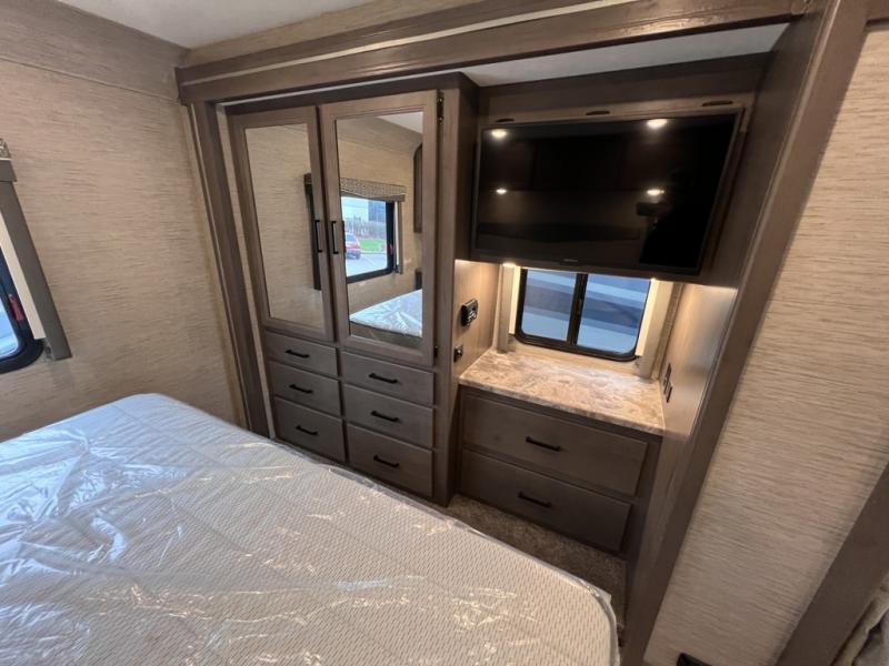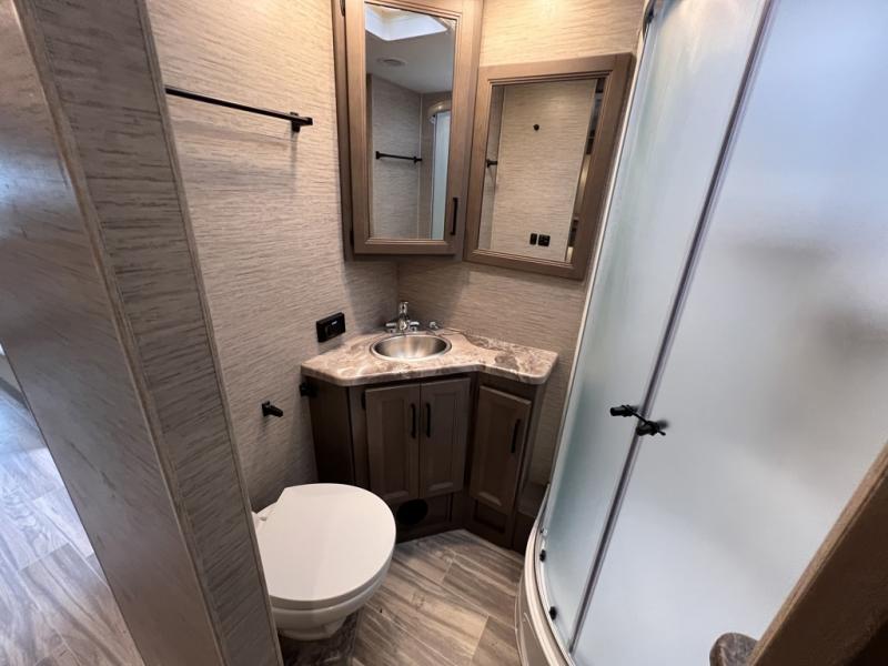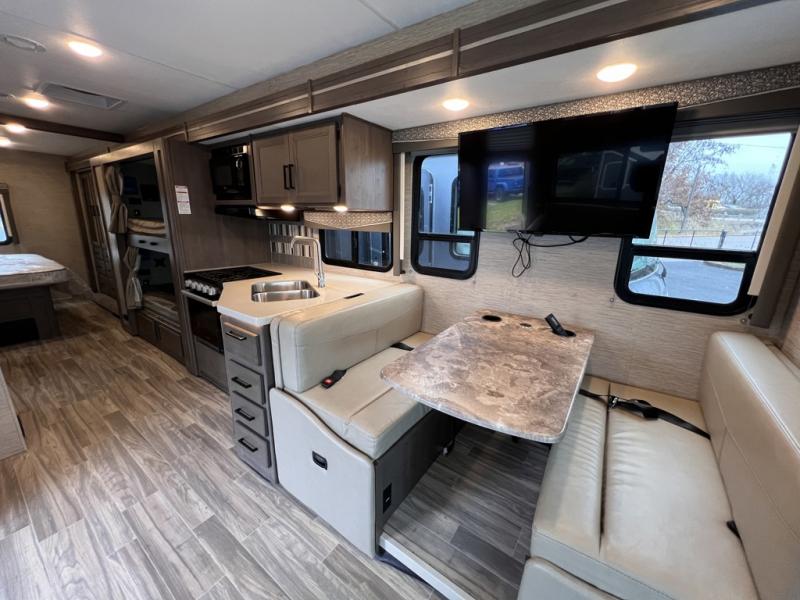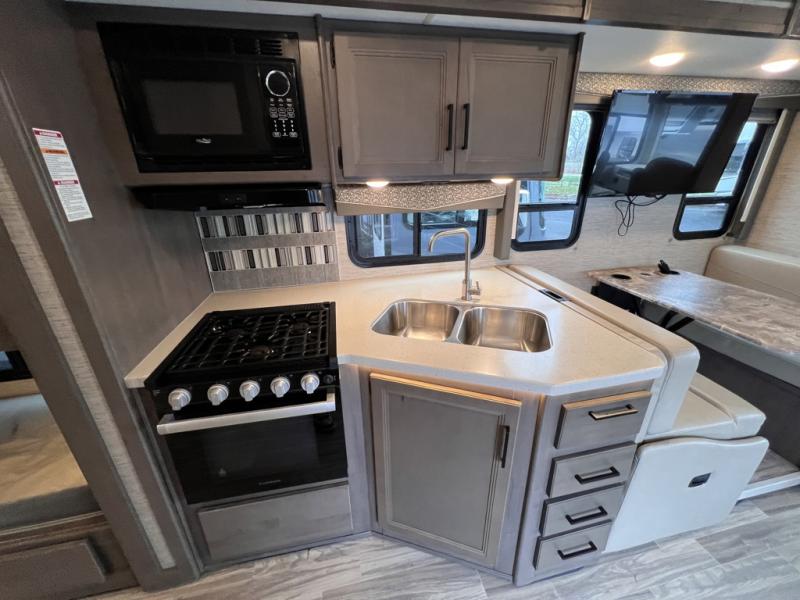Are you looking for a motorhome with more space and comfort? Your search is over with this family-friendly coach that can sleep eight people each night. The kids will love the bunk beds and the drop-down overhead bunk up front, while you enjoy the king bed in the rear bedroom. There is also a Dream Dinette and a jack-knife sofa across from the 39" TV for easy viewing. Home-cooked meals can be prepared on the three burner gas cooktop or in the microwave oven, and leftovers can go in the 12V DC double door refrigerator. This model also includes a spacious full bath with a linen closet, a shower skylight, and a sleek glass shower door!