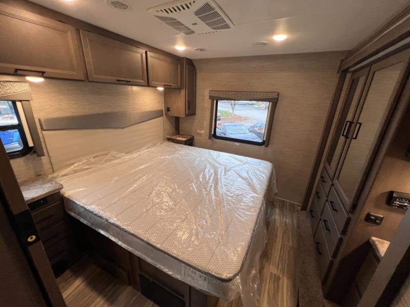 The A.C.E Class A gas motorhome is constructed with a welded tubular steel floor, vacu-bond laminated roof, walls and floor with block foam insulation, and a premium one-piece exterior roof for a coach made to last. You will love the pet-friendly features, like the Bird's Eye window, the Pet-Link multi-purpose tie-down and the Pull-Out Kibble Station with an FDS approved pet bowl liner. Each model includes an Onan RV QG 4,000 gas generator, a Winegard ConnecT Wi-Fi extender +4G, and are pre-wired for solar charging. Some of the other convenient amenities you will find on the A.C.E are framed windows, a basement pass-through storage, and an exterior LP connection. Head inside to find residential vinyl flooring, pressed laminate countertops, glass tile backsplash in the kitchen, and a designer headboard, bedspread and pillow shams in the bedroom for all-around comfort!