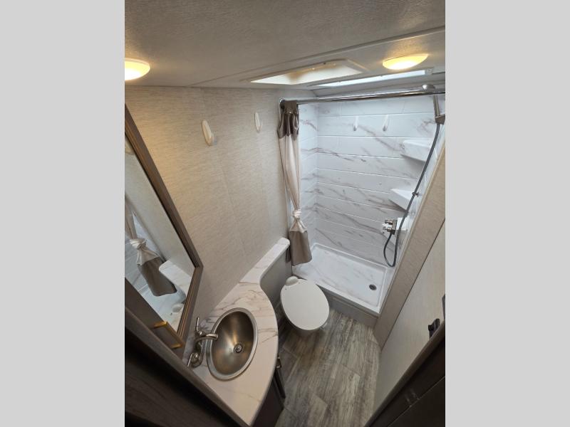 Start exploring the countryside in true comfort with this motorhome! Keep your bellies full with a fully equipped kitchen that has a flip-up countertop to make meal prepping easier. You can enjoy your delicious meals at the 76" Dream Dinette and even transform it into an extra sleeping space. Speaking of sleeping spaces, there is a 52" x 96" bunk over cab with a 39" TV on a swivel and a private bedroom with a 60" x 74" queen bed slide for more interior space and even an area prepped to add an optional TV. After a long day of traveling, you can freshen up in the rear corner bathroom with the 24" x 36" shower and if you chose to add the optional exterior 32" TV then you can watch a movie under the stars!