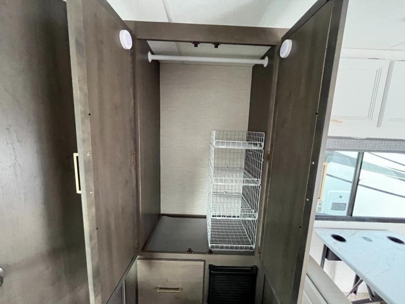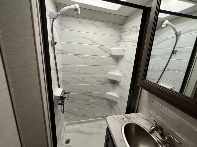 If you wish to escape the hustle and bustle of everyday life with your favorite people then check out this motorhome! Everyone will have a comfortable place to sleep between the rear corner 54" x 80" queen bed, the 52" x 96" bunk over cab with a 39" TV on a swivel for entertainment at night, and even the 76" Dream Dinette can transform into an extra sleeping space. Store all of your essentials in the closet just outside the rear corner bathroom which has a 24" x 36" shower and keep your perishables fresh in the refrigerator. The flip-up countertop extension makes it easier to prepare your home cooked meals, and you can add an optional exterior 32" TV to watch the big game outdoors!