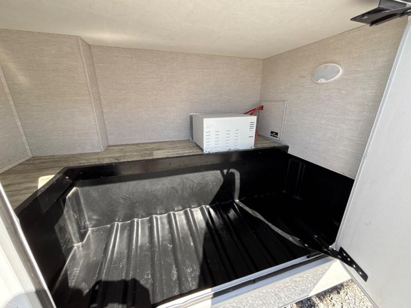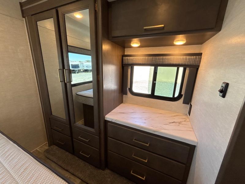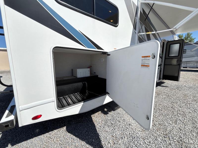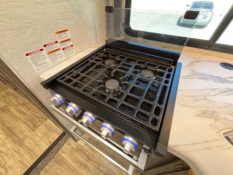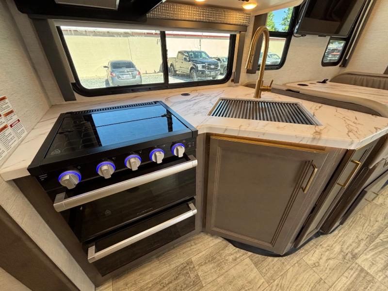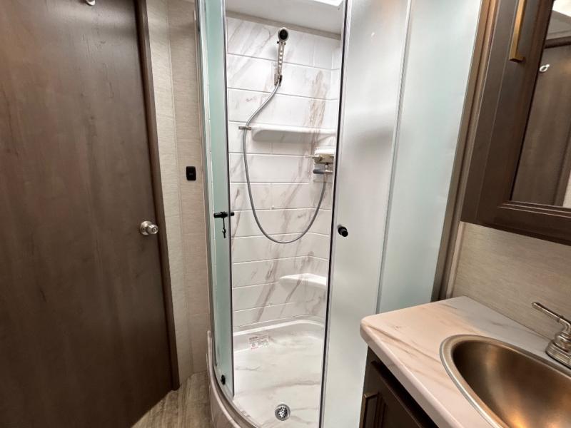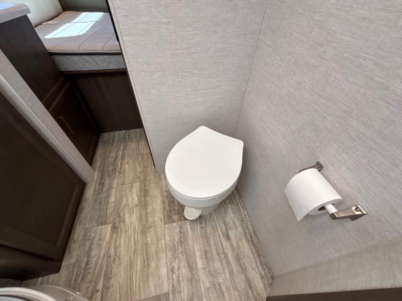 The kitchen is fully equipped with a three-burner cooktop, microwave, oven, refrigerator, and pantry storage, making it easy to prepare meals on the road. The bathroom includes a shower, toilet, and vanity, giving you full residential convenience.