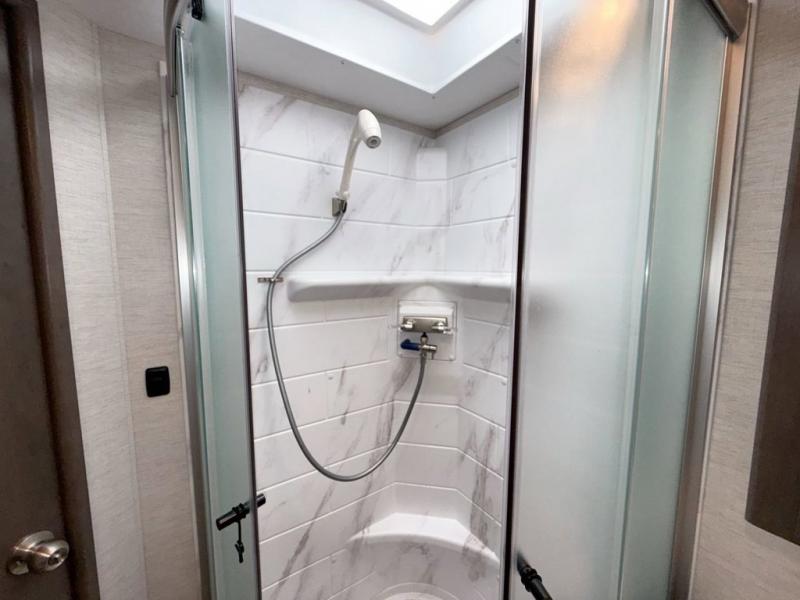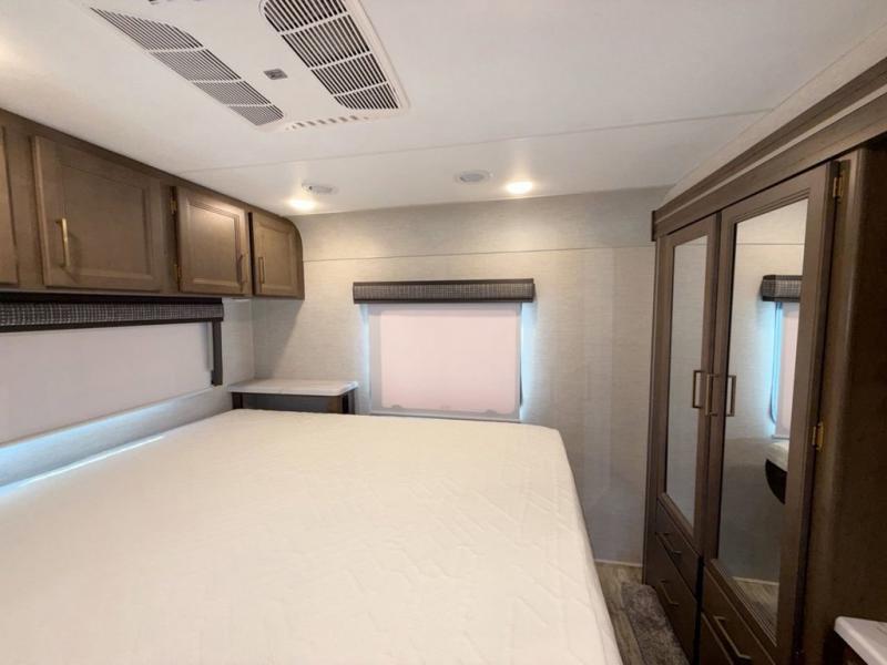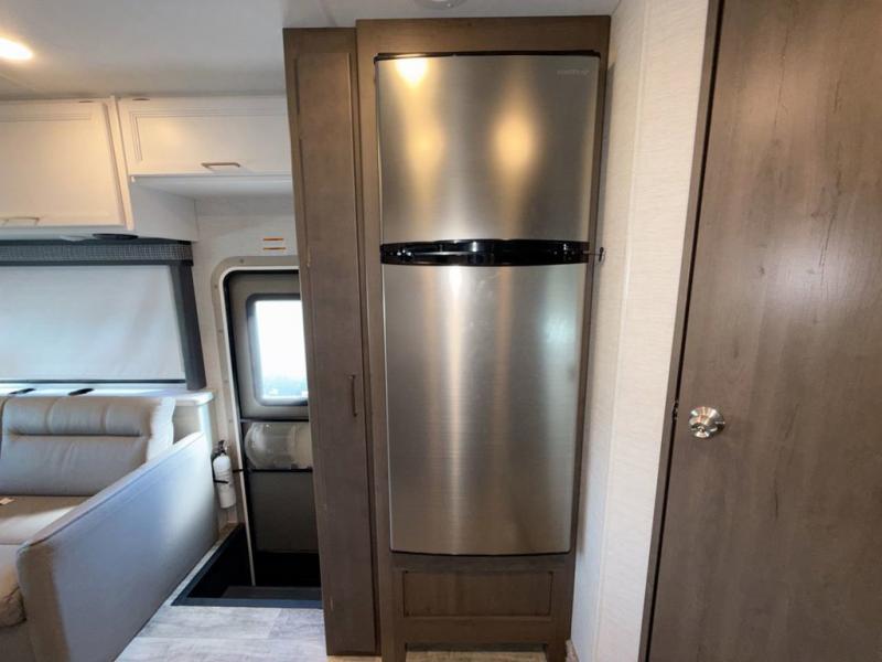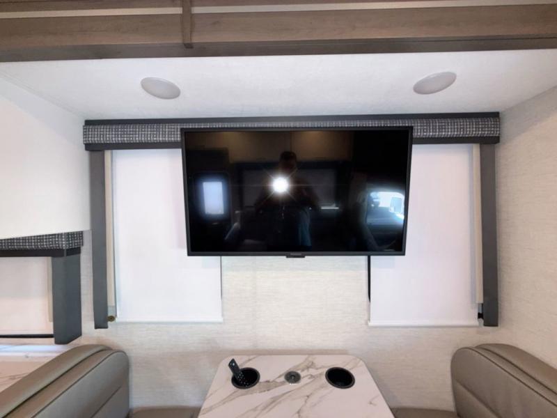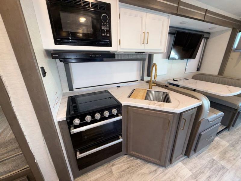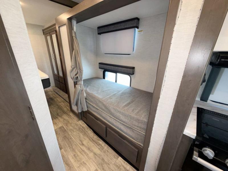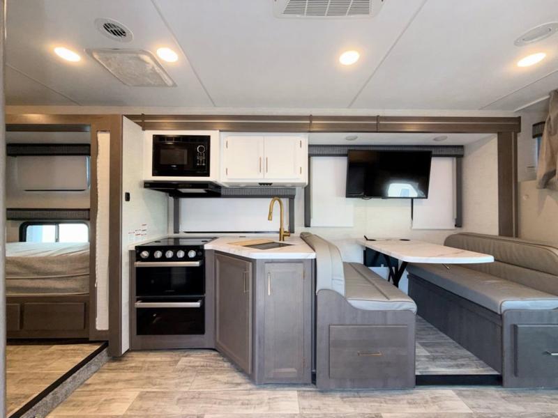 Bring the whole family with you in this motorhome! The grandkids can sleep on the set of 27" x 72" bunk beds, and you can sleep on the 60" x 75" queen bed in the rear private bedroom which also has a closet and dresser for your clothes and TV prep for entertainment. Plus, you can access the dual entry bathroom directly from the bedroom or the hallway next to the bunk beds. Relax in true comfort on the 68" jackknife sofa while you watch a movie on the 40" TV or play a few card games at the 71" Dream Dinette. There is also a 52" x 96" bunk over cab for even more sleeping space!