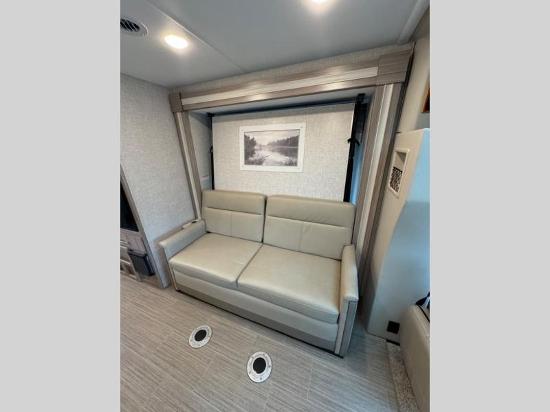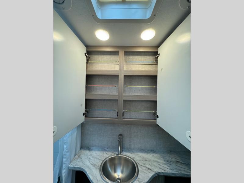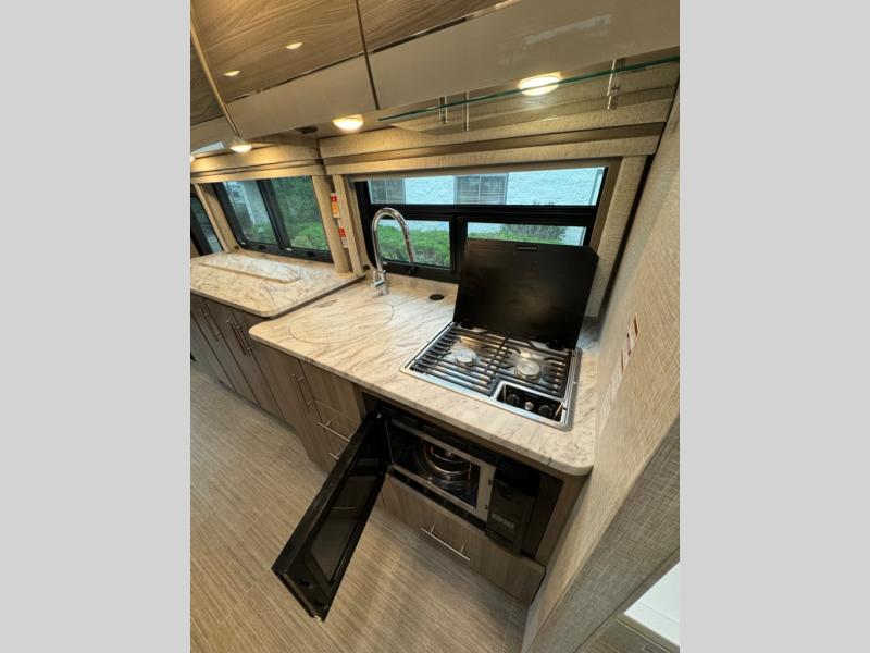 You'll have the perfect kitchen workspace in this Compass AWD Class B+ gas motorhome so that you can create plenty of home-cooked meals! There are pressed laminate countertops, a two-burner gas cooktop, task lighting above the cooktop, a convection microwave oven with an air fryer, a waste basket, and a ceiling vent. Because of the residential vinyl flooring, you'll have an easy time cleaning up after having guests over, and the wireless phone charger with USB plug next to the 39" retractable TV will get lots of use throughout your trips. The single slide holds the sofa with a pedestal table, and you can turn this sofa into a Murphy bed at night for a comfortable sleeping area.