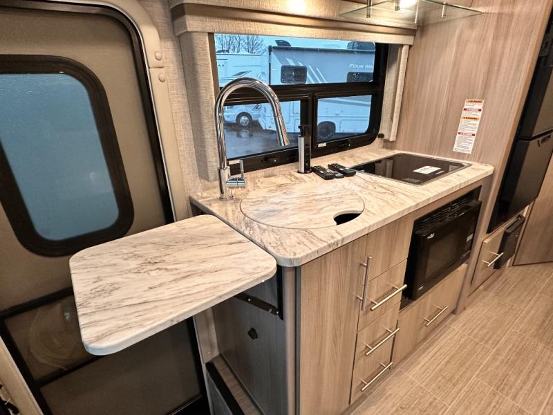 The Thor Motor Coach Compass AWD Class B+ gas motorhome is small but mighty! It includes all-wheel drive, and it is built upon a Ford Transit chassis, 3.5L V6 Eco Boost turbo gas engine, and Ford ten-speed automatic overdrive transmission. The Ford safety features provide excellent care while driving, and you can stay connected to your Compass AWD with the FordPass Connect. The power patio awning with LED lights can be moved out into position with just one touch on your cell phone thanks to the Rapid Camp+ multiplex control system. You will have a 100W solar panel with controller, a 15,000 BTU air conditioner, a Winegard ConnecT 2.0 Wi-Fi/4G/TV antenna, and a tankless water heater as some of the top electrical and plumbing features.