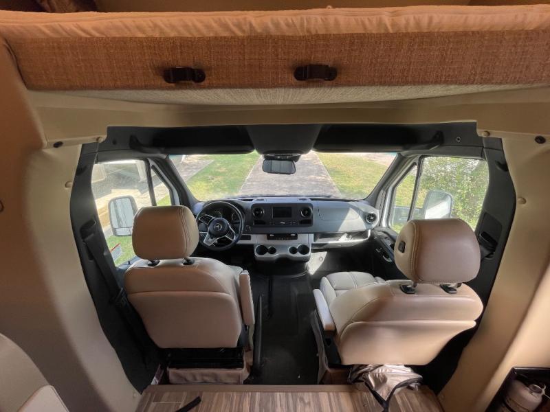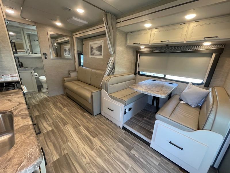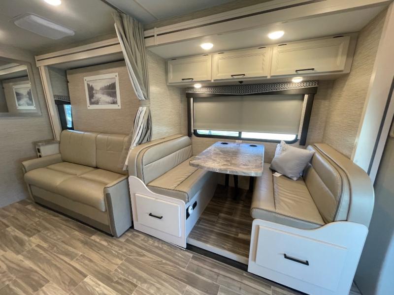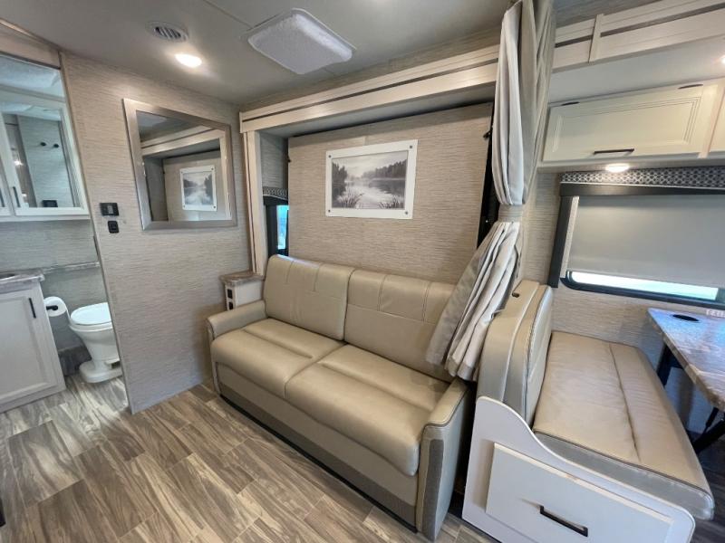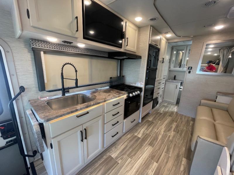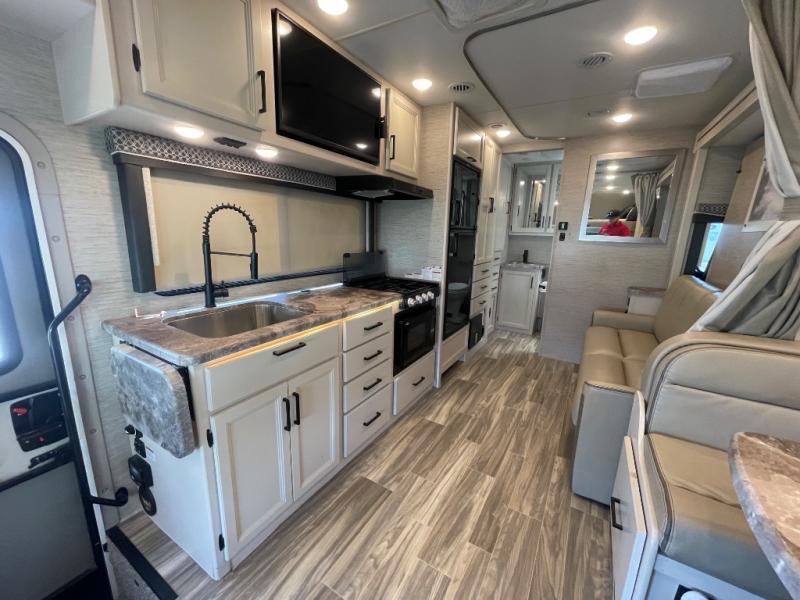 With any Four Winds Sprinter Class C diesel motorhome by Thor Motor Coach, you will have everything you need for unforgettable trips on the road! Each model is constructed with a durable one-piece fiberglass front cap, a welded tubular aluminum roof and sidewall cage, plus a slick fiberglass exterior with standard graphics package. You can put your own style on your coach by choose one of the optional partial paint or full-body paint choices, plus there two modern interior decor choices to choose from. The Mercedes-Benz sprinter chassis provides a strong foundation for each model, and the 3.0L V6 188HP engine will power your adventures both near and far. There is even a 5,000 lb. trailer hitch if you need to tow a jet ski or fishing boat. A 100-watt solar charging system comes standard, along with a 4.0 kw LP generator, a tankless water heater, a 12-volt lithium house battery, plus many more utilities to make each trip hassle-free. Step inside to find residential vinyl flooring, decorative glass inserts in the kitchen overhead cabinets, Leatherette furniture, and pressed laminate countertops to name a few comforts!