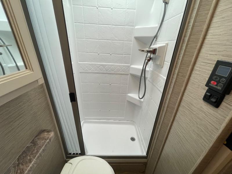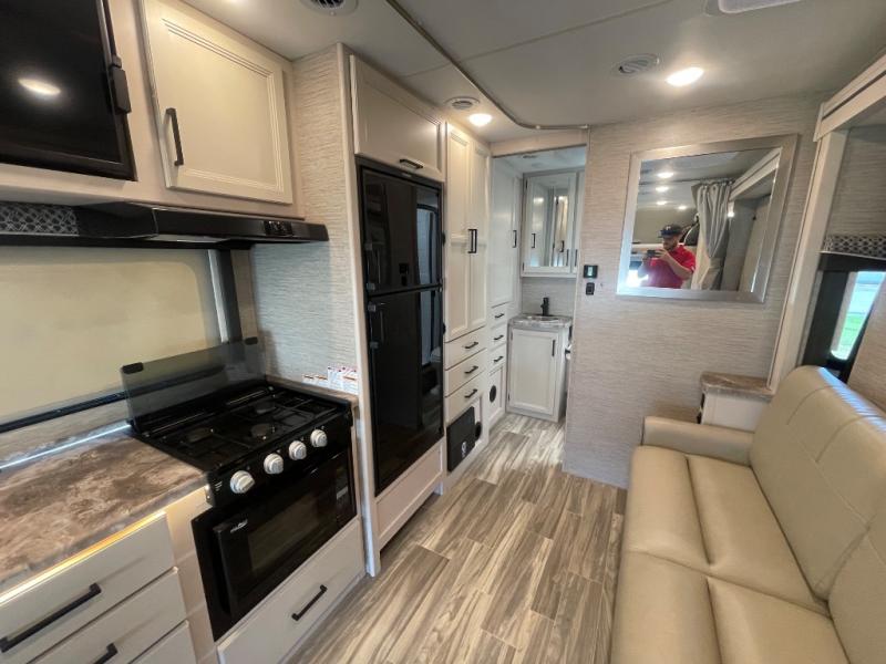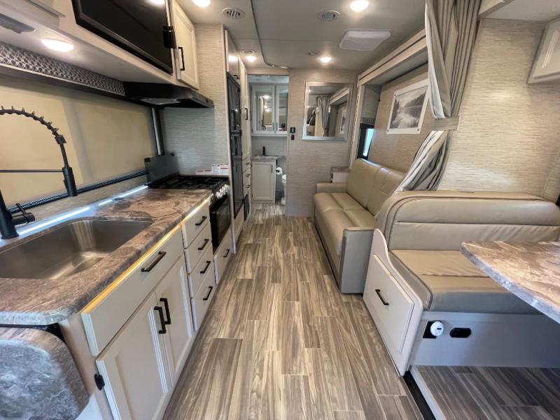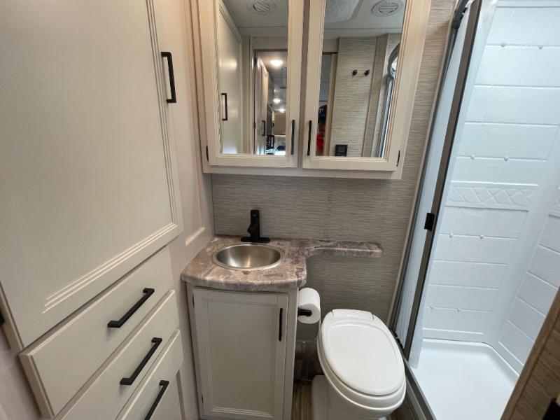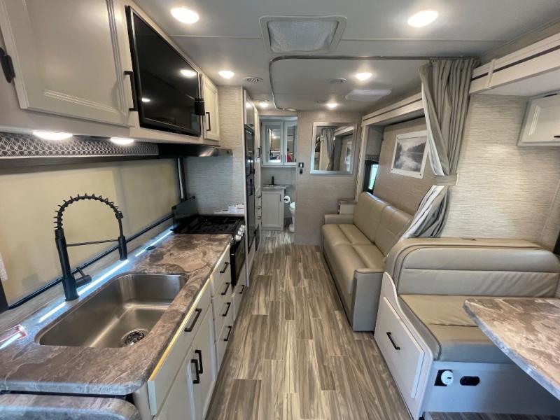 Travel comfortably in this Class C motorhome with a thoughtful layout including a Murphy bed for comfort at night and added floor space during the day. When you close up the Murphy bed you will have a sofa in its place. A 71" Dream Dinette allows for added seating during mealtime and for game playing, and it also can transform into sleeping space at night. Plus, you will have a 52" x 87" cab-over bunk that sleeps two adults or children as well. All will enjoy the full rear bath with a space saving sliding door for privacy. Inside, there is a 24" x 36" shower plus a nice size closet for your clothing. A full kitchen including a 3 burner cook-top and convection microwave with an air fryer, plus ample counter space for food prep and a single bowl sink make it easy to provide meals while you travel.