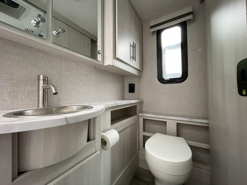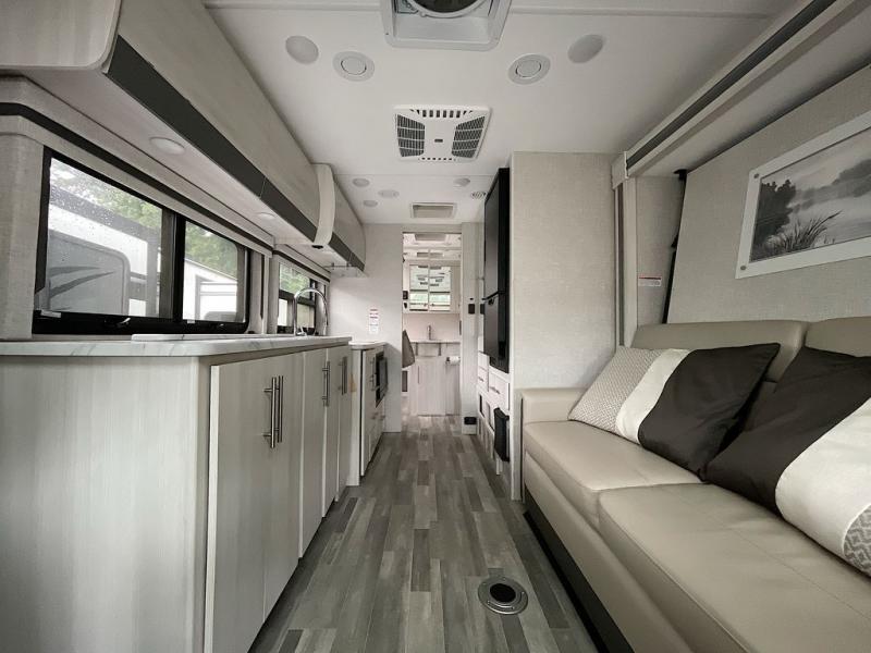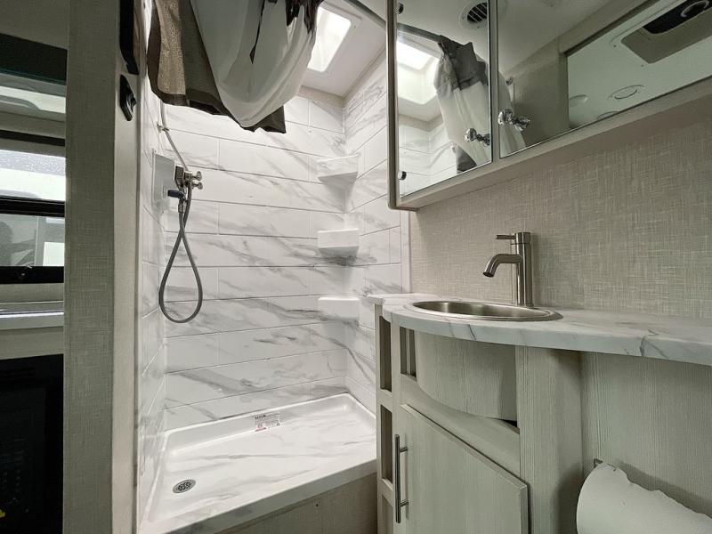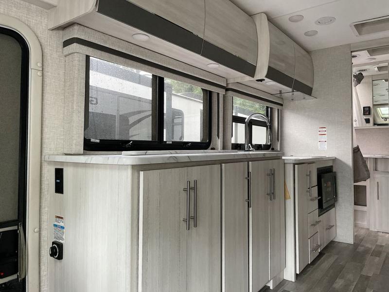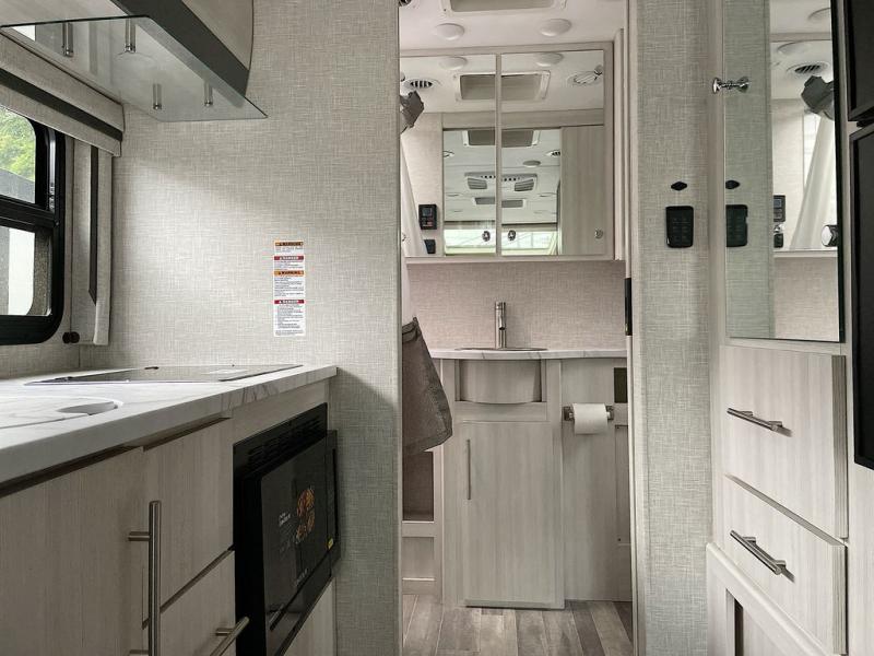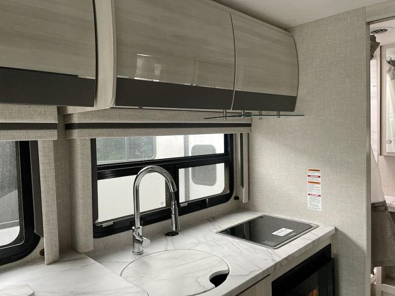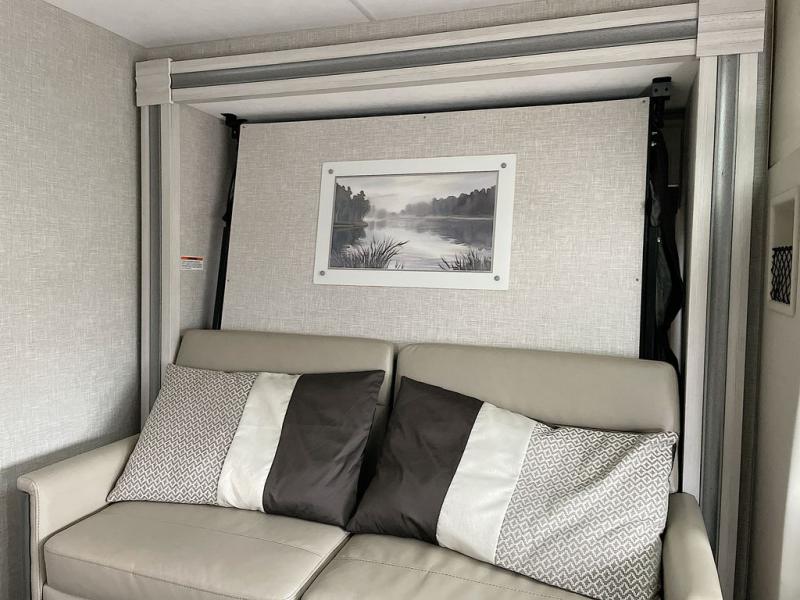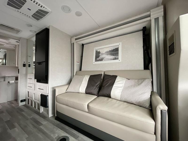 Pack your bags and fuel up this motorhome for a great vacation getaway! Enjoy a good night's rest each night on the 60" x 74" Murphy bed slide and sit on the sofa during the day with a pedestal table to set your drinks. You can prepare your best home cooked meals with the electric start two burner gas cooktop or heat up some leftovers in the convection microwave oven with an air fryer. The front built-in skylight lets in more natural lighting and makes it easier to see the retractable 39" TV. Freshen up each day in the full rear bathroom with a 24" x 36" shower and linen closet to keep your towels close by, plus there is a wardrobe just outside the bathroom to keep your clothes looking nice!