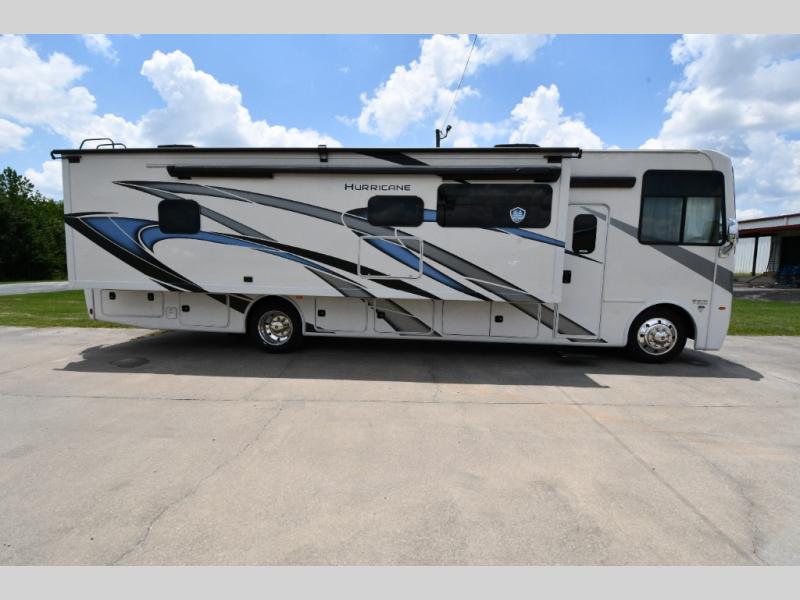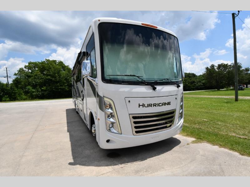 Experience spacious comfort and modern convenience in this low-mileage Hurricane 34R Class A motorhome.