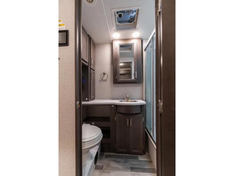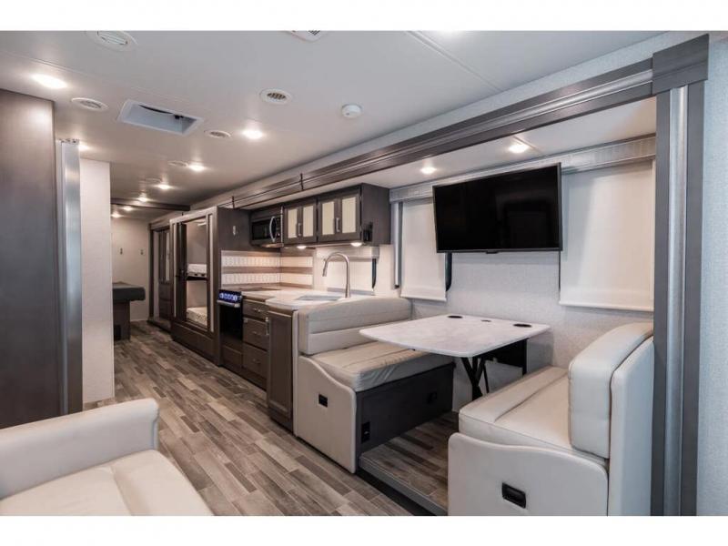 The Indigo BB35 Class A gas motorhome is super spacious featuring a full wall slide along the roadside and with the added pair of bunk beds increases the sleeping capacity to ten! A drop-down bunk over the cab has a 48" x 74" sleeping area, plus there's the dream dinette and a sofa bed in the living area. You will also love the rear master bedroom which features a spacious king bed and plenty of storage, plus a 32" TV above the dresser. A sliding door to the master conserves floor space so there's room to walk around the entire bed as well as having the closet and dresser as part of the full slide giving you a nice space to get away from it all. If you're thinking about feeding all those guests, no worries! Choose from the fully equipped kitchen with three-burner gas cooktop and oven, convection microwave and residential refrigerator, or step outside and cook in the fresh air at the exterior kitchen. You can even enjoy the 32" exterior TV while you're out there!