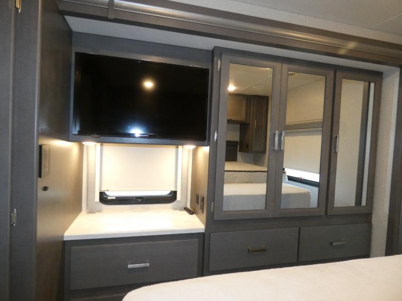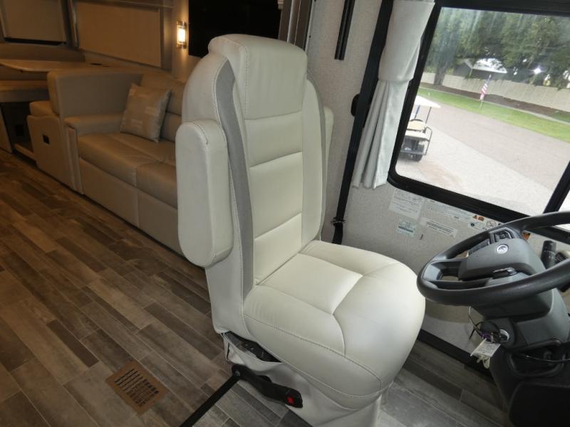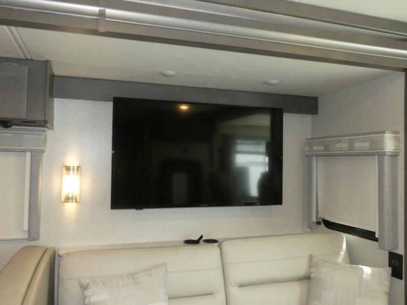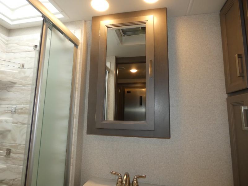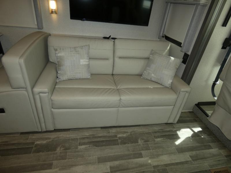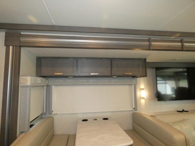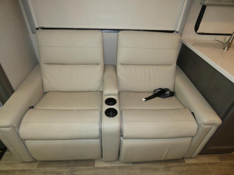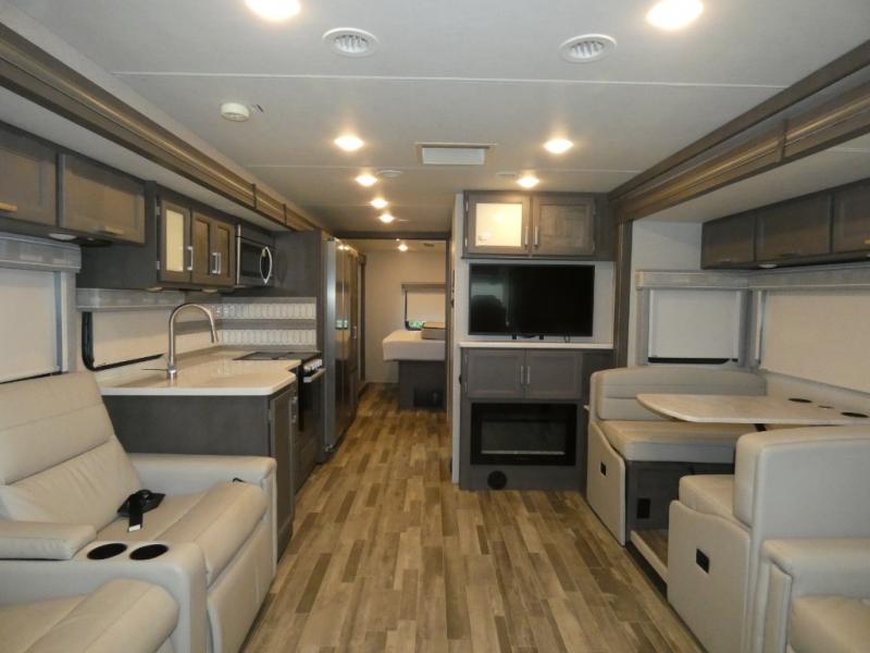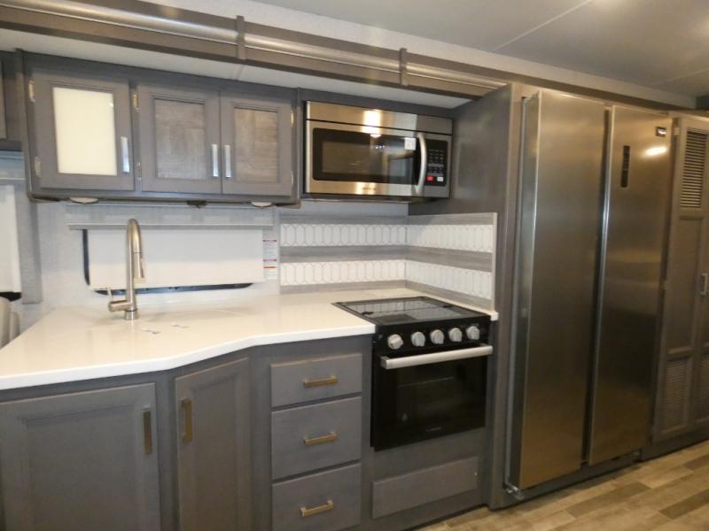 This spacious Class A motorhome has room to sleep eight! Enjoy the privacy of the rear king bedroom which has a spacious closet and a 32" LED TV. Extra guests can utilize the dream dinette, the sofa bed, or the drop-down overhead bunk which has a Cotton Cloud mattress for comfort. As if that's not enough, there's a pair of leatherette theater seats with footrests so you can kick back and watch either of the two living room TVs. You'll also find another TV outside. A full bath with 30" x 36" shower is conveniently located in the center so everyone has access, and the glass shower door and skylight make it feel roomy. The kitchen features a three-burner gas cooktop and oven, refrigerator, stainless steel convection microwave, and pantry.