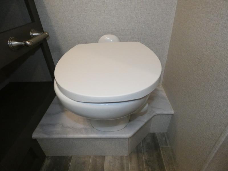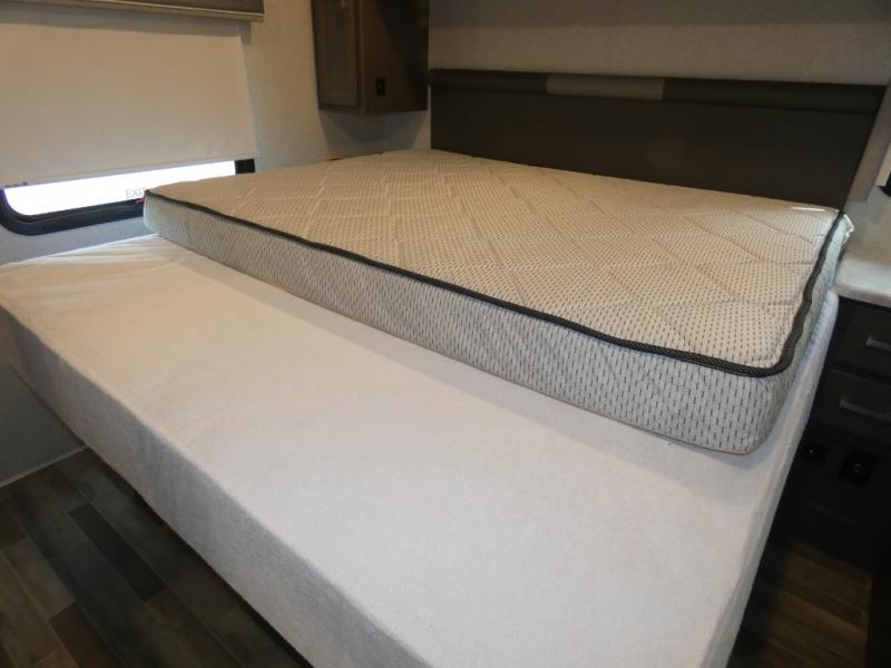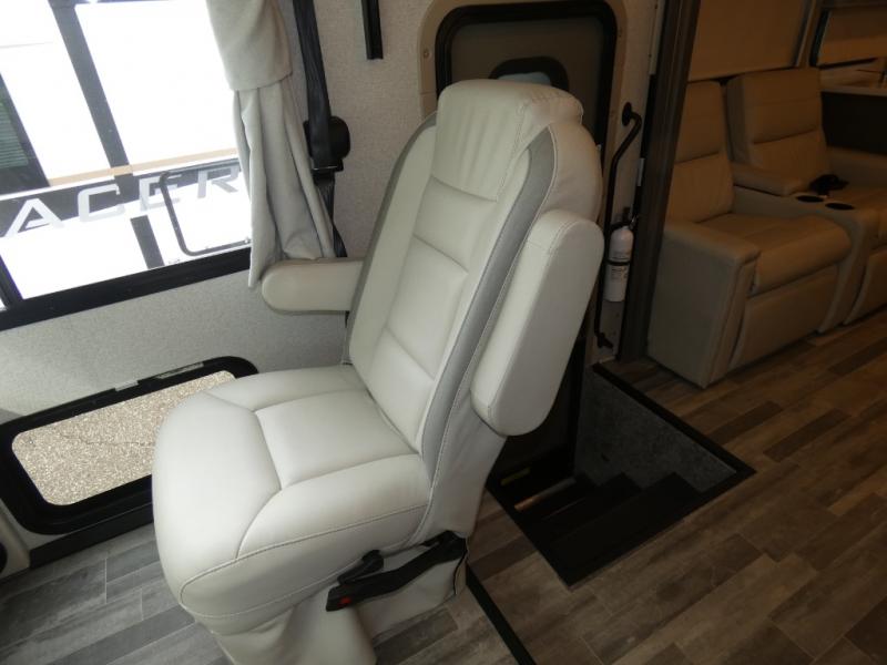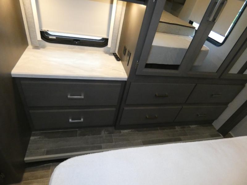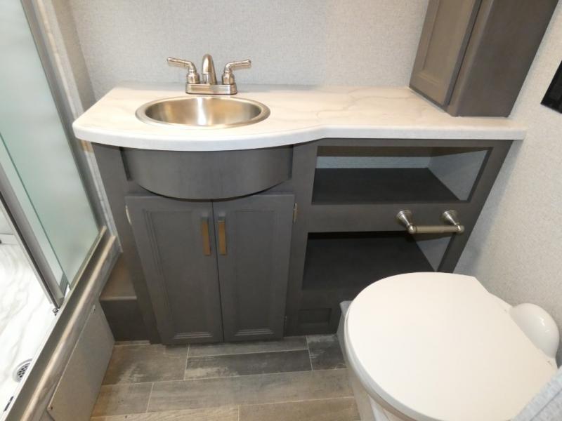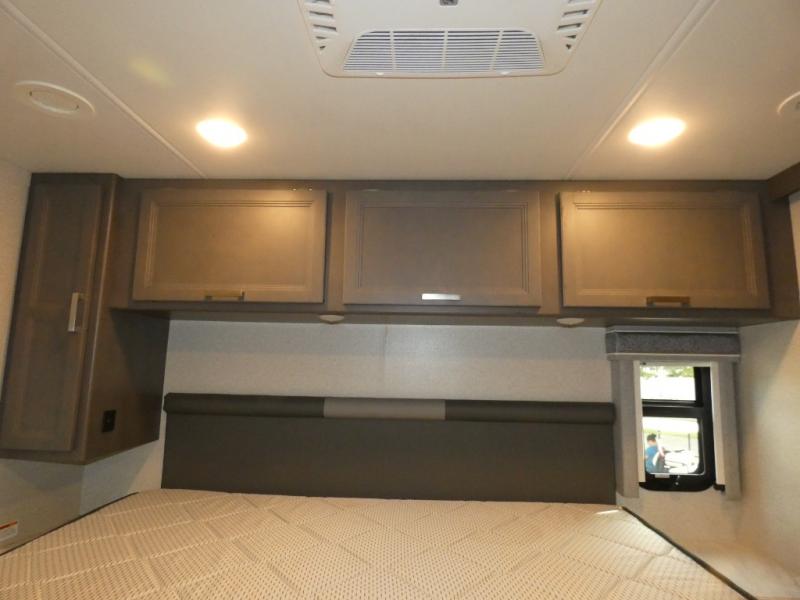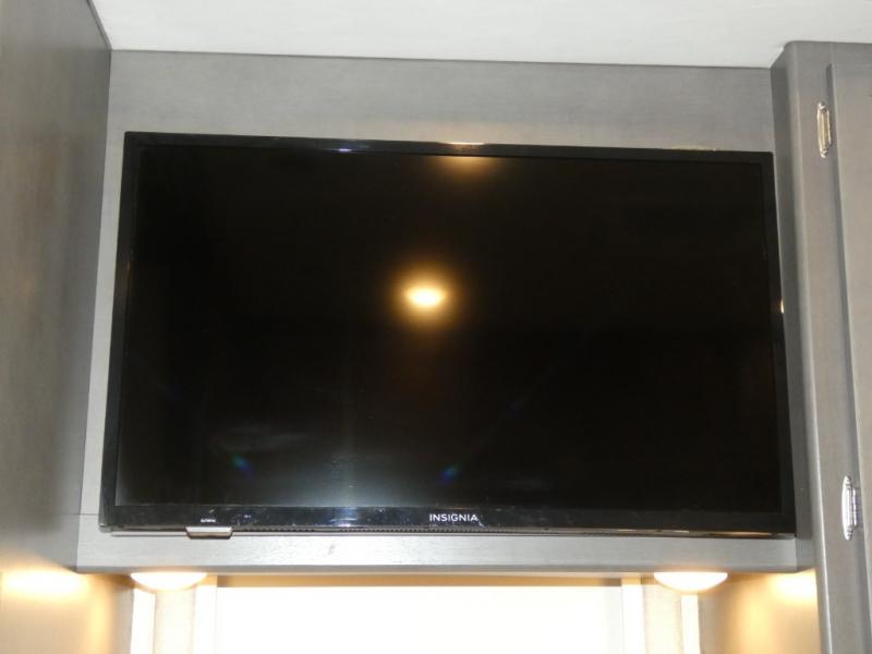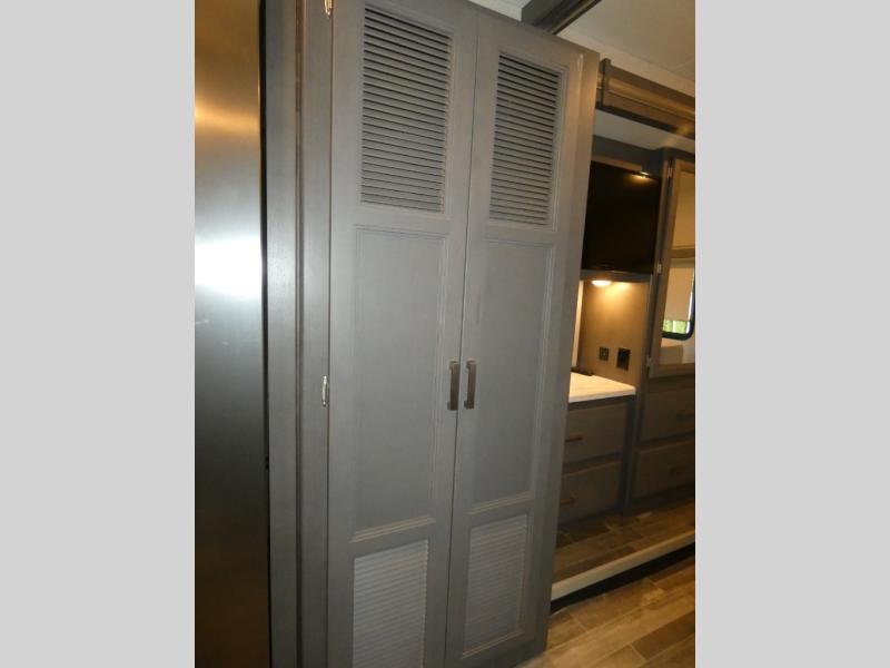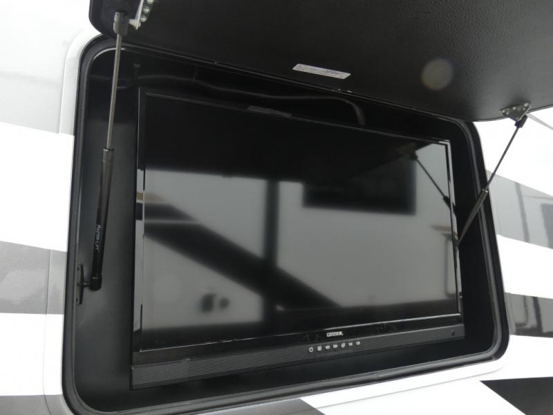 This spacious Class A motorhome has room to sleep eight! Enjoy the privacy of the rear king bedroom which has a spacious closet and a 32" LED TV. Extra guests can utilize the dream dinette, the sofa bed, or the drop-down overhead bunk which has a Cotton Cloud mattress for comfort. As if that's not enough, there's a pair of leatherette theater seats with footrests so you can kick back and watch either of the two living room TVs. You'll also find another TV outside. A full bath with 30" x 36" shower is conveniently located in the center so everyone has access, and the glass shower door and skylight make it feel roomy. The kitchen features a three-burner gas cooktop and oven, refrigerator, stainless steel convection microwave, and pantry.