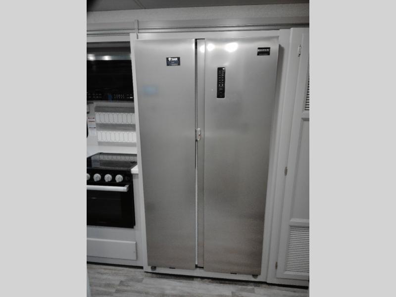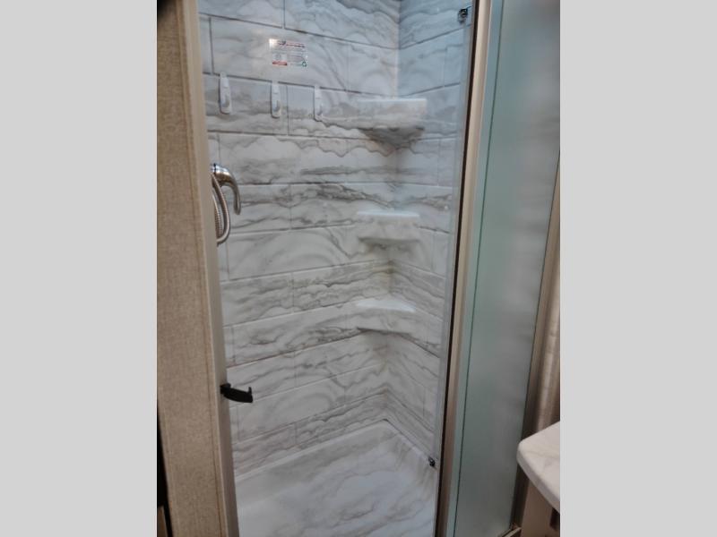 This spacious Class A motorhome has room to sleep eight! Enjoy the privacy of the rear king bedroom which has a spacious closet and a 32" LED Smart TV. Extra guests can utilize the Dream Dinette, the sofa bed, or the drop-down overhead bunk which has a Cotton Cloud mattress for comfort. As if that's not enough, there's a pair of leatherette theater seats with footrests so you can kick back and watch either the 39" or 50" LED Smart TV in the living room. You'll also find another TV outside. A full bath with 30" x 36" shower is conveniently located in the center so everyone has access, and the glass shower door and skylight make it feel roomy. The kitchen features a three-burner gas cooktop and oven, refrigerator, and stainless steel convection microwave. You will also appreciate the closet with stackable washer and dryer prep if you want to add those appliances!