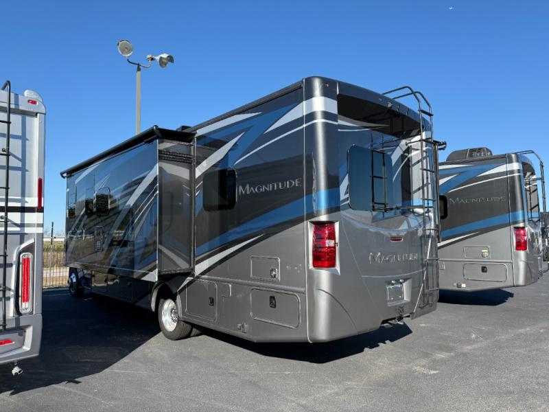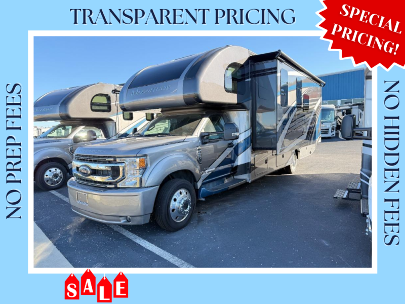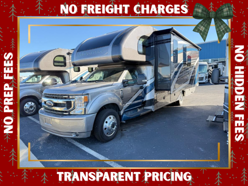 Make your journeys fantastic with the Thor Motor Coach Magnitude Super C diesel motorhome! Each model features a 4 x 4 engine, allowing you to tackle tough terrain! The powered sky view shade above the cab area will let you feel the sun's rays while you travel down the road, and the rearview mirror with a backup monitor, AM/FM and SiriusXM radio, and 8" color LCD touchscreen will make the drive that much easier. The 7' interior ceiling will accommodate passengers of any height, and the residential linoleum throughout will be easy to keep clean. The dual 13,500 BTU roof air conditioners will keep you cool on the hottest days in summer, and the Onan RV QD diesel generator will power your coach and all of its electrical functions. You will also find a Winegard® ConnecT™ Wi-Fi extender + 4G & TV antenna so you can stay connected wherever you roam!