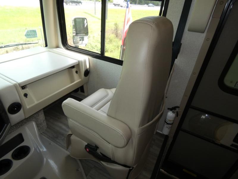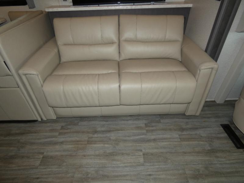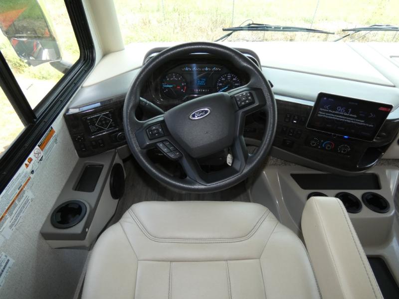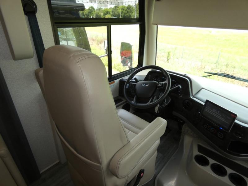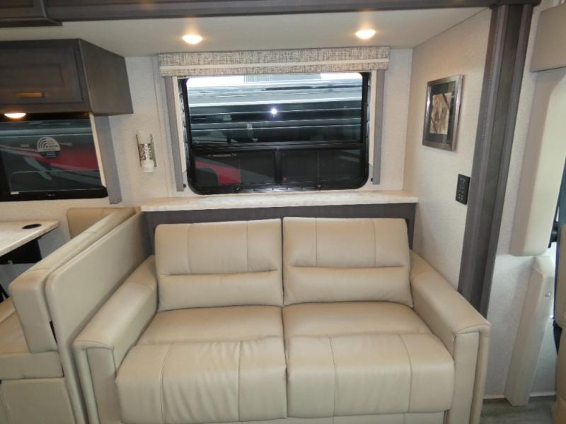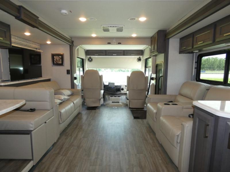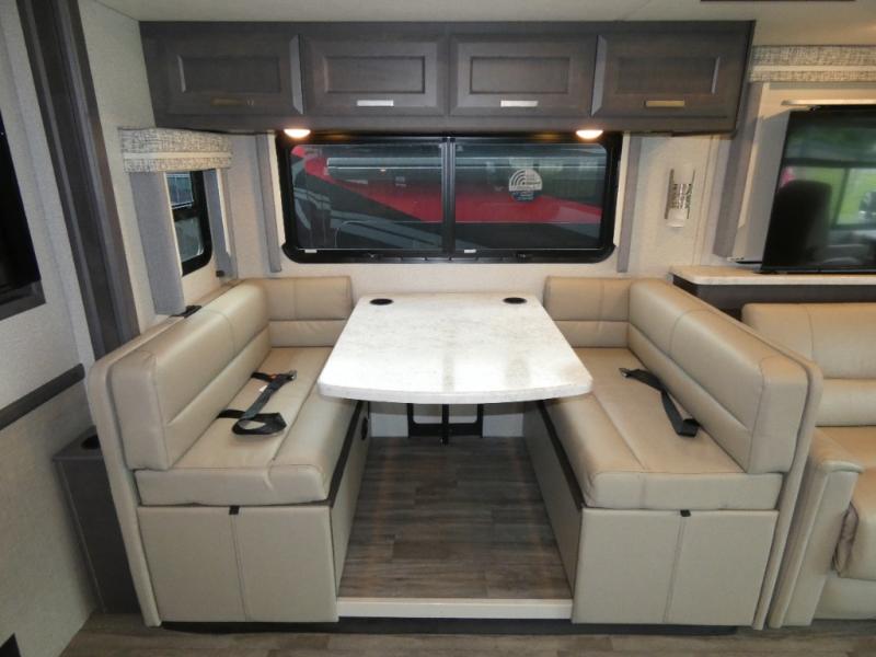 With any Miramar Class A gas motorhome by Thor Motor Coach you will find a durable welded tubular aluminum roof and sidewall cage construction, rotocast storage compartments, and frameless windows for a more sleek look. The 100-watt solar charging system with a power controller will allow you to do some off-grid camping, and you'll have an Onan RV QG 5500 gas generator on board for all your power needs. Each model includes the Rapid Camp+ multiplex wiring control system for quick and easy set up, and the Winegard ConnecT WiFi extender +4G will be perfect if you need to telecommute. Inside you'll find residential vinyl flooring, leatherette furniture, plus solid surface kitchen countertops for a truly luxurious coach!