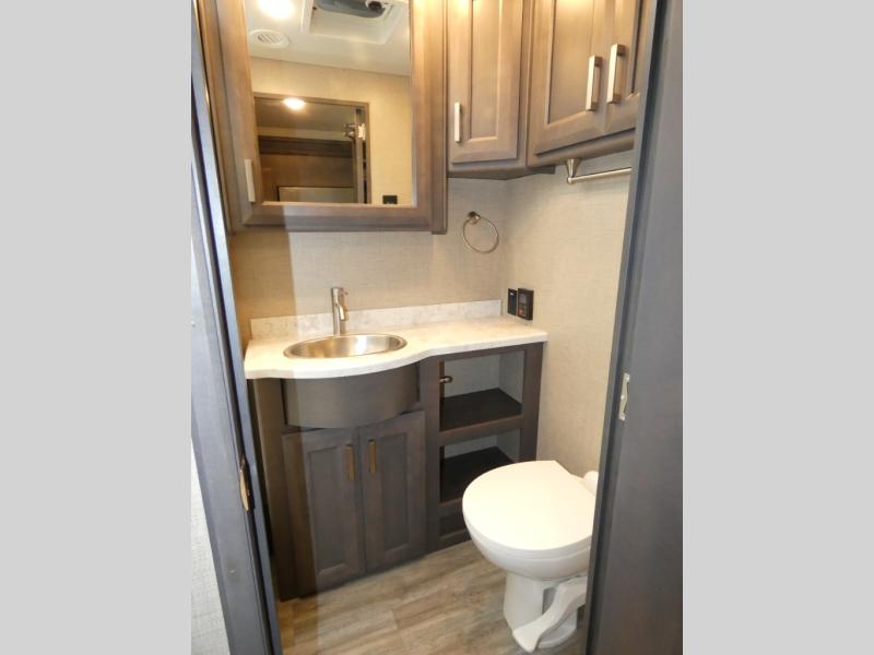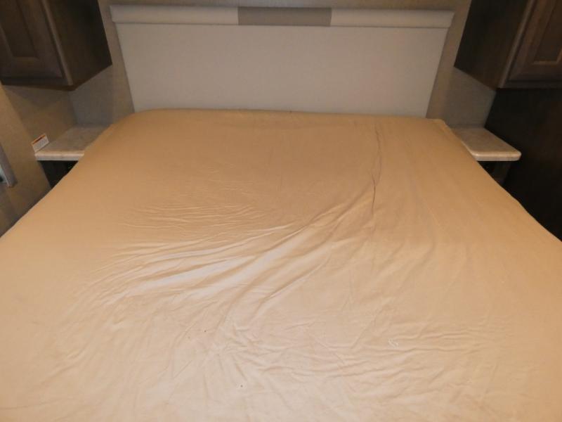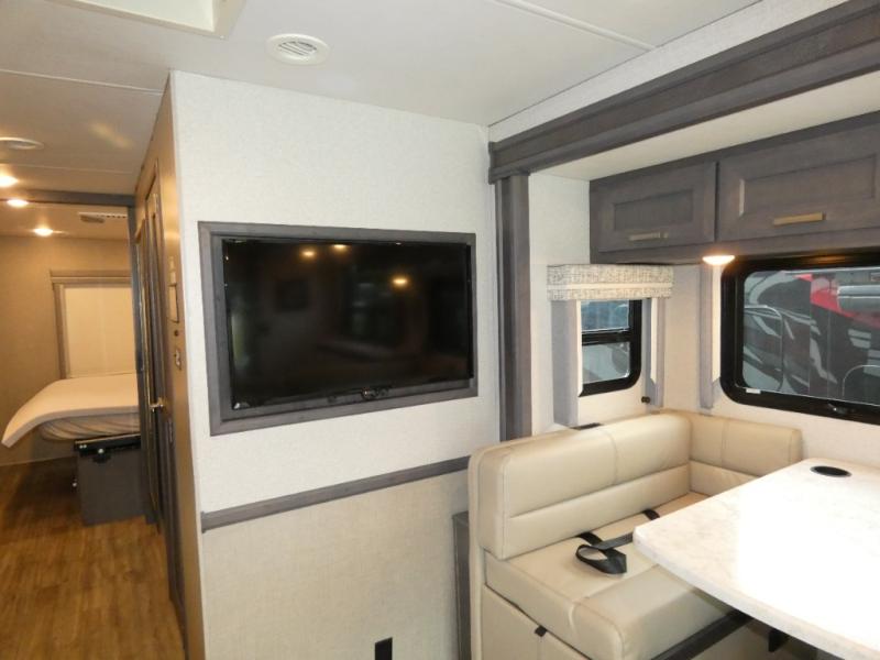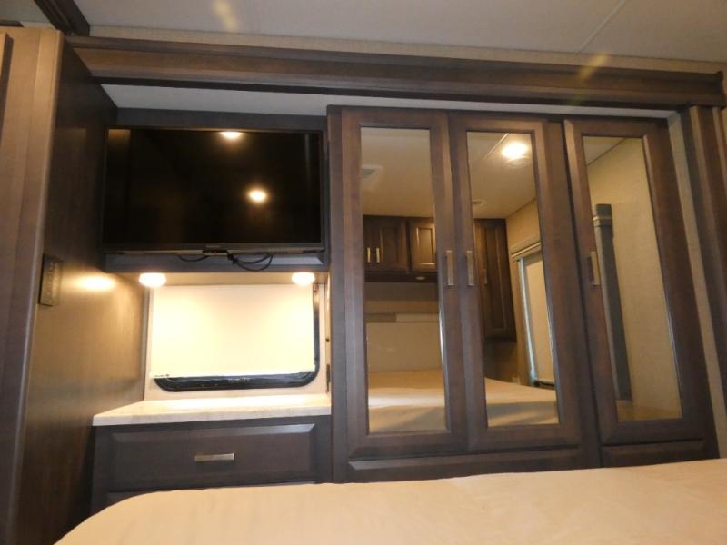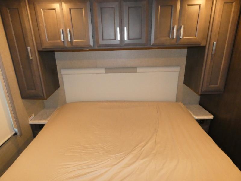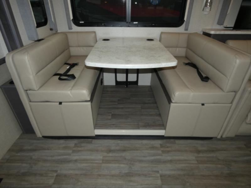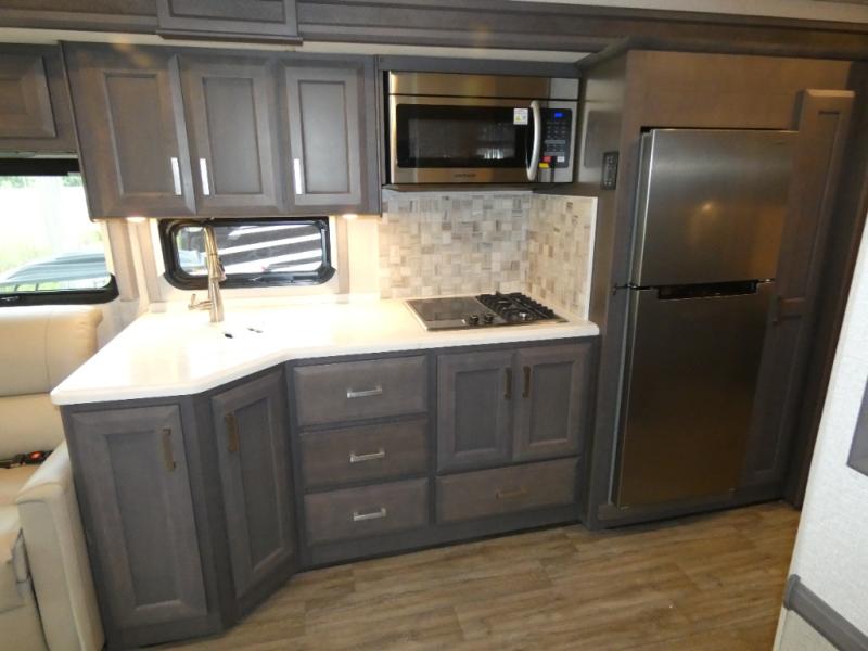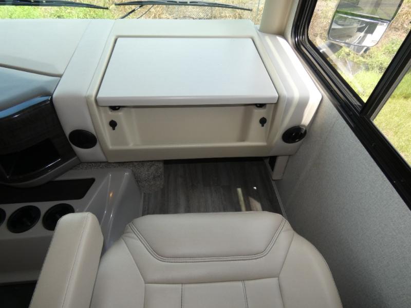With any Miramar Class A gas motorhome by Thor Motor Coach you will find a durable welded tubular aluminum roof and sidewall cage construction, rotocast storage compartments, and frameless windows for a more sleek look. The 100-watt solar charging system with a power controller will allow you to do some off-grid camping, and you'll have an Onan RV QG 5500 gas generator on board for all your power needs. Each model includes the Rapid Camp+ multiplex wiring control system for quick and easy set up, and the Winegard ConnecT WiFi extender +4G will be perfect if you need to telecommute. Inside you'll find residential vinyl flooring, leatherette furniture, plus solid surface kitchen countertops for a truly luxurious coach!