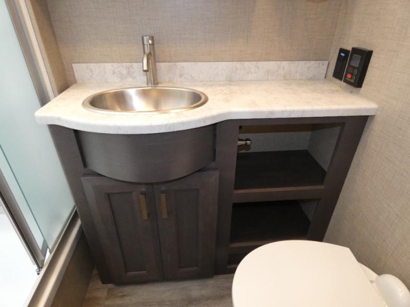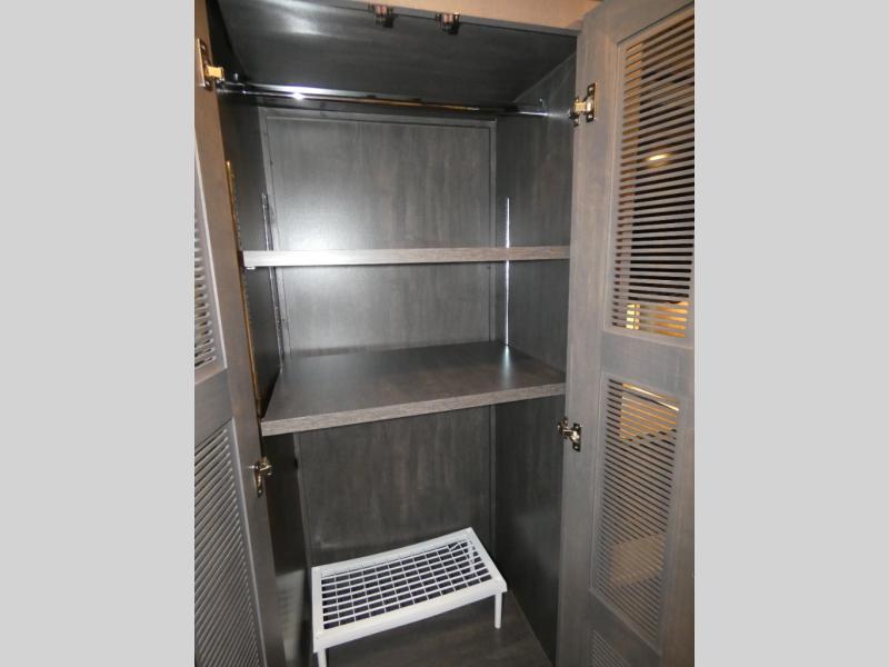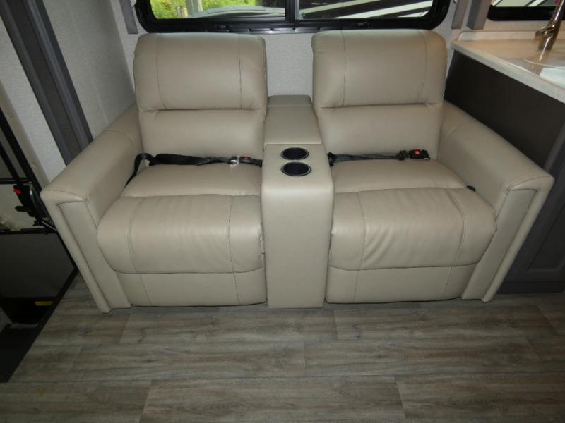 Make yourself at home in this double slide out coach! When you arrive at your destination, set up the the 20' power awning with LED lights and enjoy the 40" exterior TV. You can prepare lunch on the two burner single induction cooktop, or use the stainless steel convection microwave, and there is a Dream Dinette to dine at. You'll also find 67" theater seating across from the retractable 50" LED TV to watch your favorite shows. You're going to love the rear bedroom with its Tilt-A-View inclining king bed that will allow you to read a book in bed, plus there is a 32" TV and a closet to store your belongings. And this coach wouldn't be complete without stackable washer and dryer prep!