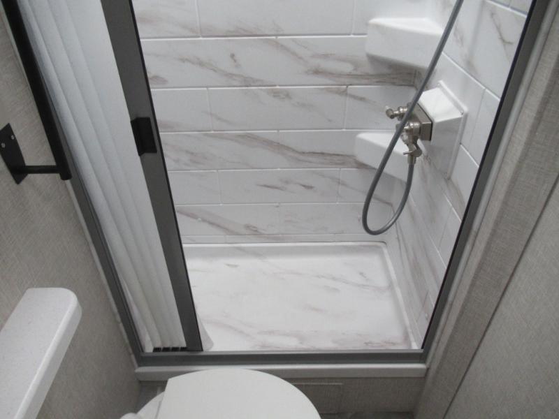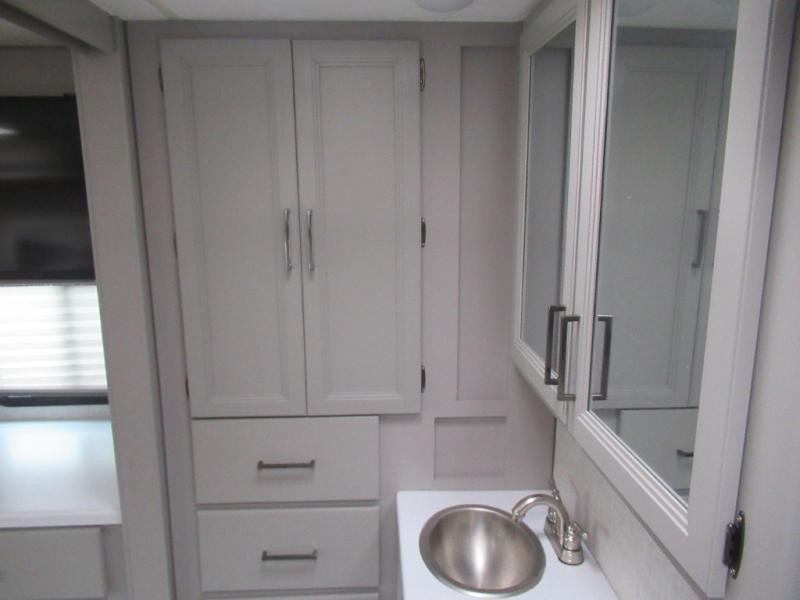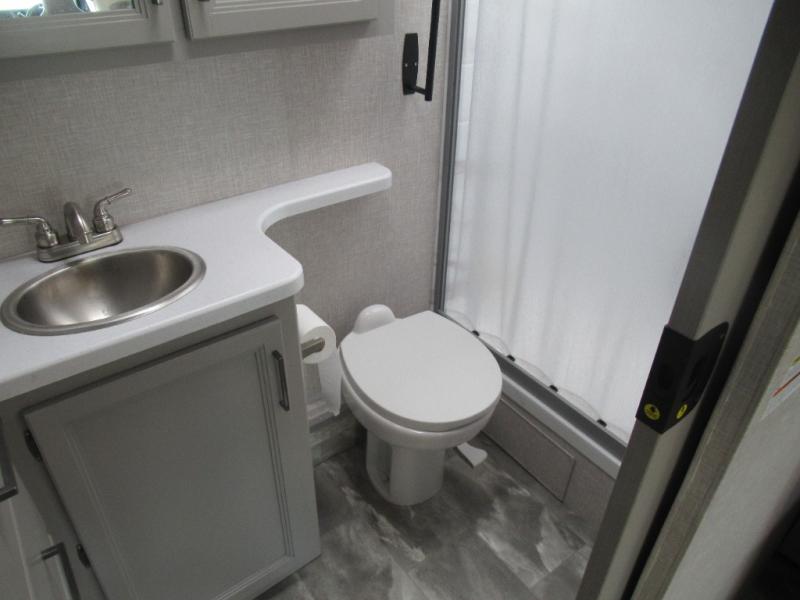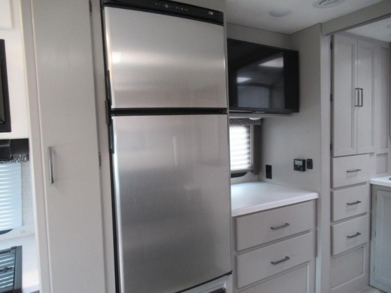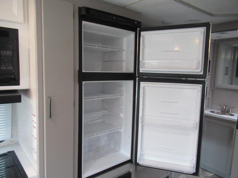 You're going to love the amount of space in this coach thanks to the large slide out. Here, you'll find the leatherette Dream Dinette and the sofa with a Murphy bed for versatility. There is even a privacy curtain around the bed so you can enjoy your own space at night. The full-equipped kitchen includes a 12V refrigerator, a microwave oven, plus a three burner cooktop with an oven and glass cover for more counter space. This model also includes a 39" TV with a swivel in the cab-over, plus a 32" TV across from the bed, and an optional 32" exterior TV so you'll never go bored. If you'd rather have a Chevy chassis, you can choose that option!