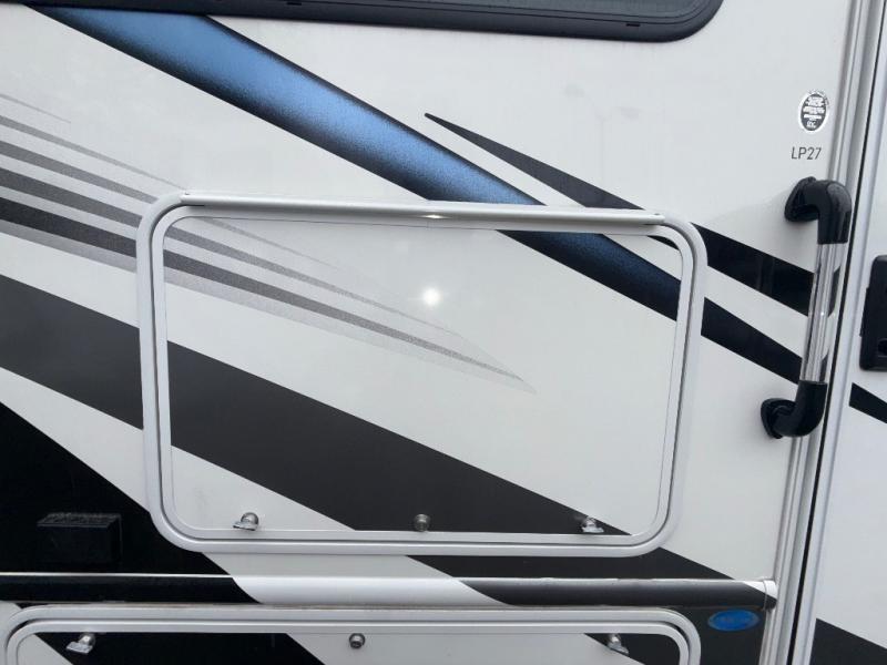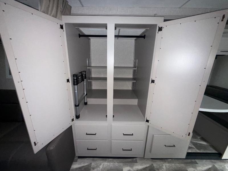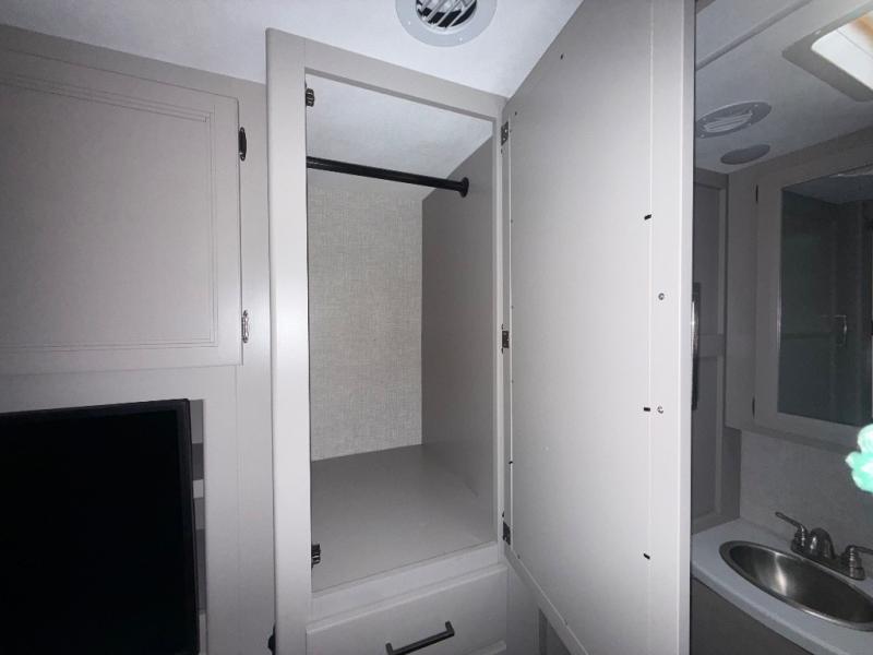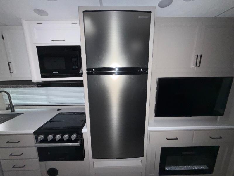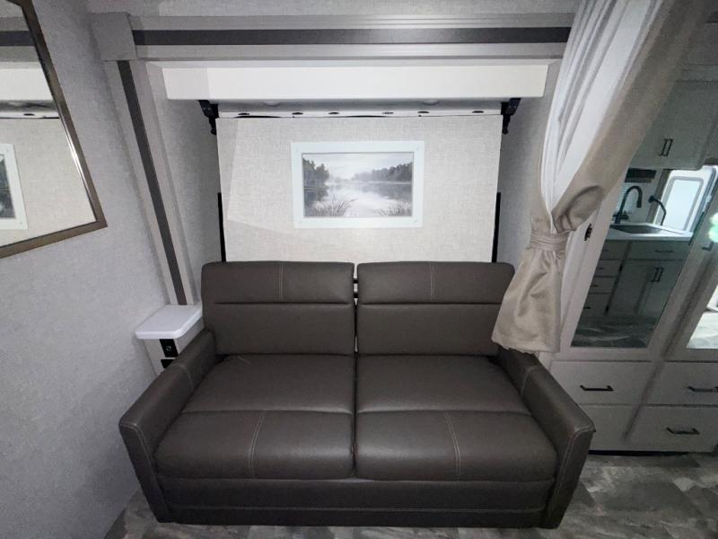 One step inside this coach and you'll be sold! The full-wall slide opens up your whole living space so it feels more open. You'll find the Dream Dinette, sofa with a Murphy bed, and two closets here for added convenience. There is even a fireplace to make it feel a little more like home and a privacy curtain around the bed if you have guests sleeping on the cab-over bunk or dinette! A three burner cooktop and microwave oven will allow you to make meals each day, and the 12V refrigerator can hold all your perishables. And don't over look the full rear bath with a foot flush toilet, shower skylight, and bath linen closet for clean towels!