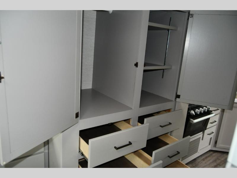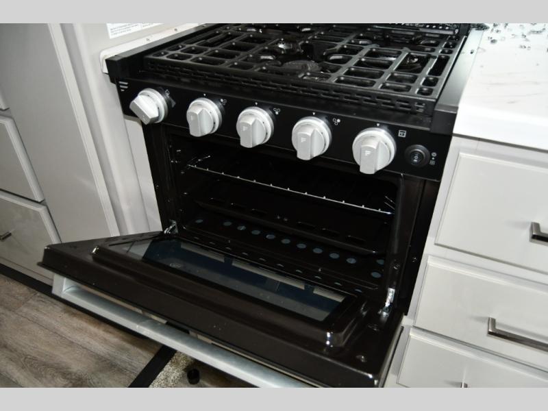 The kitchen is designed to make travel easy and enjoyable, featuring solid-surface countertops, a cooktop, microwave, refrigerator, and ample cabinet storage. Whether you’re preparing quick snacks or full meals, this kitchen provides the convenience and functionality needed for life on the road.
