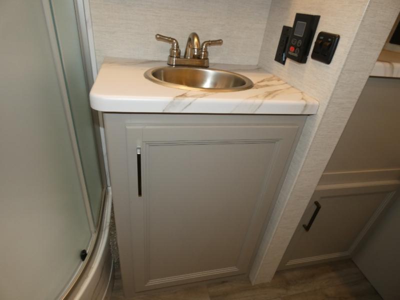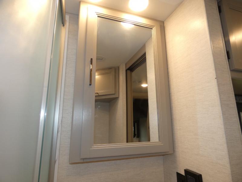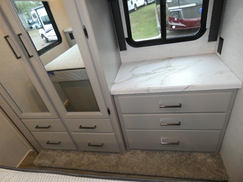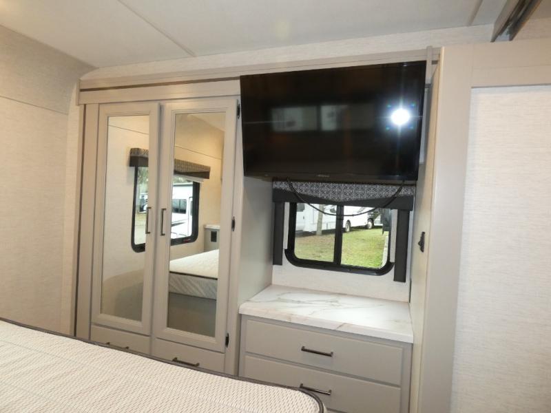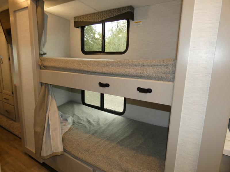 Oh the fun you will have traveling in this Quantum SE motorhome! Sleeping for at least eight and safe traveling for seven makes this the perfect home-on-wheels! This unit is very similar to it's sister model SE31 but replaces the closet within the full-wall slide with a set of bunk beds perfect for young teens or little ones. The full bathroom also offers double entry making it easily accessible from the rear private bedroom space that can be closed off by a sliding door. You will love the privacy and RV queen-sized bed, plus there will be plenty of closet space for clothing. Up front, you will find more storage in overhead cabinets and the pantry for your dry and canned goods. The full-wall slide also offers much appreciate space for hanging out and dining which includes a 71" Dream Dinette and theater seats.