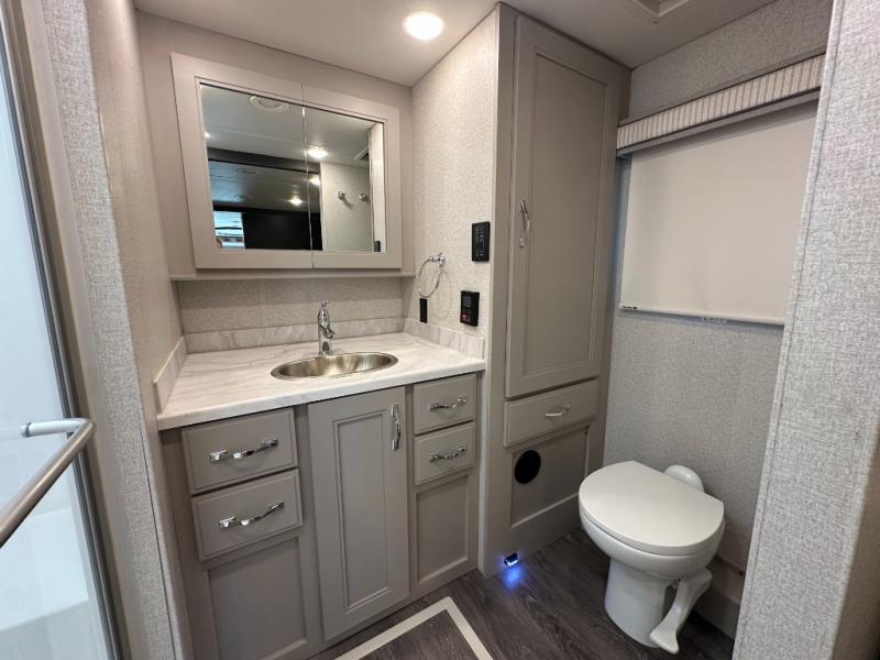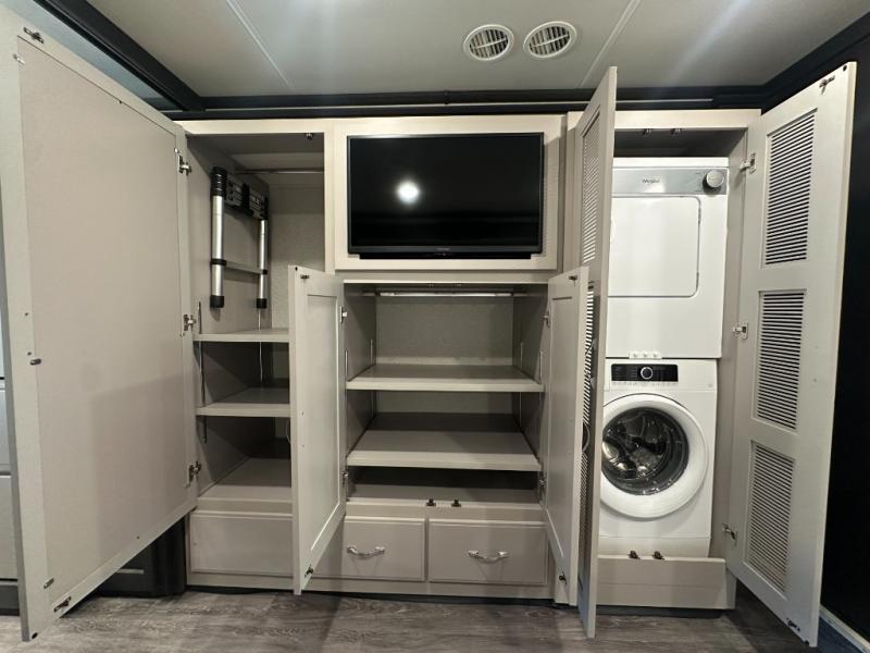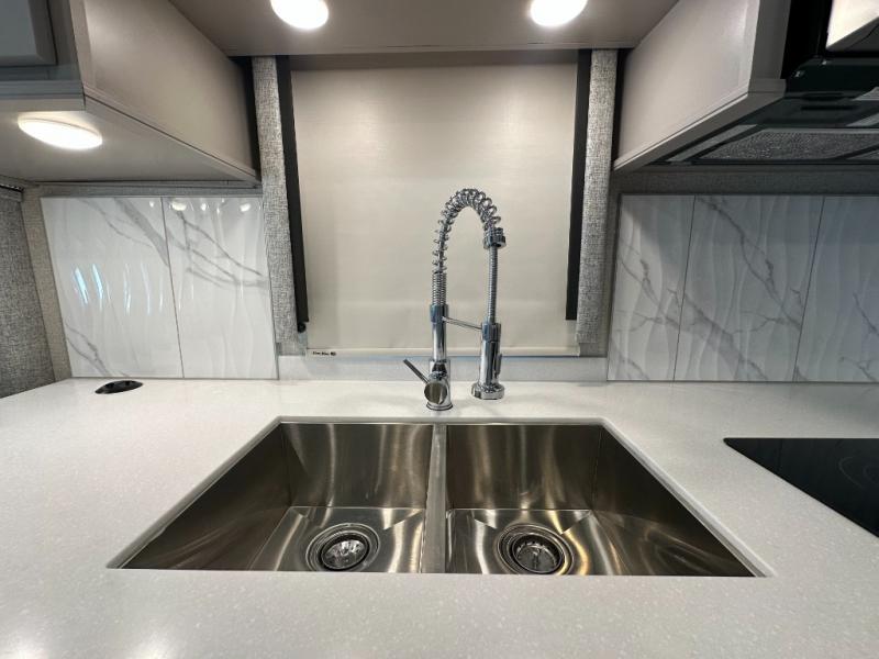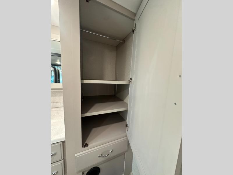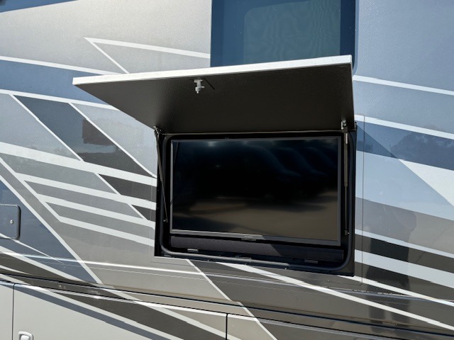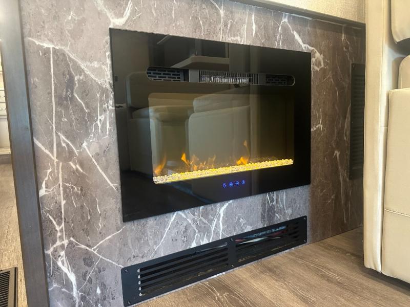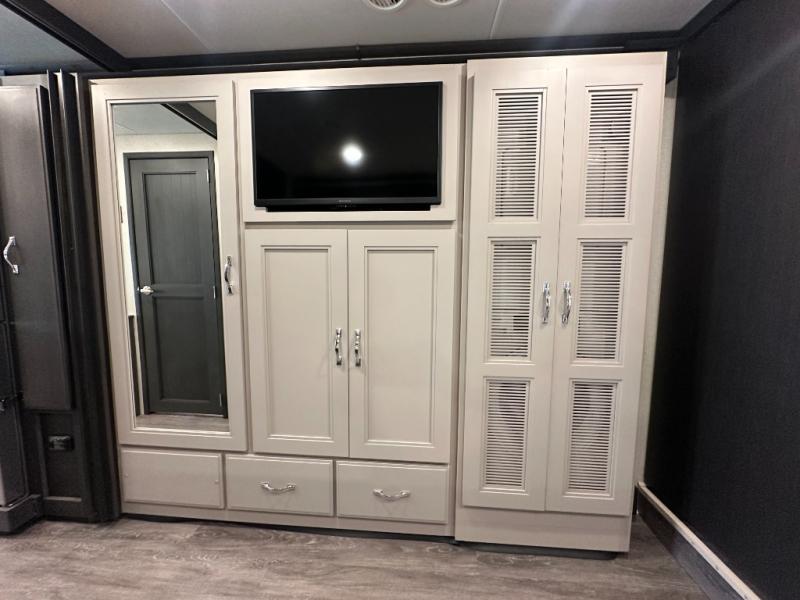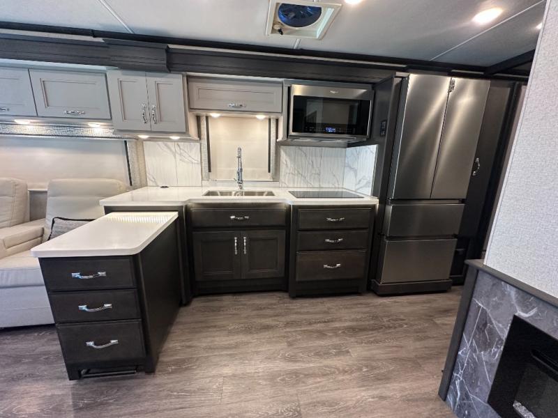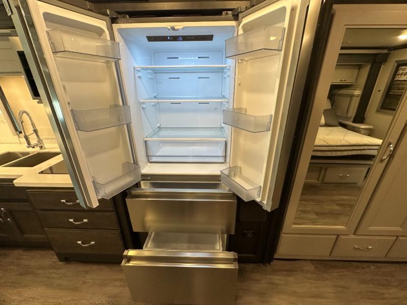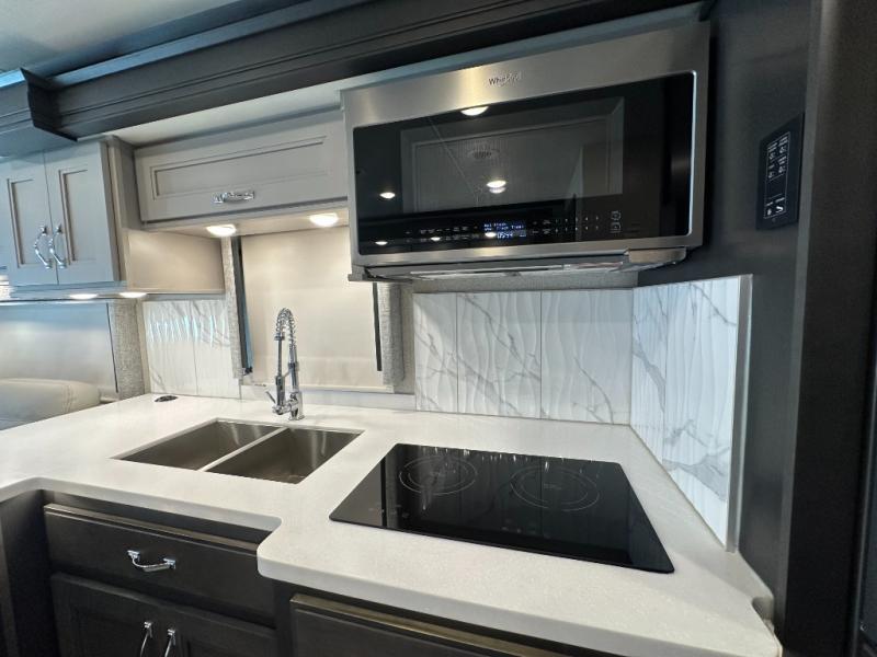 If you're traveling and camping with friends and family, this coach is sure to come in handy with its triple slides and a bath and a half! Once you arrive at the campsite, set up the 20' power lateral arm awning with LED lights, unpack your gear from the pass-through storage, and watch the game with the exterior 40" LED TV. If you'd rather enjoy some time inside, you'll find the 68" theater seating across from the 50" TV to be accommodating, plus there is a 68" sofa and a 72" Dream Dinette for more seating space! This Riviera kitchen includes a pull-out countertop for more prep space, a two burner electric induction cooktop, plus a pantry and a 15.7 cu. ft. French Door residential refrigerator for food storage! When you're ready to turn in for the night you'll enjoy the Tilt-A-View inclining king bed across from a 32" LED Smart TV, and the full rear bath with ample space to get ready for bed!