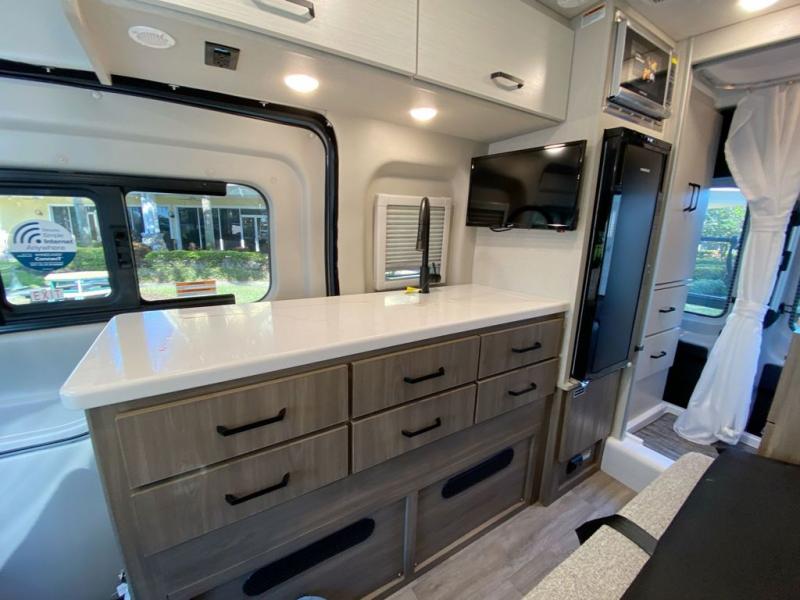 Travel to your favorite parts of the country in this motorhome! With a rear wet bath, you won't have to worry about using public facilities and the wardrobe with drawers in it helps to keep your clothes out of the way. The expanding sleeper sofa with swivel table offers versatility for eating delicious meals prepared on the single burner induction portable cooktop, and a comfortable place to sleep on at night once converted. The 22" TV on swivel makes it easy to view your favorite show from many different angles. Rinse off your feet with the exterior sprayer before entering inside the unit!