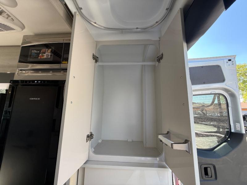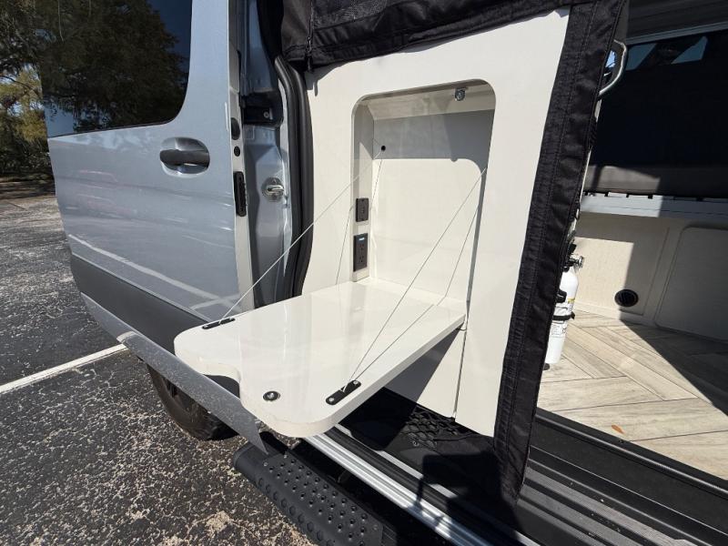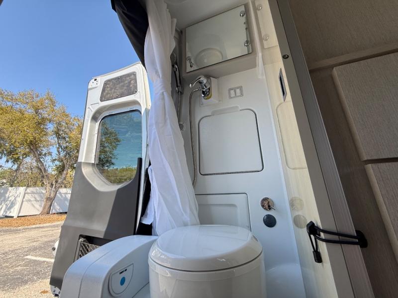 At the rear, the wet bath combines a shower, sink, and swivel toilet into one functional space, maximizing room while still providing essential bathroom convenience. This design keeps the van compact without sacrificing key amenities.