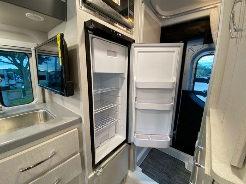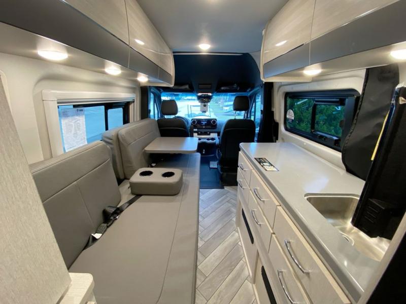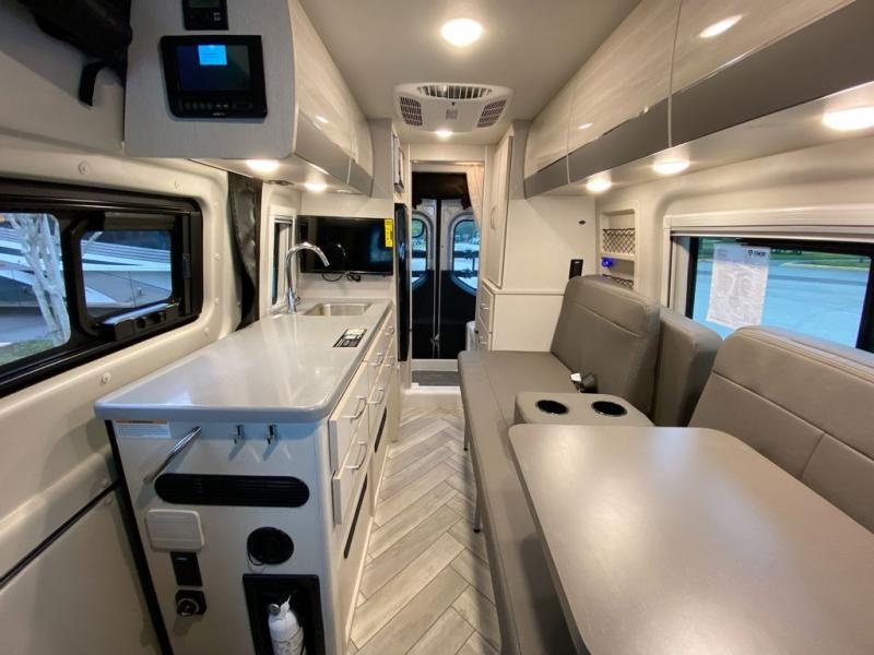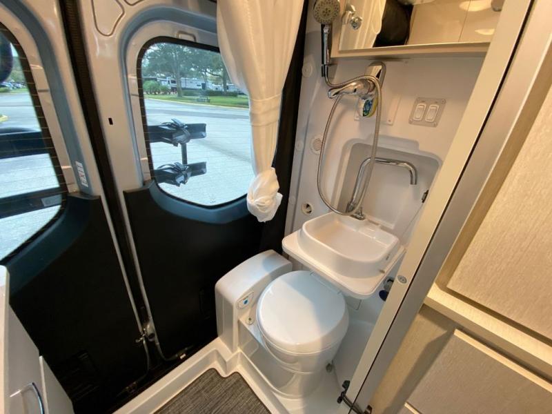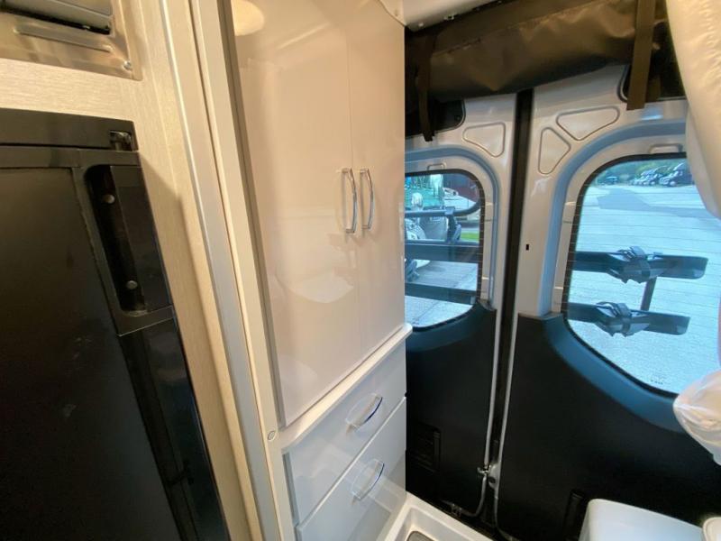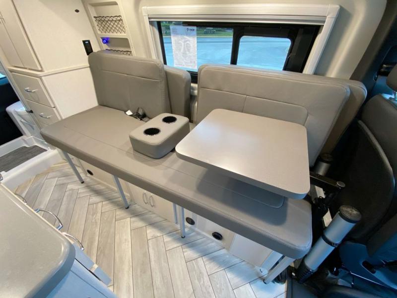 Van life is easier than ever in this Tranquility coach! You'll find all the appliances needed each day to prepare your meals, including a single burner induction cooktop, a microwave oven, plus a 12V electric refrigerator for cold items. You'll appreciate the bath wardrobe and drawers to keep your necessities and towels organized, and there are shelves and drawers in the main cabin for even more storage space. This model includes an expanding sleeper sofa that will provide comfortable seating and sleeping space, and the 22" TV on swivel means you can watch your favorite shows as you dine together.
