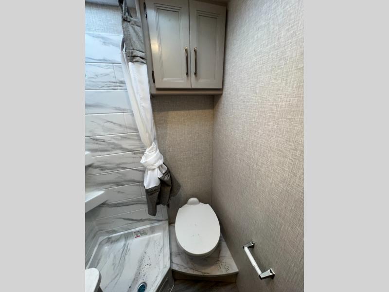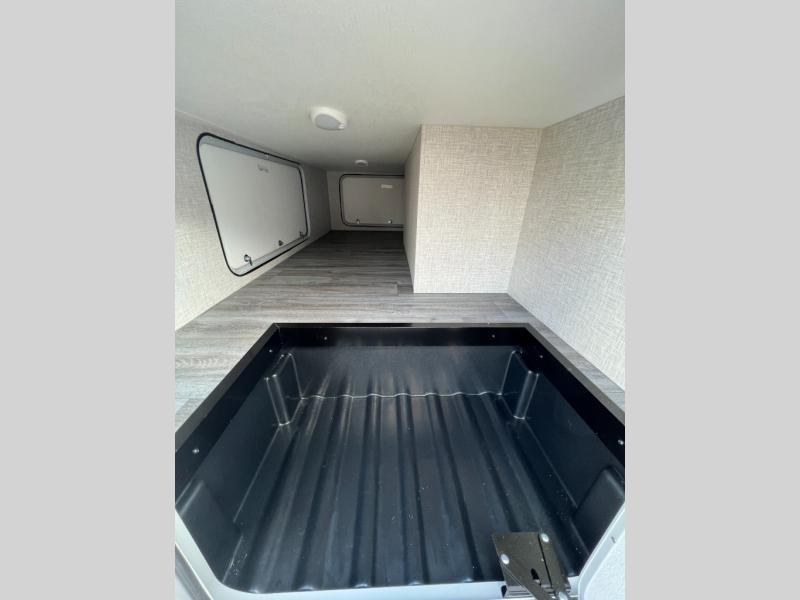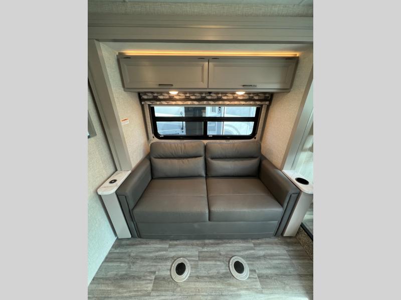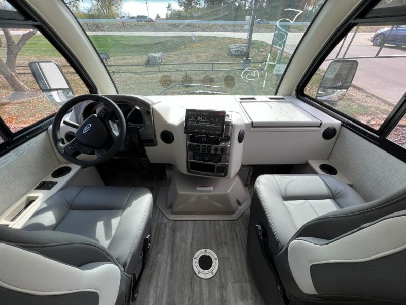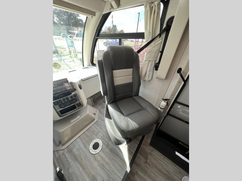 The front cab of this Vegas Class A gas motorhome is excellently appointed with a stow-away coffee table, reclining/swivel leatherette captain's chairs, a living area speaker tied to the dash radio, and a 10" touchscreen dash radio with Bluetooth, Android Auto, and Apple CarPlay! A single slide holds the 68" sofa bed so that it isn't in your way as you walk back to the semi-private bedroom. The kitchen offers you a two burner cooktop to sauté veggies, and there are two TVs to provide you with all the entertainment you could need.