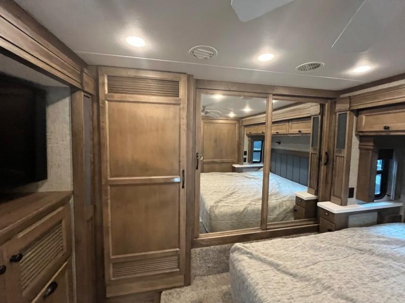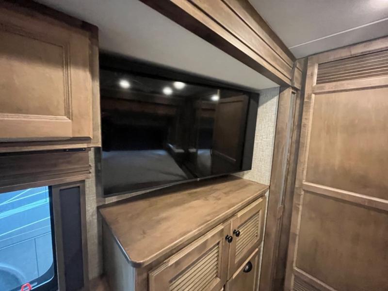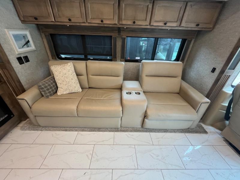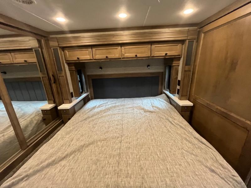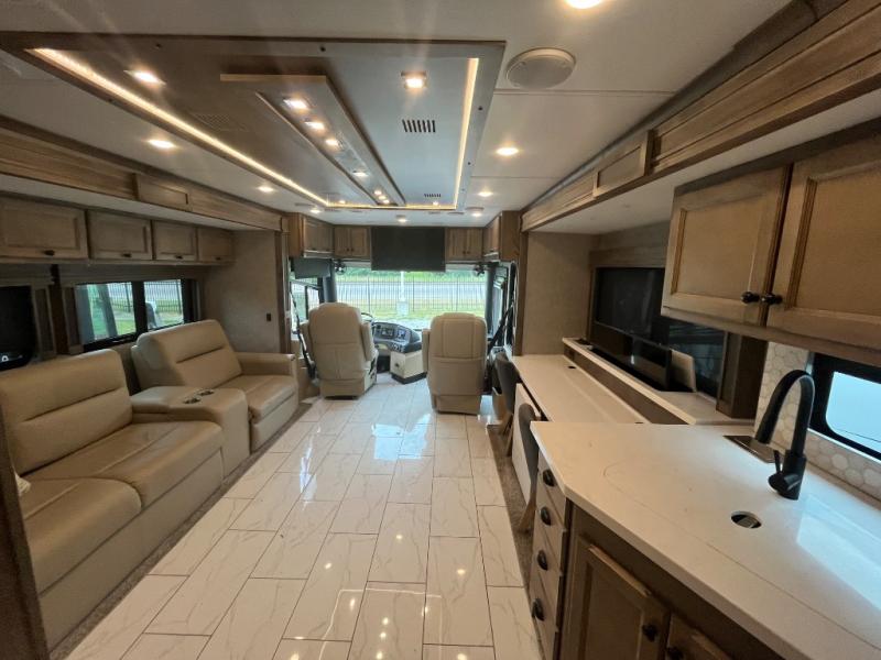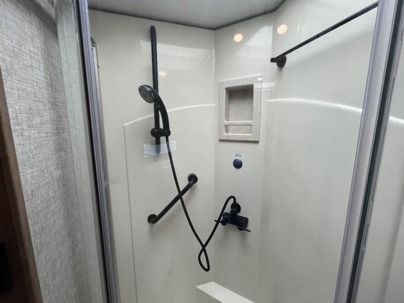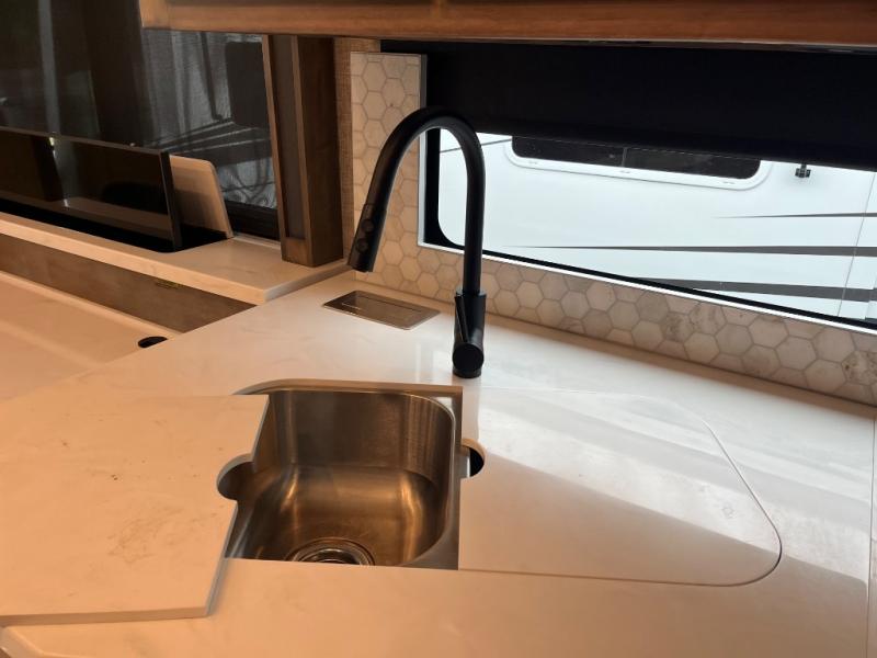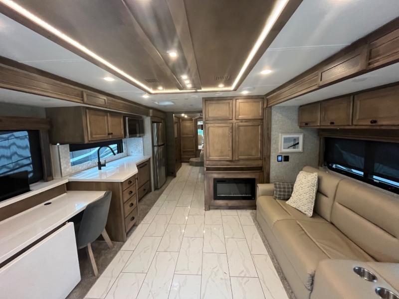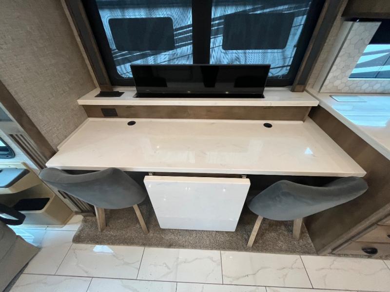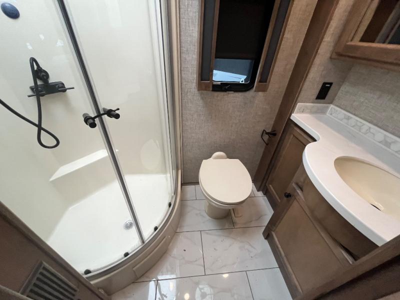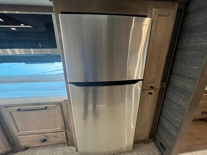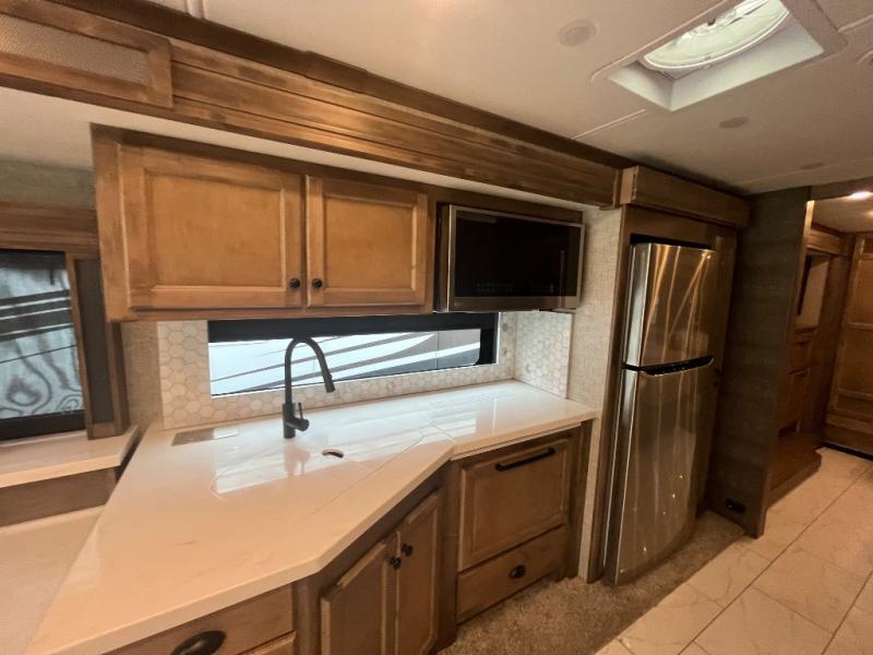 There are many, many reasons you'll instantly fall in love with this Allegro RED Class A diesel motorhome! You have three TVs including an exterior one to keep everyone entertained, and the kitchen is filled with tons of tools to create delicious meals, like a 1.7 cu. ft. smart convection microwave with air fry, 20 cu. ft. stainless steel residential refrigerator with top freezer, pantry, double-bowl sink, and panoramic galley window. You'll also be quite impressed with the full bathroom that has a one-piece fiberglass shower, roof vent fan, solid-surface vanity top, and a skylight and LED light in the shower. If you need more sleeping space in addition to the 72" x 80" king bed, air coil sofa bed, a booth dinette sleeper which you could switch out for three different seating choices like an optional dinette computer workstation, and you can add the optional drop-down bunk above the cab.