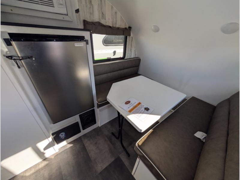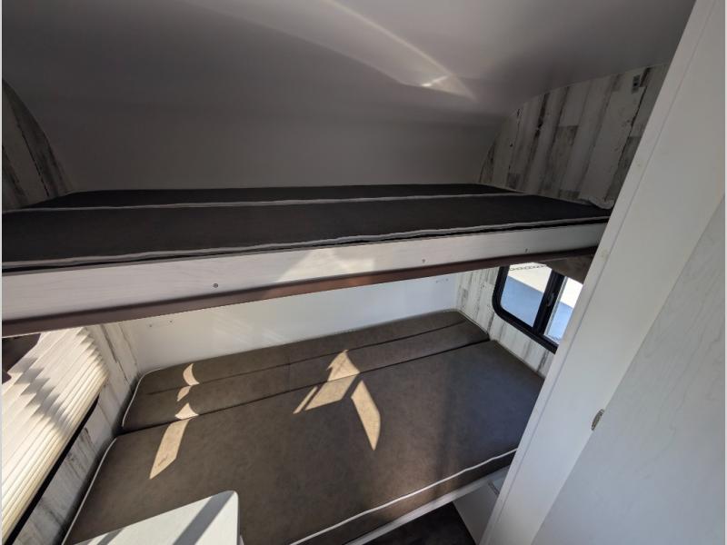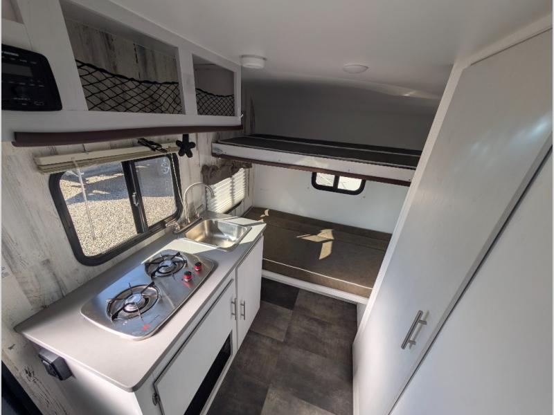 This travel trailer is ready for an adventure whenever you are! You can prepare home cooked meals using the two-burner cooktop, 3.3 cu. ft. 12V refrigerator, and single bowl stainless steel sink, then enjoy them at the front booth dinette which can transform into a 54" x 74" bed. Grab a snack from the kitchen pantry and relax on the rear sofa with overhead cabinets and a bunk bed above it, plus it can also transform into a 36" x 74" bed for sleeping too. With a wet bath, you can rinse the sand out of your hair after a fun day at the beach and the fantastic vent will eliminate any unwanted steam!