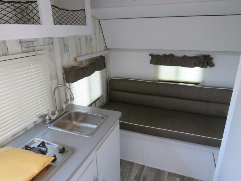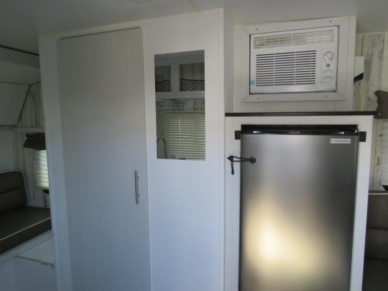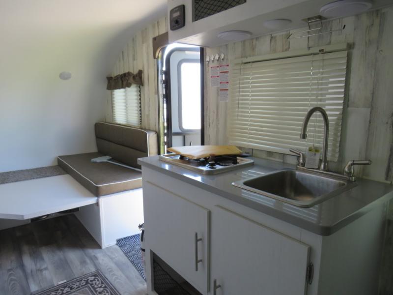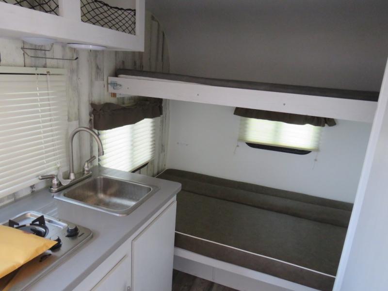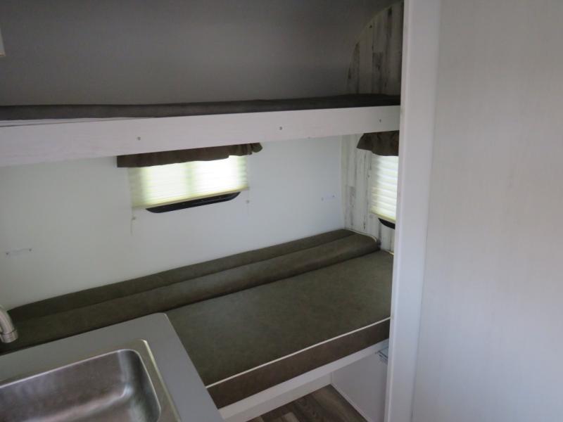 This travel trailer is ready for an adventure whenever you are! You can prepare home cooked meals using the two-burner cooktop, 3.3 cu. ft. 12V refrigerator, and single bowl stainless steel sink, then enjoy them at the front booth dinette which can transform into a 54" x 74" bed. Grab a snack from the kitchen pantry and relax on the rear sofa with overhead cabinets and a bunk bed above it, plus it can also transform into a 36" x 74" bed for sleeping too. With a wet bath, you can rinse the sand out of your hair after a fun day at the beach and the fantastic vent will eliminate any unwanted steam!