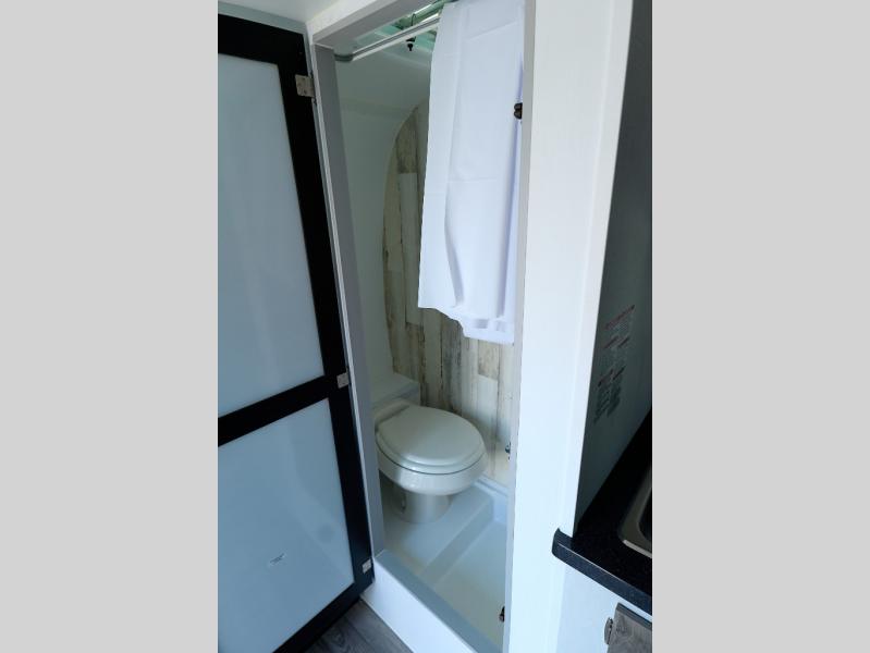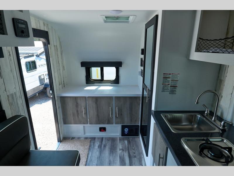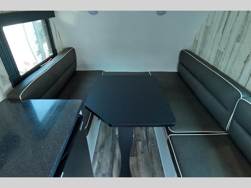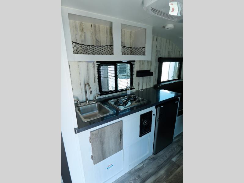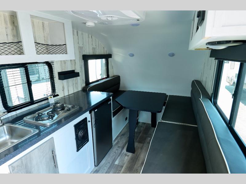 You will have everything you need for a comfortable camping trip in this travel trailer! It features a front booth dinette that transforms into a 54" x 74" bed to sleep on at night. There is storage throughout the inside for your camping necessities between the overhead cabinets and the base cabinet. The fully equipped kitchen has a 3.3 cu. ft. 12V refrigerator below a solid surface countertop, and a two-burner cooktop, and a single bowl stainless steel sink for easy clean up. Rinse off each night in the rear corner wet bath after a day outdoors!