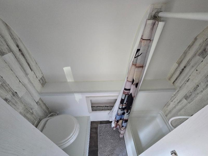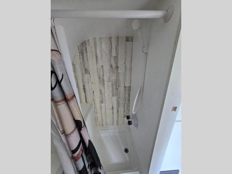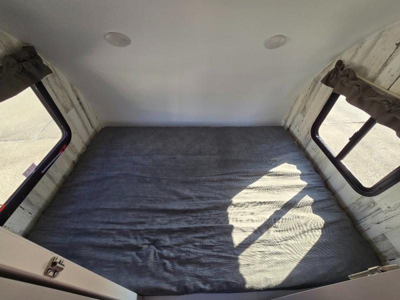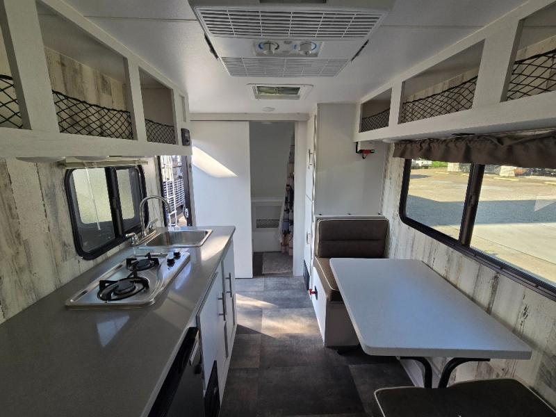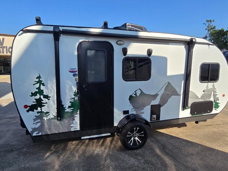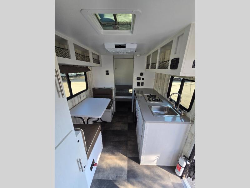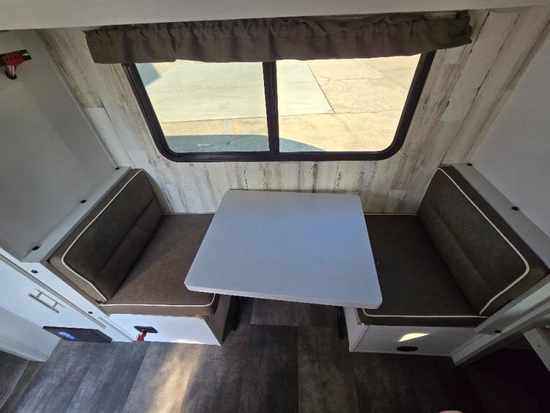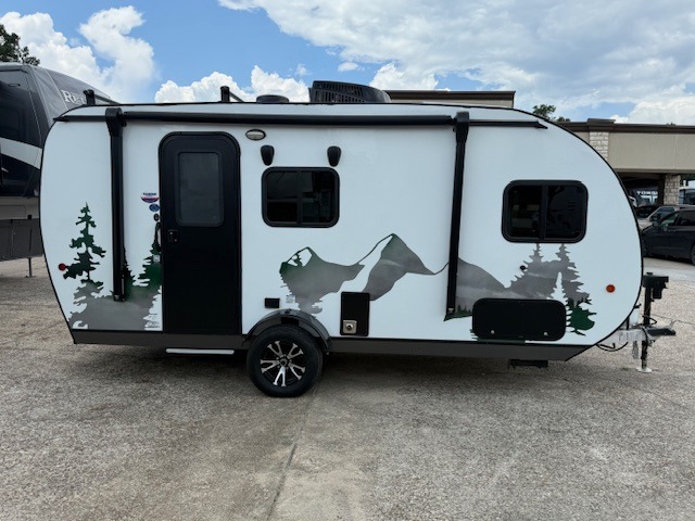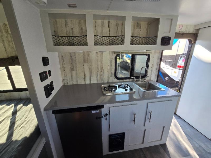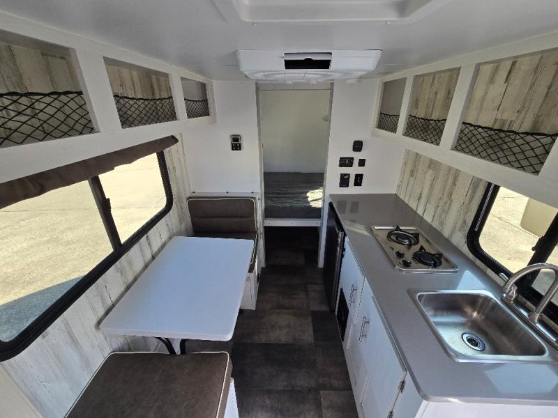 The perfect couples travel trailer for those wanting to upgrade from tent camping and with the optional off-road package you can venture a little off the beaten path if you like with 15" tires and a raised suspension. This unit features a roomy and convenient rear bath. Just inside the entry door, you will find a sliding space saving barn door into a bathroom featuring a 24" x 25" shower with shelf, toilet, and storage cubby for towels and toiletries. The kitchen equipment will allow you to cook inside when you don't want to make dinner over a campfire. Here you will find a sink, a two-burner cook-top and a 3.3 cu. ft. 12V refrigerator beneath the counter space and overhead storage for your paper products and non-perishables. A cozy booth dinette allows you dining space, a place to sit and enjoy a game of cards, or your morning cup of coffee. A second sliding barn door in front leads you to the 54" x 75" bed up front that you will appreciate for a great night's rest.