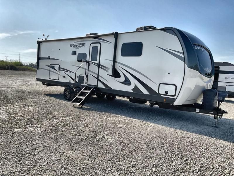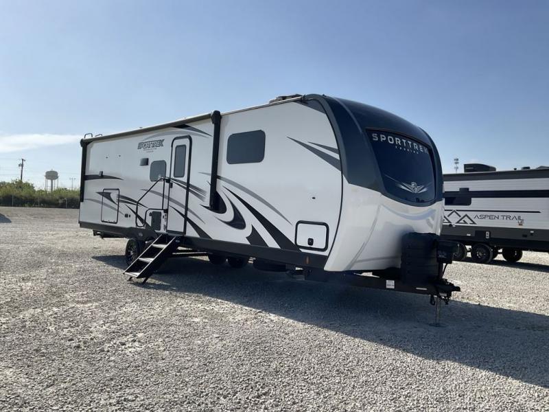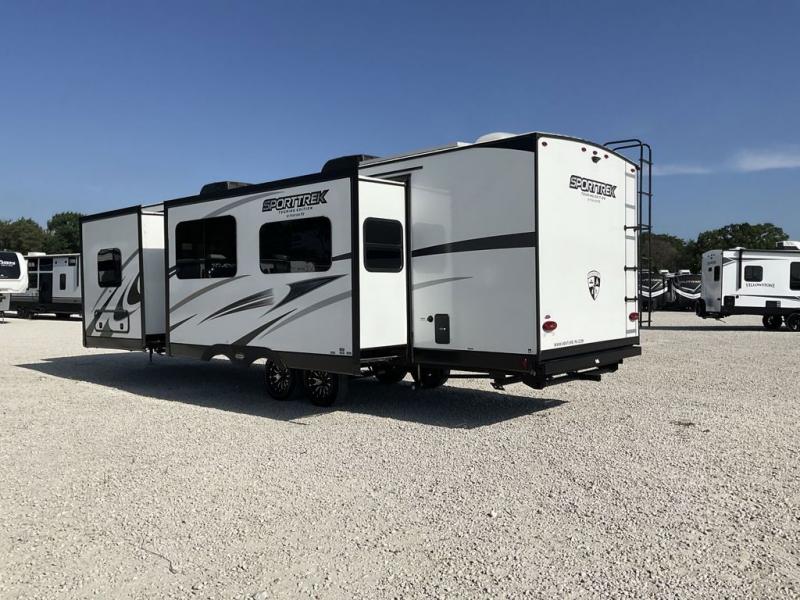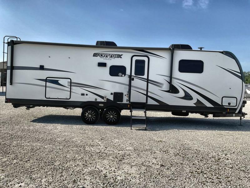 An elegant design and new features come with every one of these Venture RV SportTrek Touring Edition travel trailers! The NXG Huck bolt frame holds these units together and a walkable roof covers them. Heads will turn down the highway and at the campsite with an upgraded graphics package and a painted fiberglass front cap with integrated LED light. The exterior pass-through storage area has slam latch baggage doors with magnetic catches so you don't have to worry about them closing on you and a motion activated light to see your items clearly even at night. Luxury abounds throughout these units, especially with the mandatory Interior Luxury package which comes with solid surface kitchen countertops, designer valances with fabric nightshades, two 30" frameless fireplaces, and Beauflor wood plank flooring that is easy to clean. Come find your favorite model today!